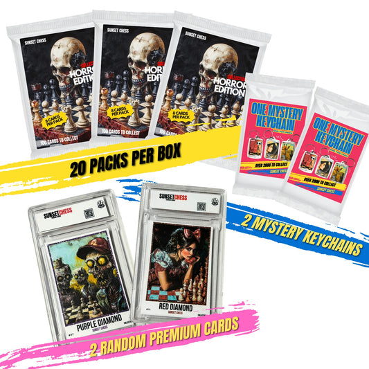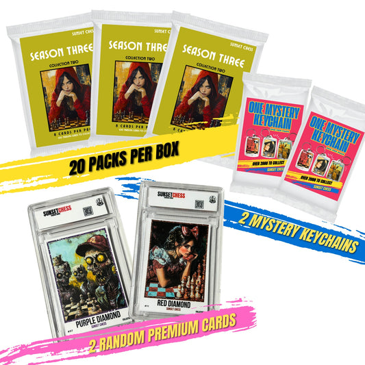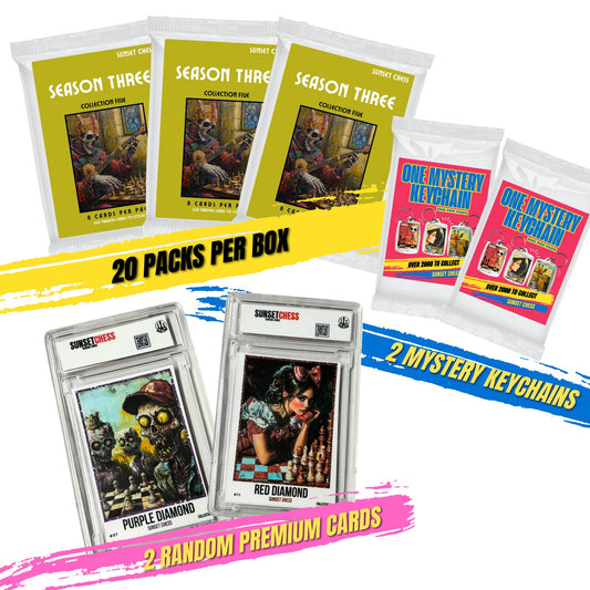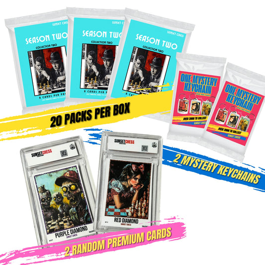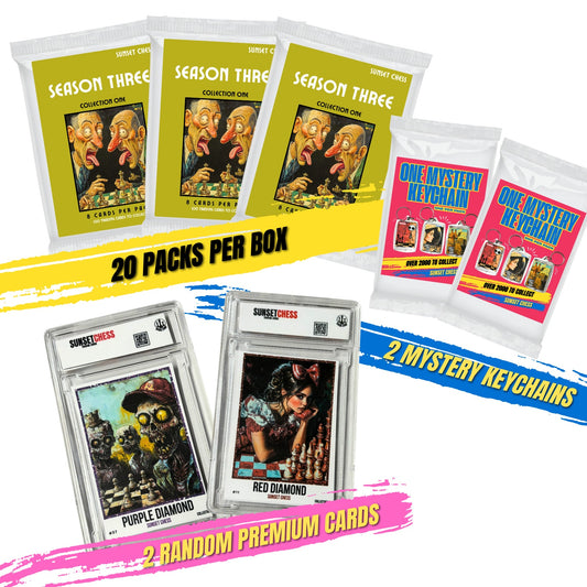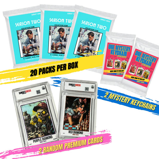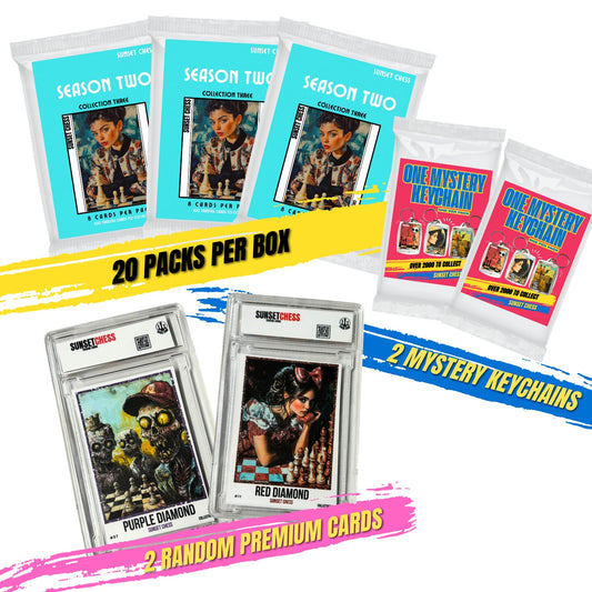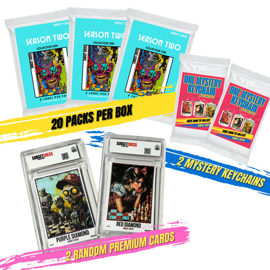 Get your hands on this amazing jumbo box pack of Sunset chess themed trading cards! Perfect for collectors and chess enthusiasts. These packs includes 20 packs, 2 premium cards, and 2 keychain packs