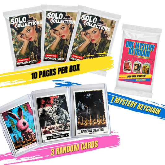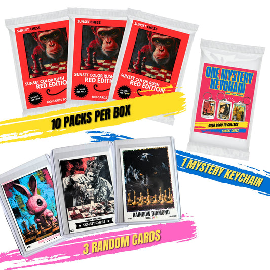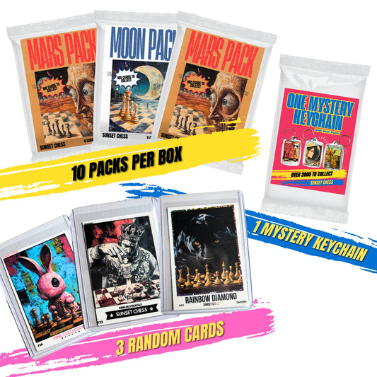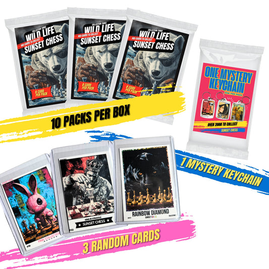 Get your hands on this exciting mini box collection of scrapbook chess-themed trading cards! Each box is packed with goodies for collectors and enthusiasts alike. These mini boxes include 10 Packs, 1 keychain pack, and 3 random cards