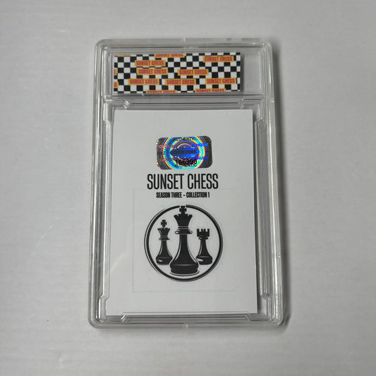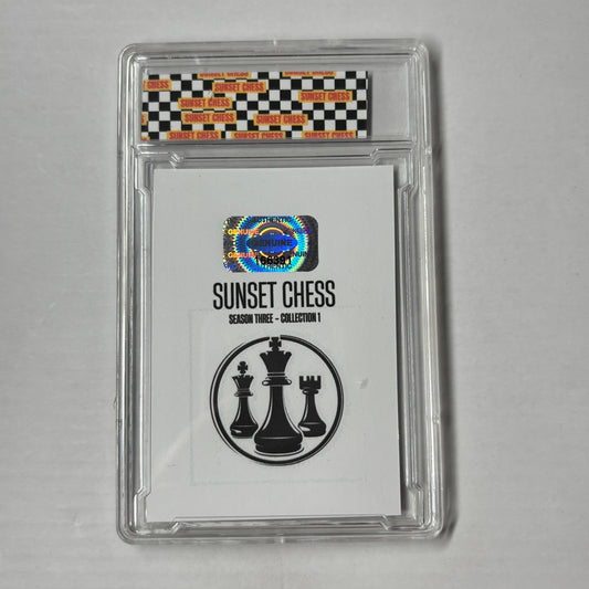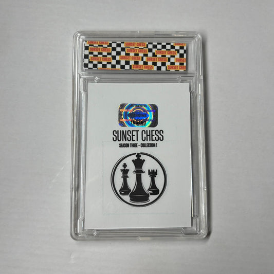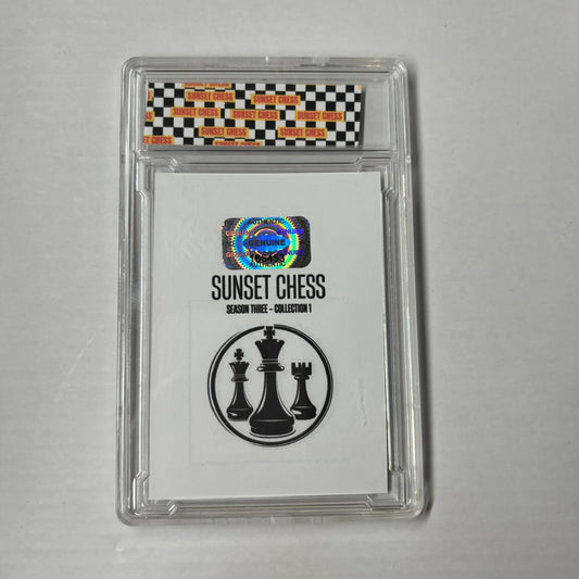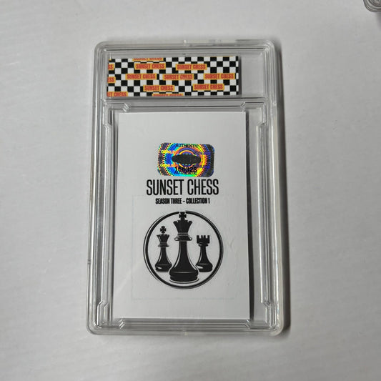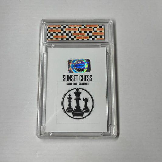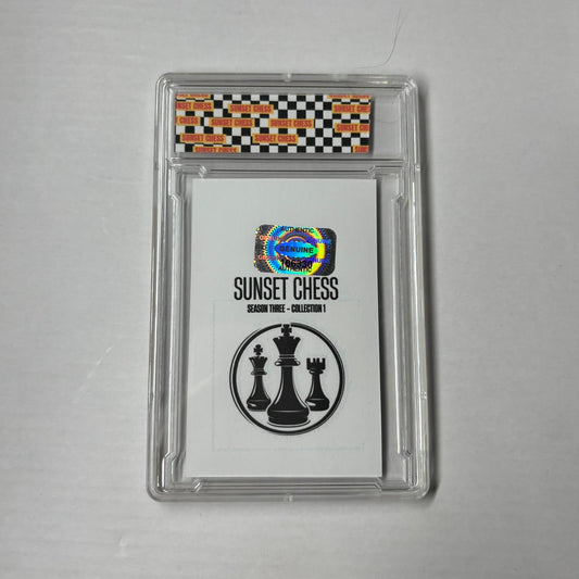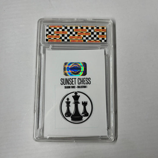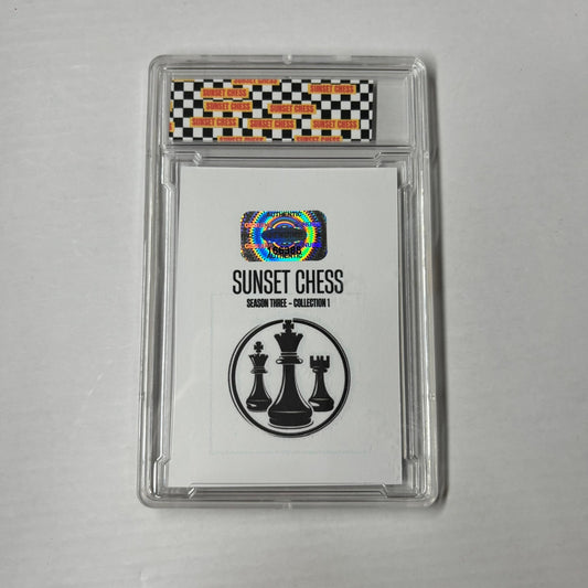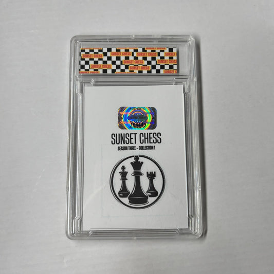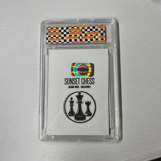 Each card is one of a kind, hand cut, made at home, and comes in a protective acrylic grading case. This card is chess themed, making it a great addition for chess enthusiasts and collectors alike.