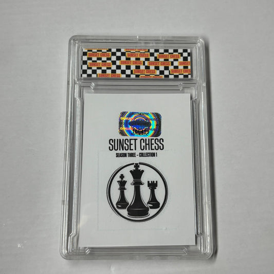 Each card is one of a kind, hand cut, made at home, and comes in a protective acrylic grading case. This card is chess themed, making it a great addition for chess enthusiasts and collectors alike.