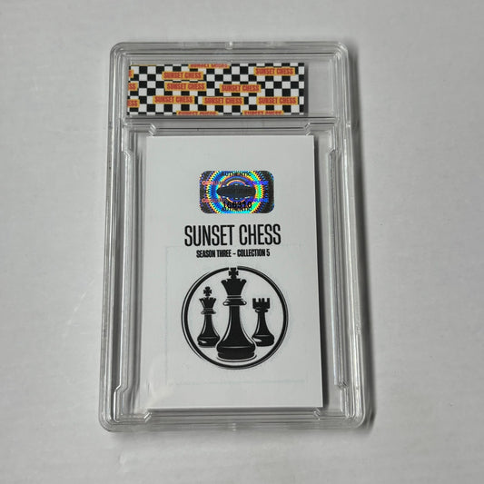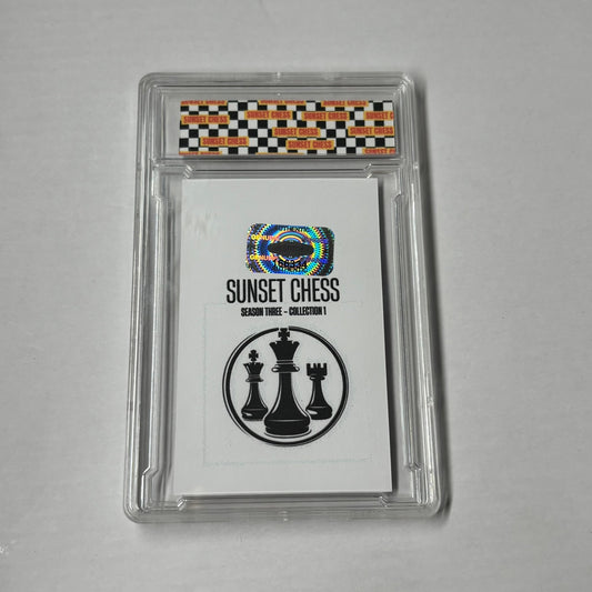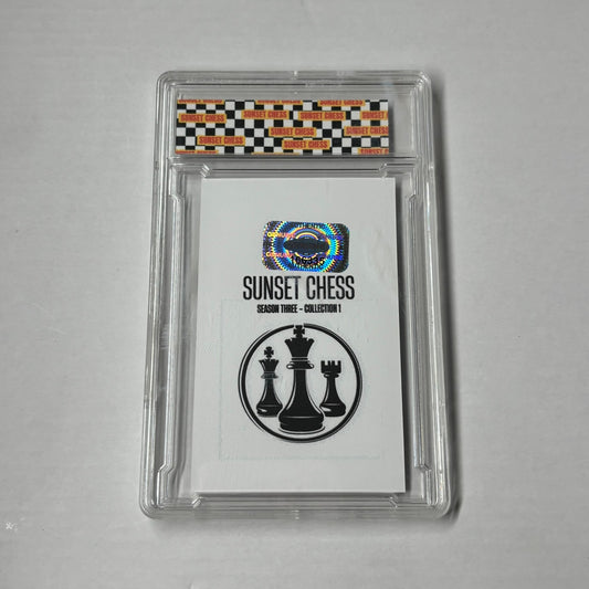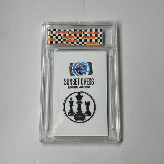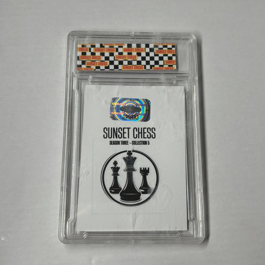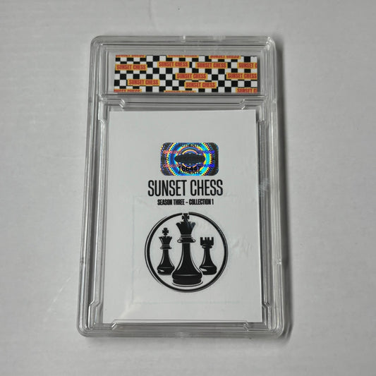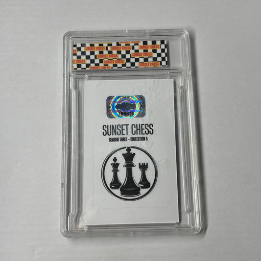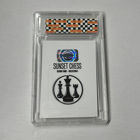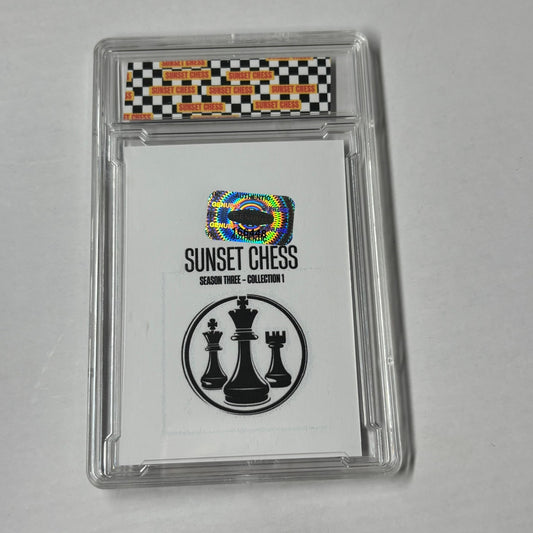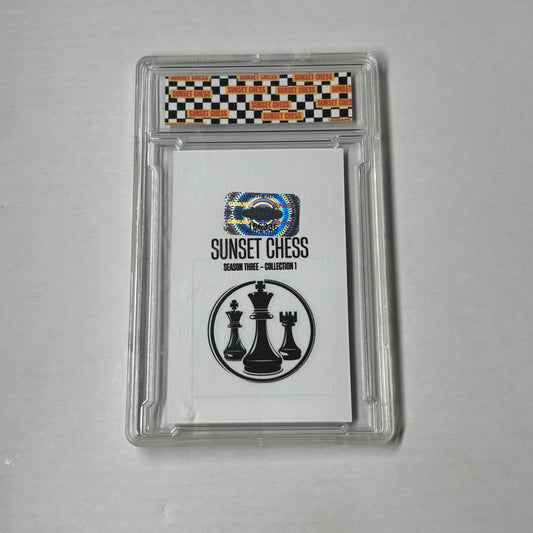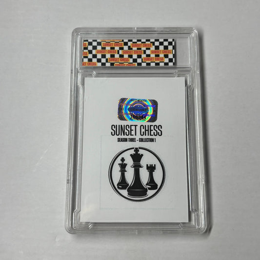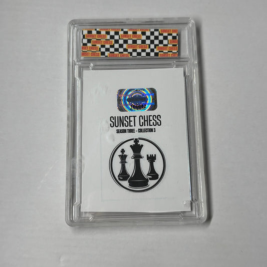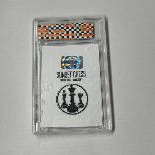 Each card is one of a kind, hand cut, made at home, and comes in a protective acrylic grading case. This card is chess themed, making it a great addition for chess enthusiasts and collectors alike.