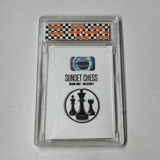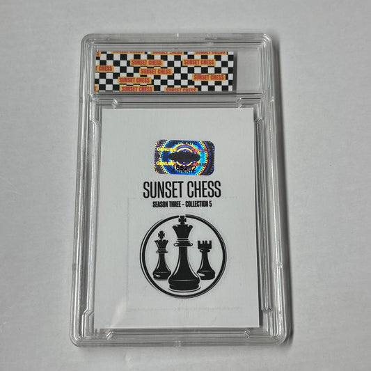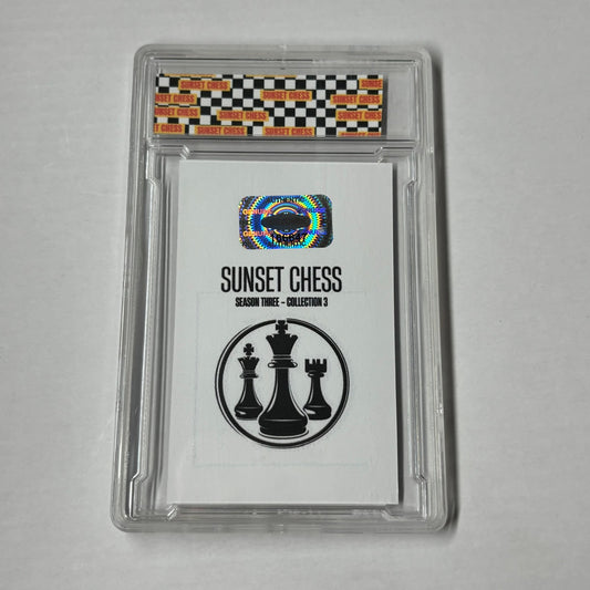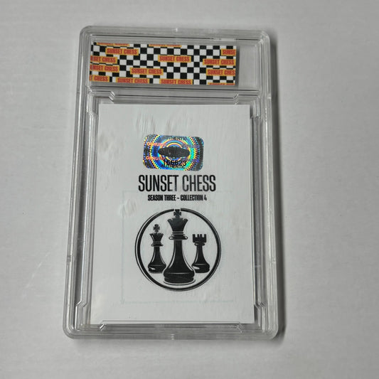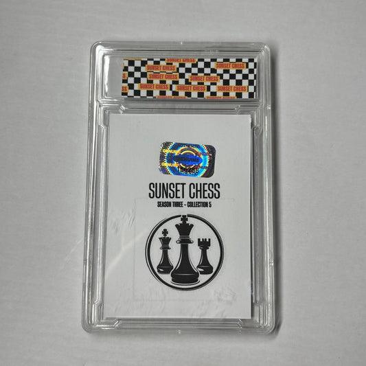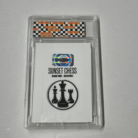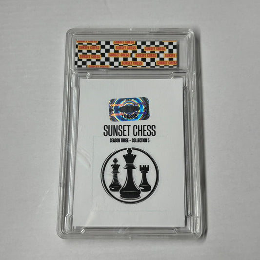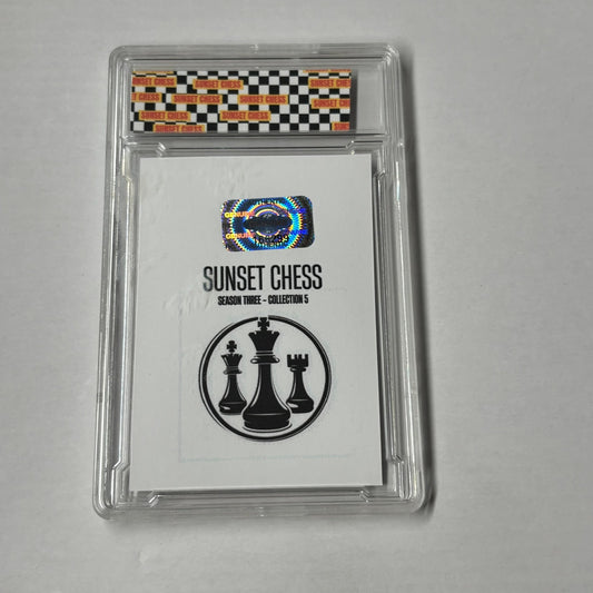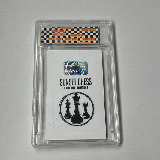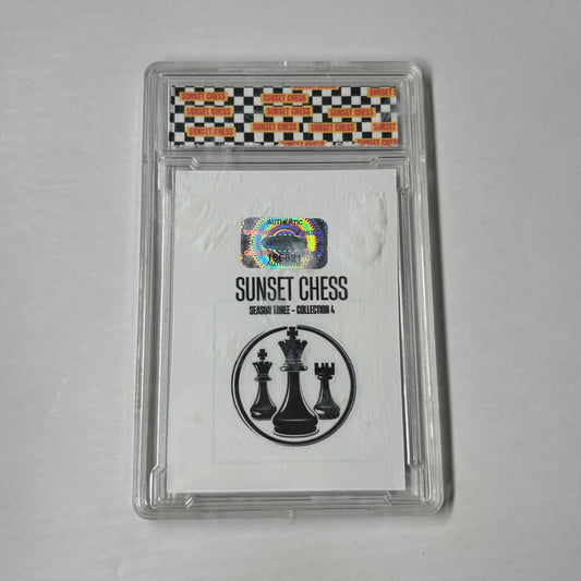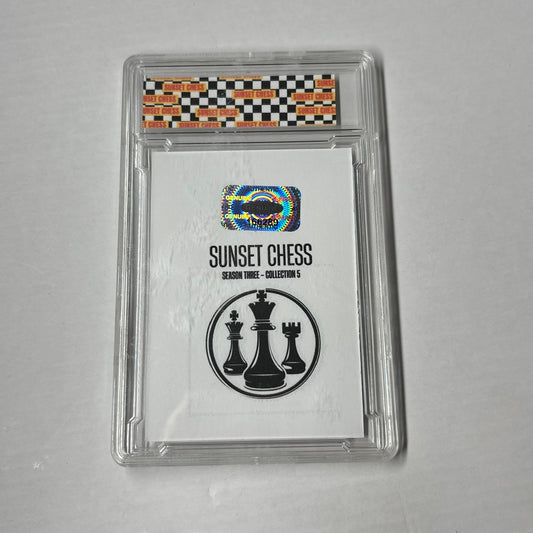 Each card is one of a kind, hand cut, made at home, and comes in a protective acrylic grading case. This card is chess themed, making it a great addition for chess enthusiasts and collectors alike.