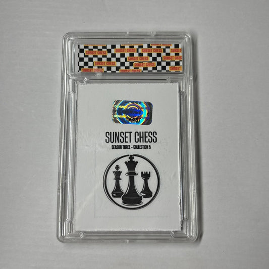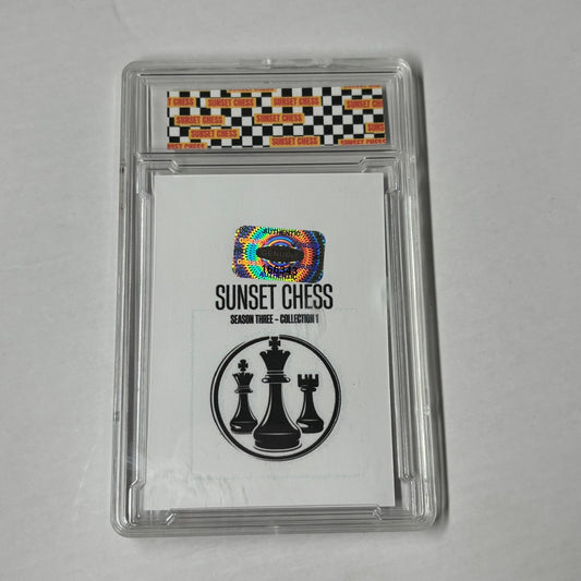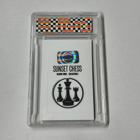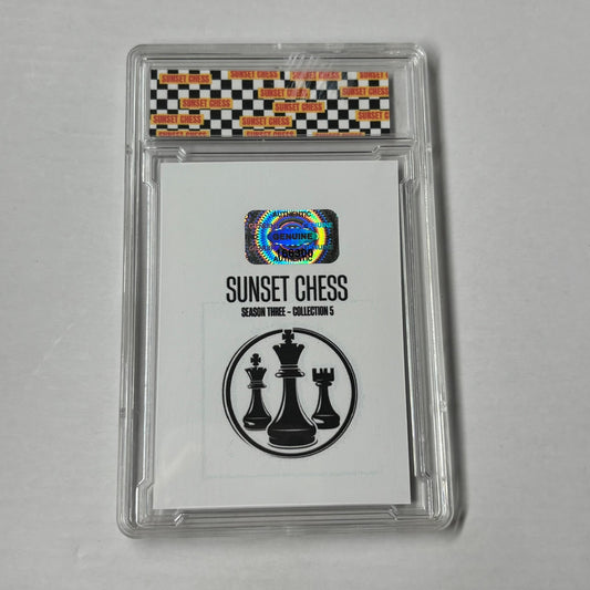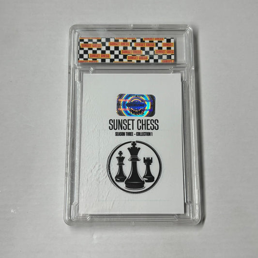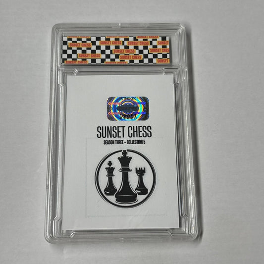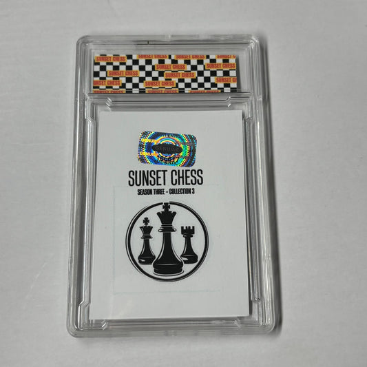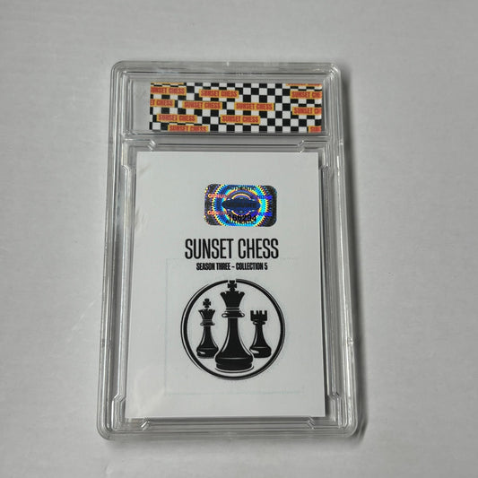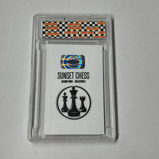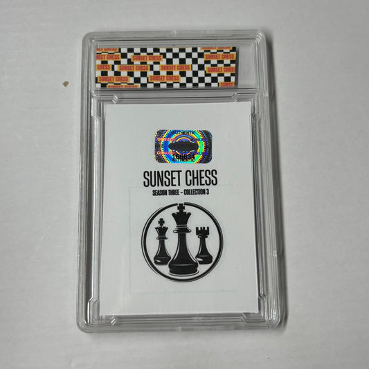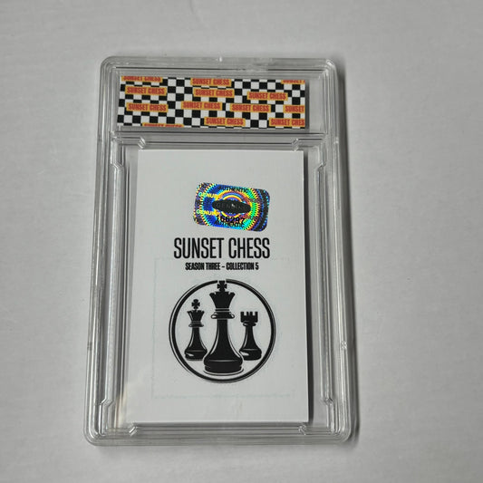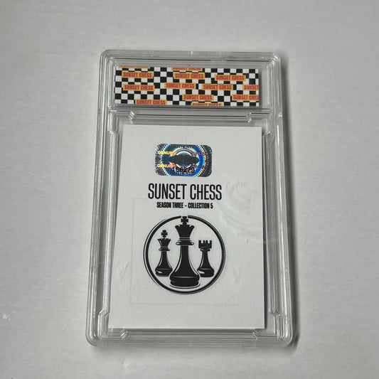 Each card is one of a kind, hand cut, made at home, and comes in a protective acrylic grading case. This card is chess themed, making it a great addition for chess enthusiasts and collectors alike.