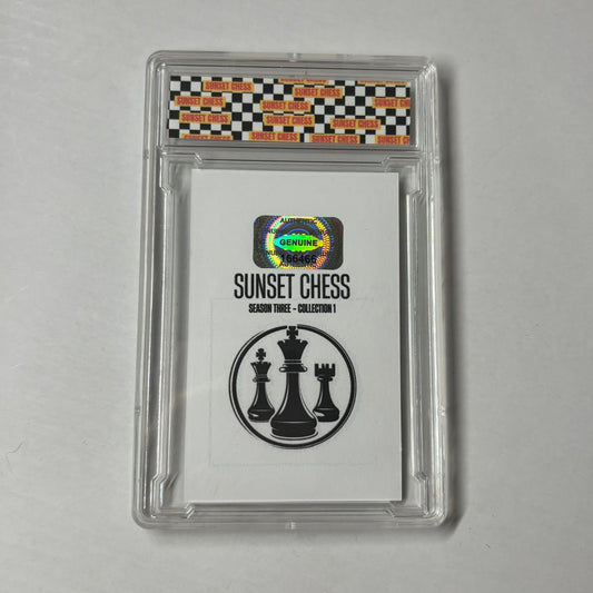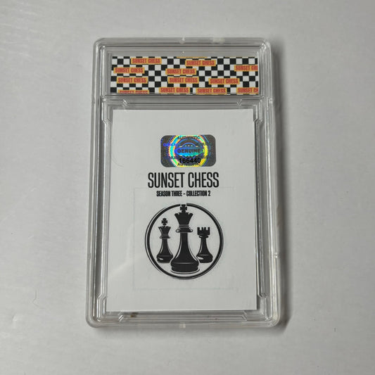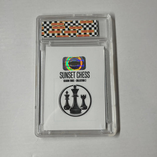 Each card is one of a kind, hand cut, made at home, and comes in a protective acrylic grading case. This card is chess themed, making it a great addition for chess enthusiasts and collectors alike.