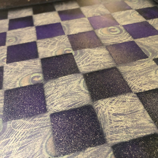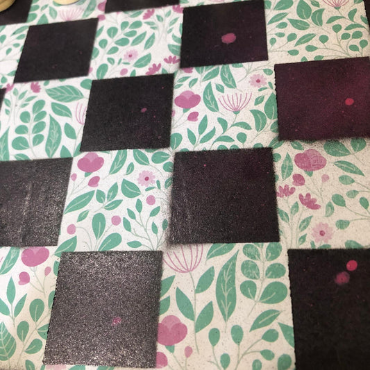 Particle board layered with a sheet of scrapbook paper board that doubles as a work of art. Each set is a unique, one of a kind creation, crafted by hand to ensure that no two sets are alike