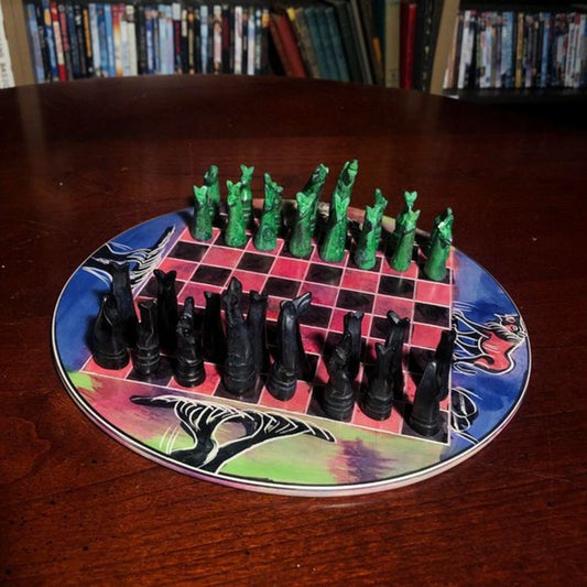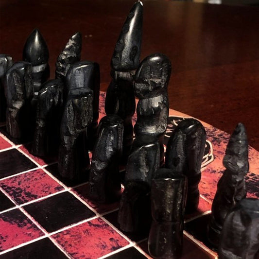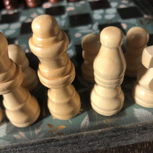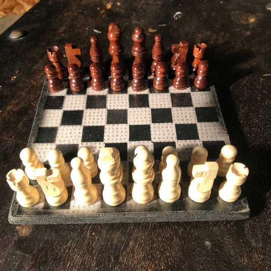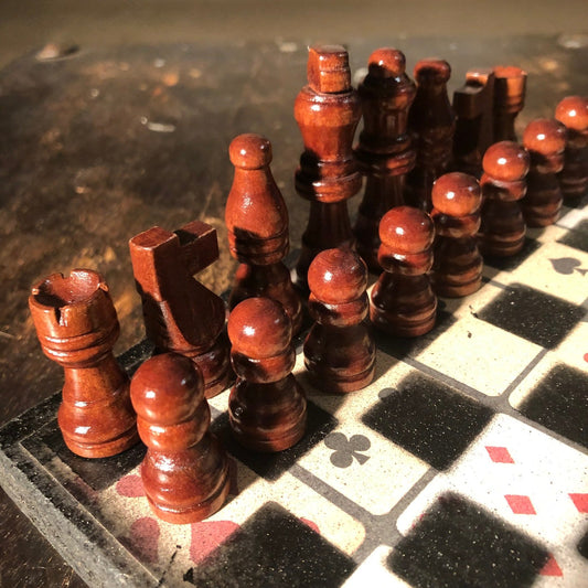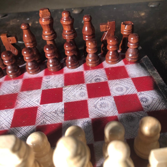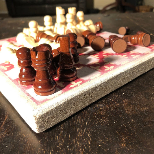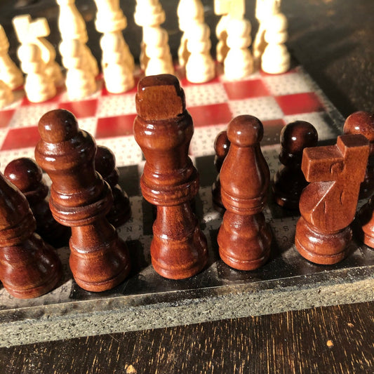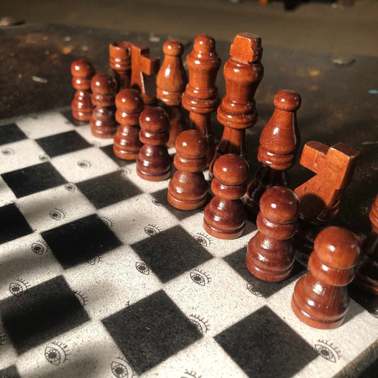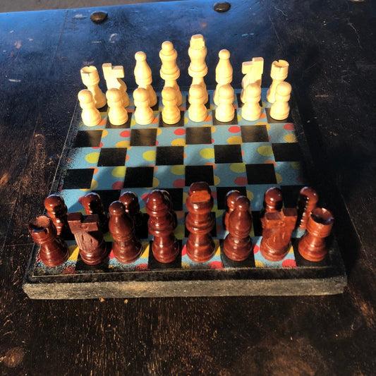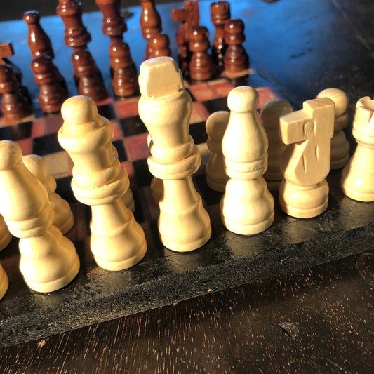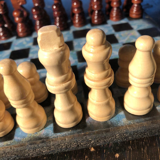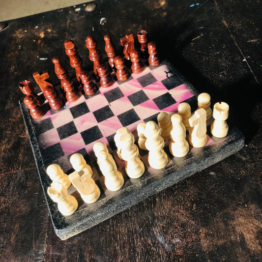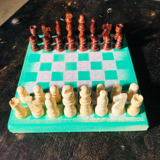 Check out our Small hand made chess sets! Theses chess boards and chess pieces are all single stock and one of ones. These chess sets are close to a 8x8 size and are perfect for traveling or small spaces.