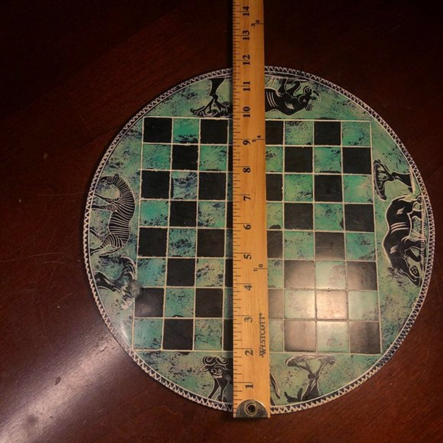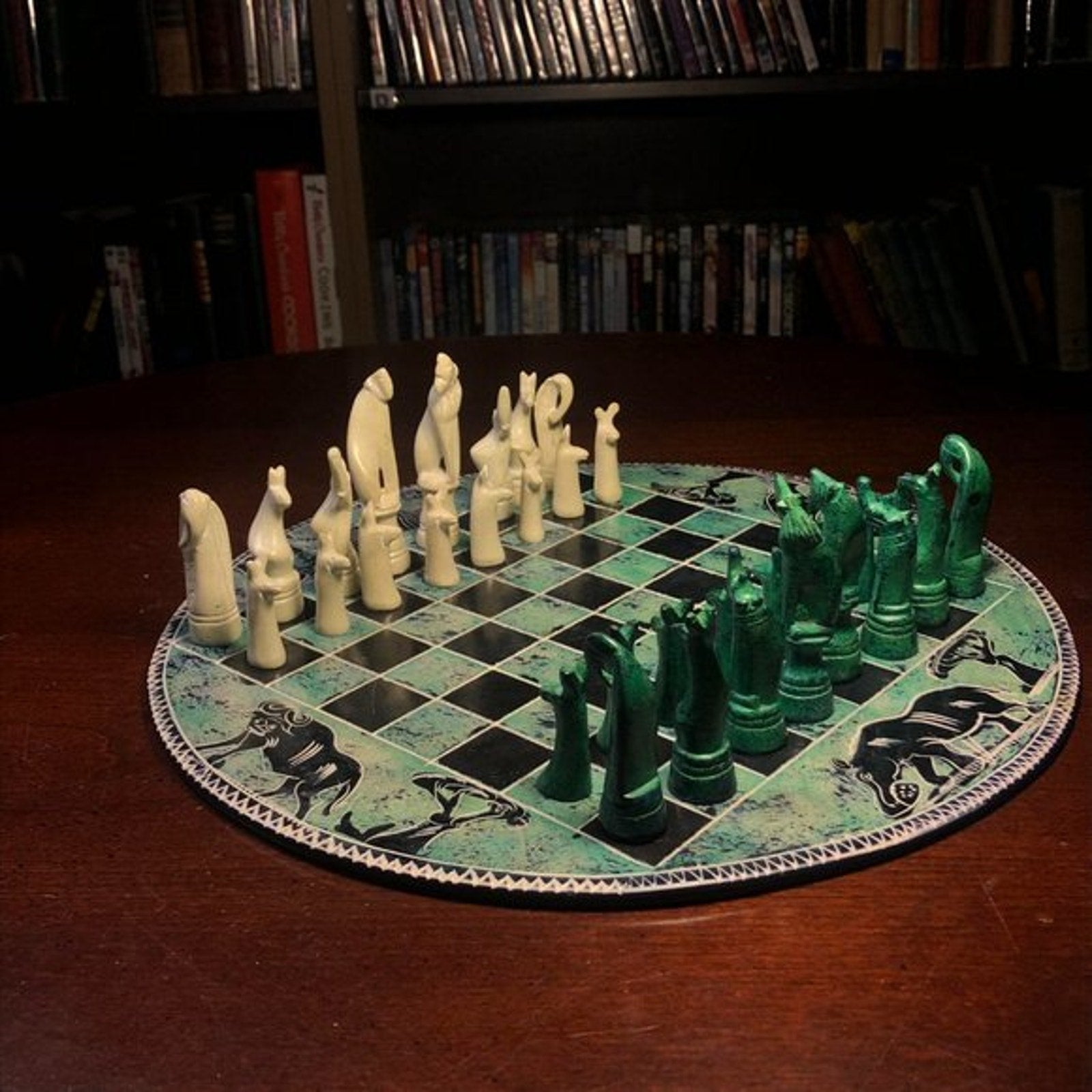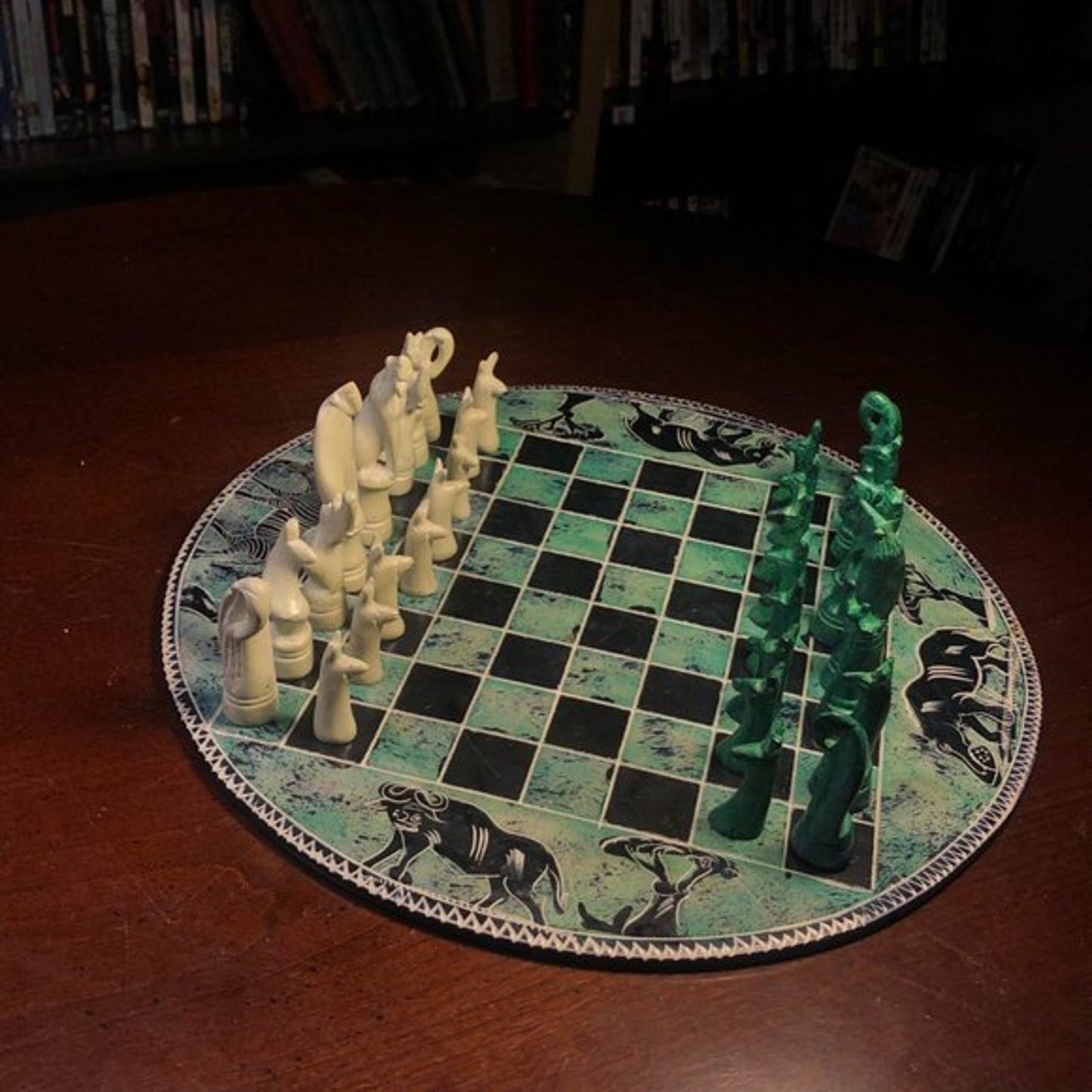 Crafted by African artisans in Western Kenya using traditional techniques, this soapstone chess set will become a conversation piece during play or on display! The board features square inlay pieces of natural painted soapstone. Each safari animal piece is hand carved in soapstone.