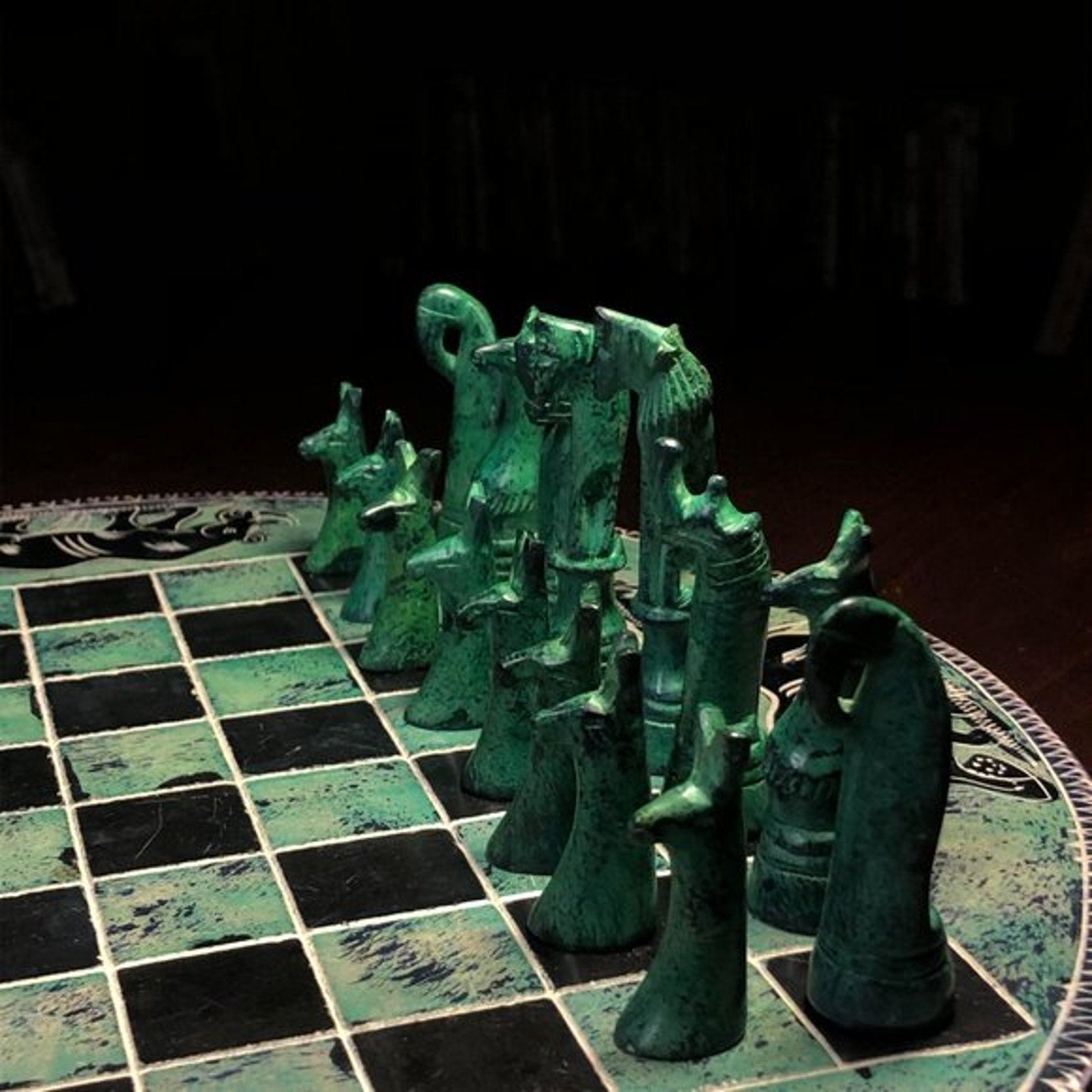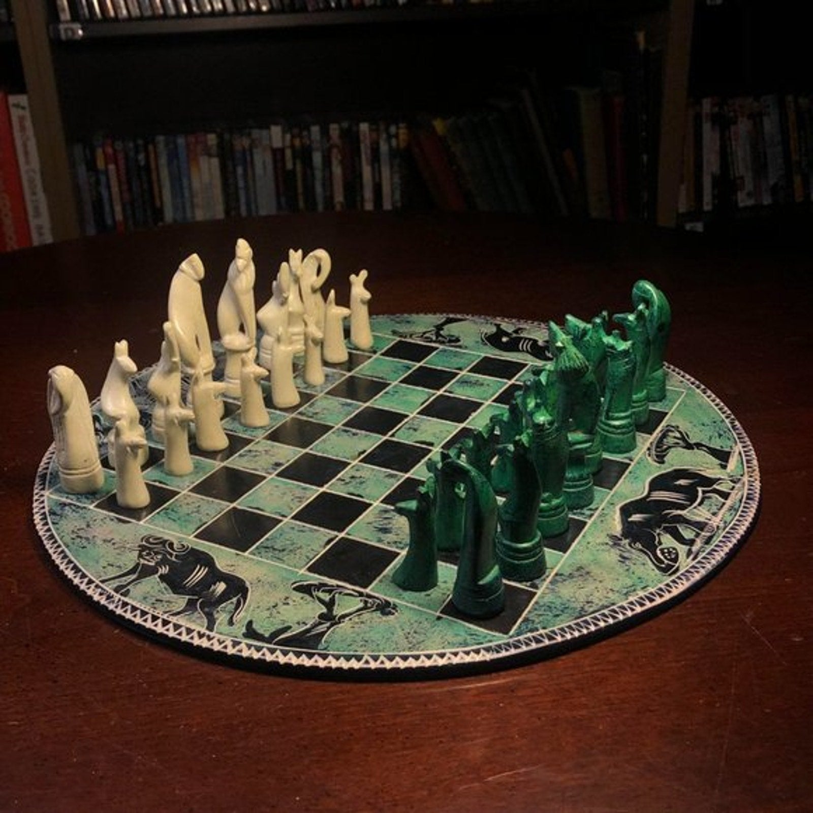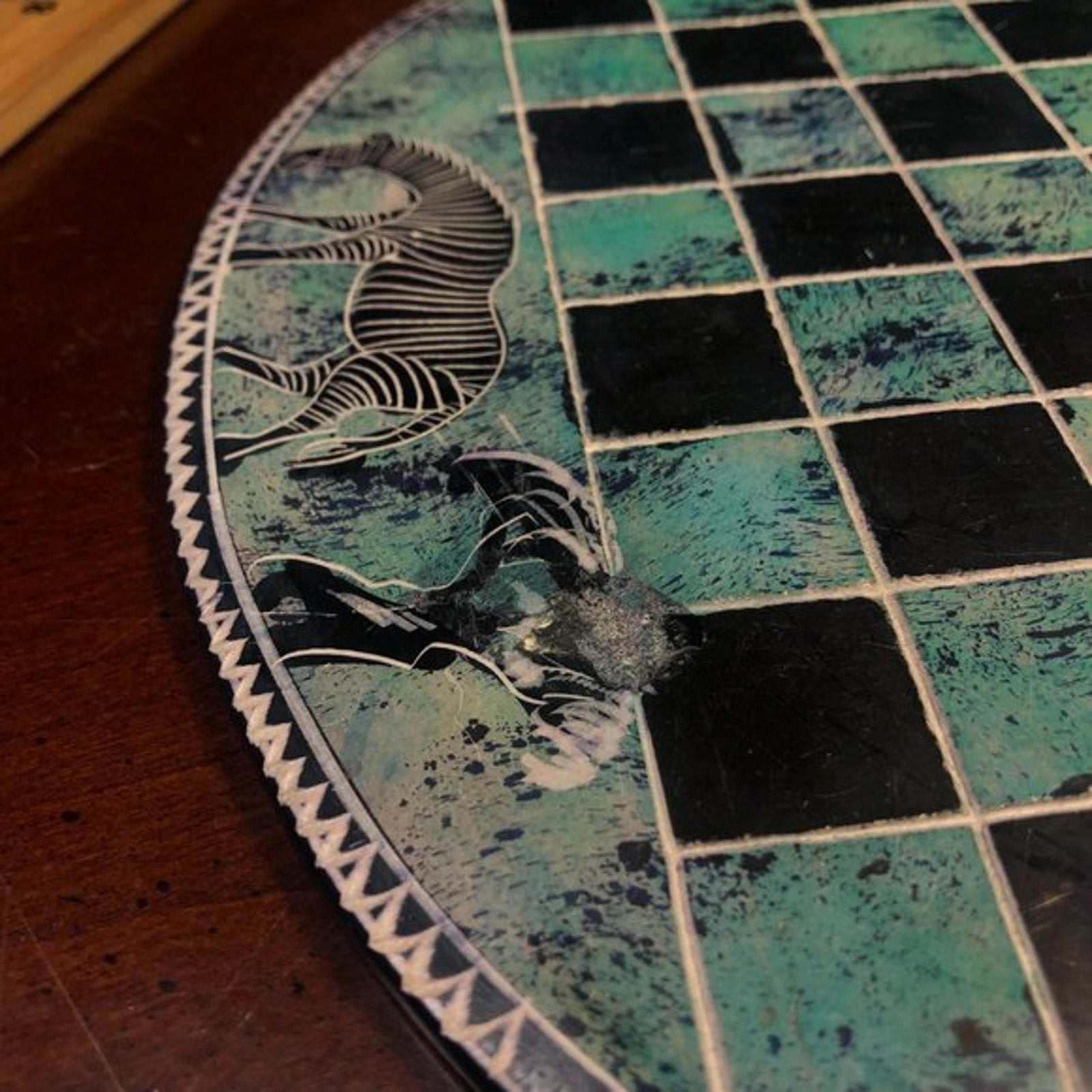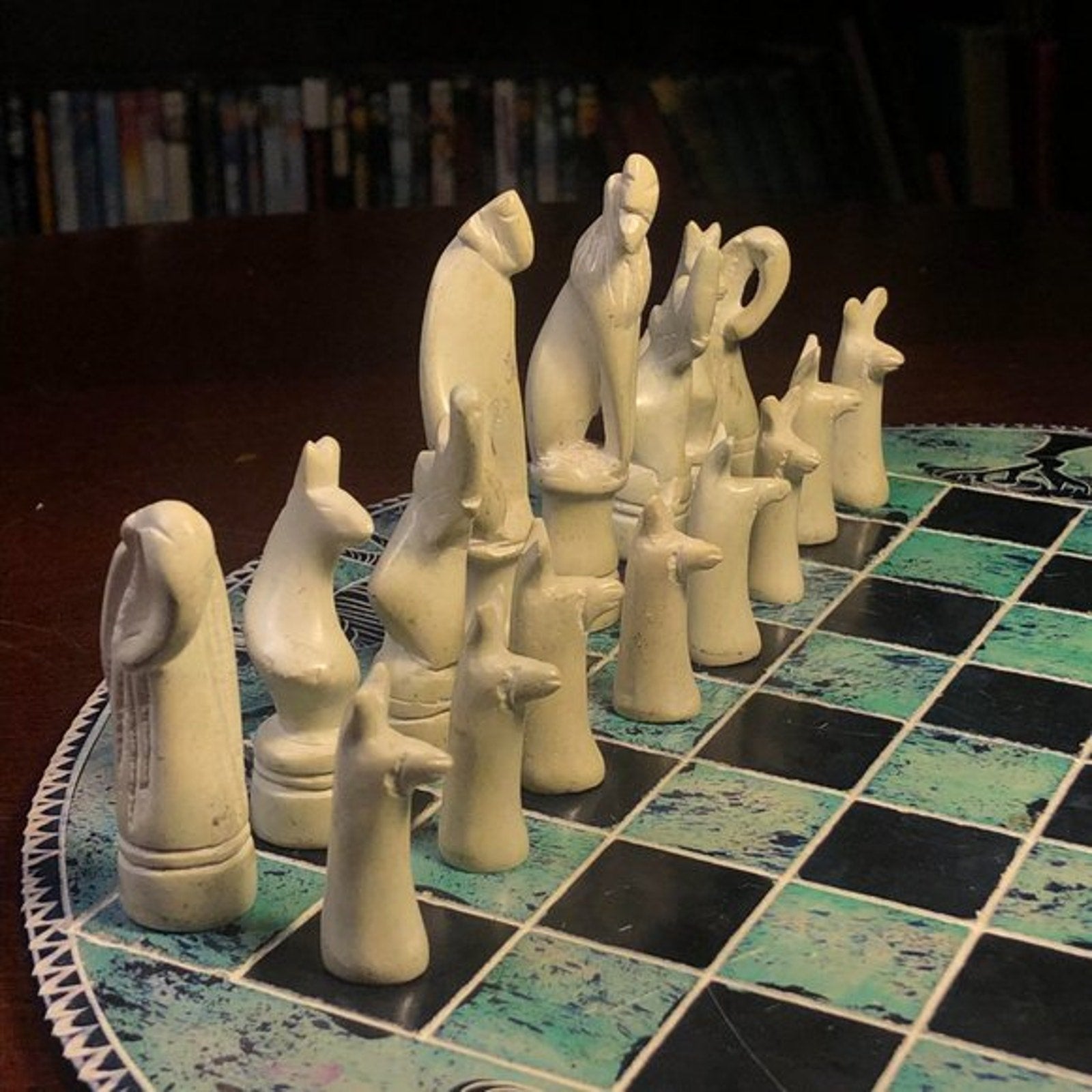 Crafted by African artisans in Western Kenya using traditional techniques, this soapstone chess set will become a conversation piece during play or on display! The board features square inlay pieces of natural painted soapstone. Each safari animal piece is hand carved in soapstone.