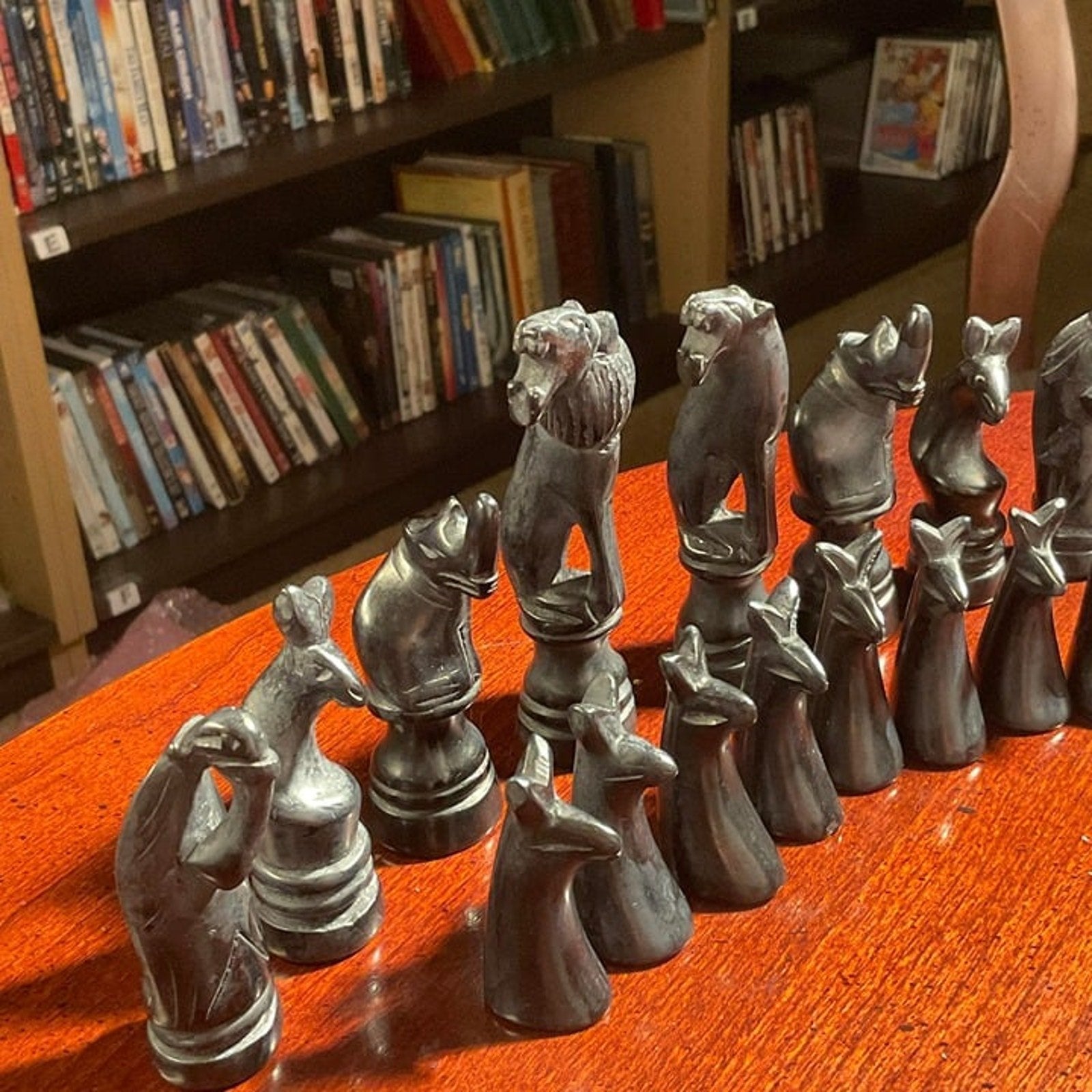 Crafted by African artisans in Western Kenya using traditional techniques, this soapstone chess set will become a conversation piece during play or on display! The board features square inlay pieces of natural painted soapstone. Each safari animal piece is hand carved in soapstone.