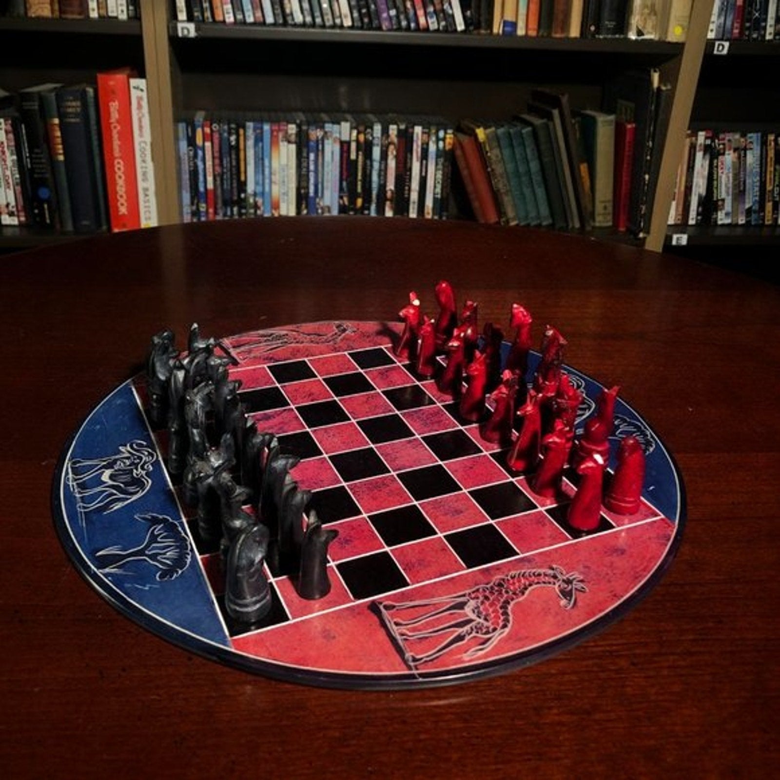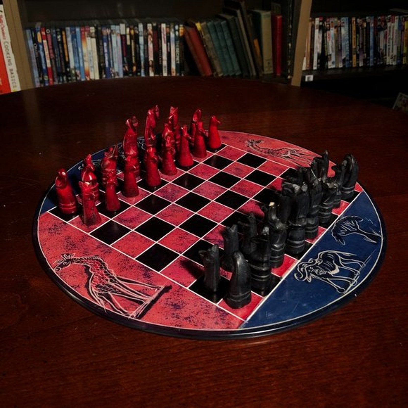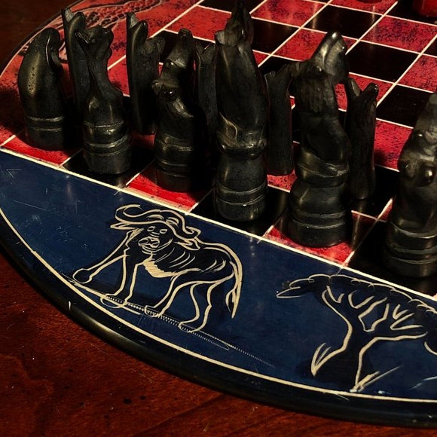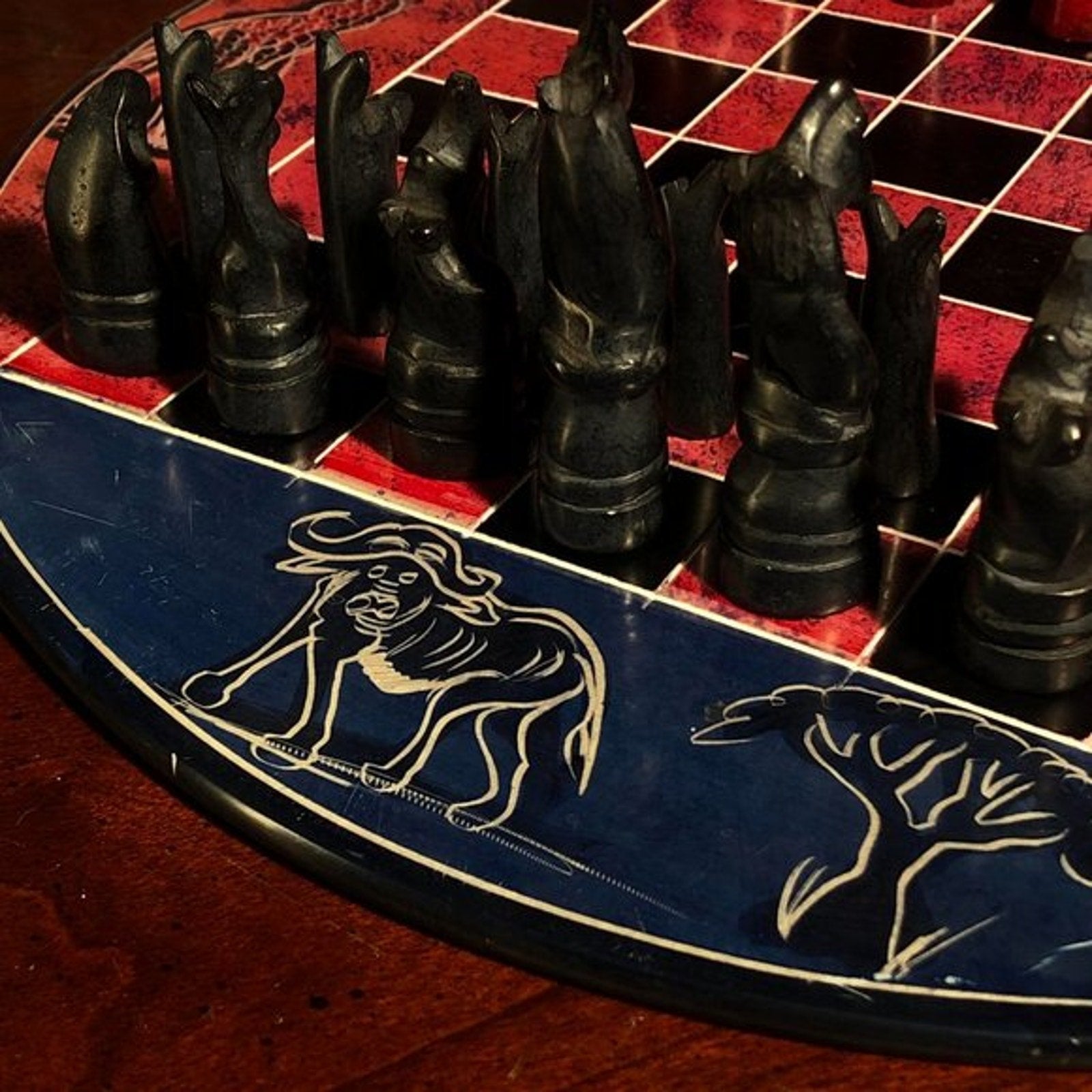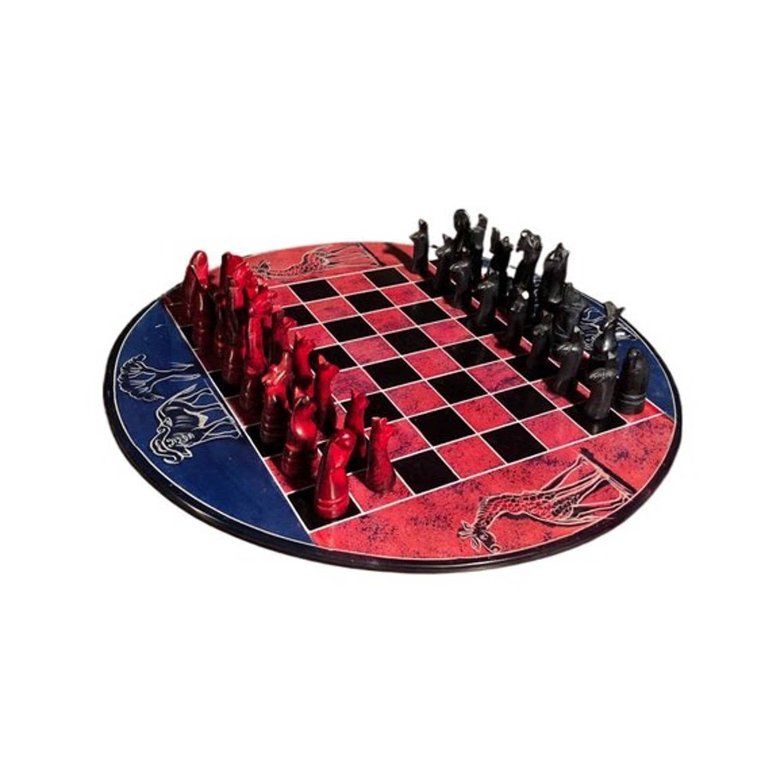Crafted by African artisans in Western Kenya using traditional techniques, this soapstone chess set will become a conversation piece during play or on display! The board features square inlay pieces of natural painted soapstone. Each safari animal piece is hand carved in soapstone.