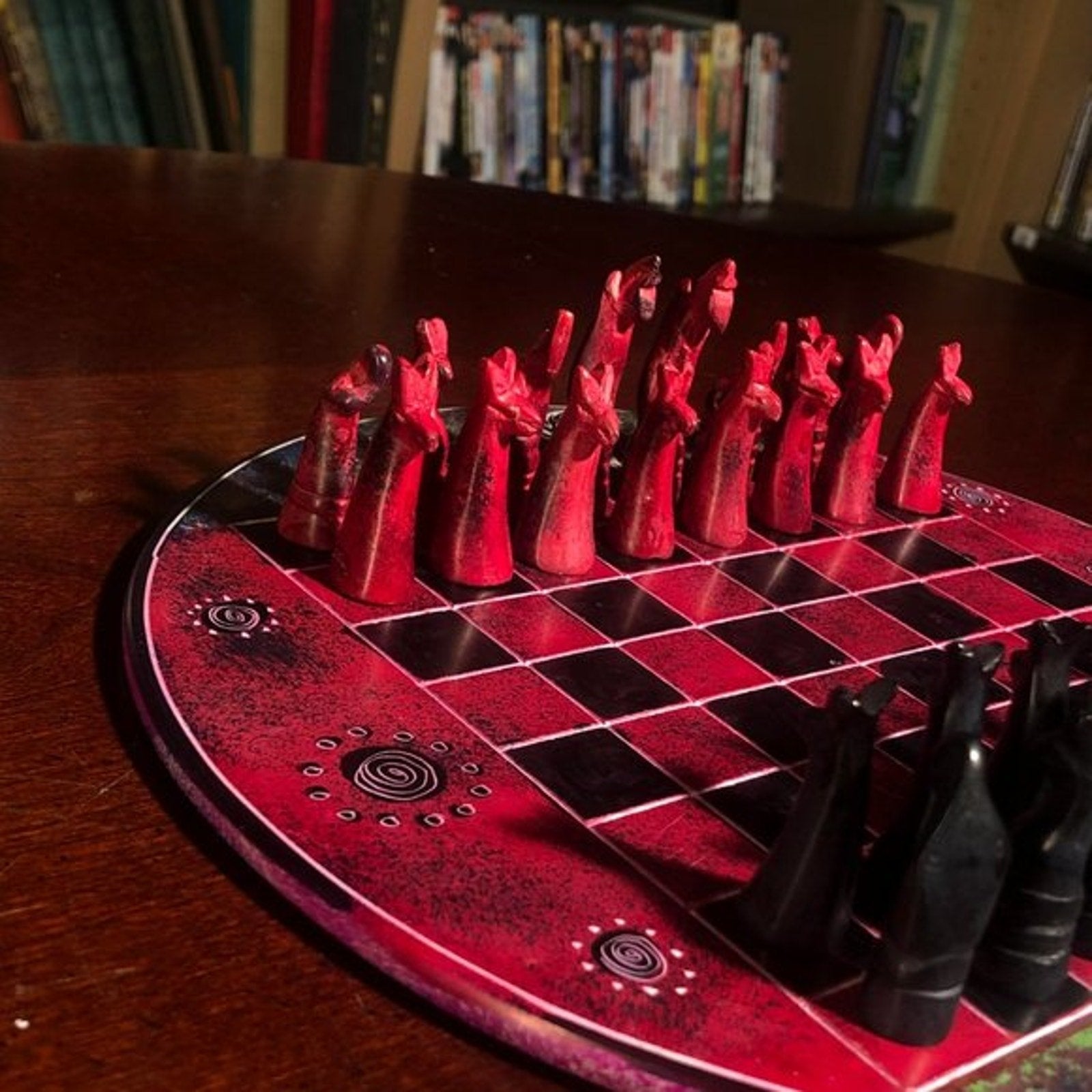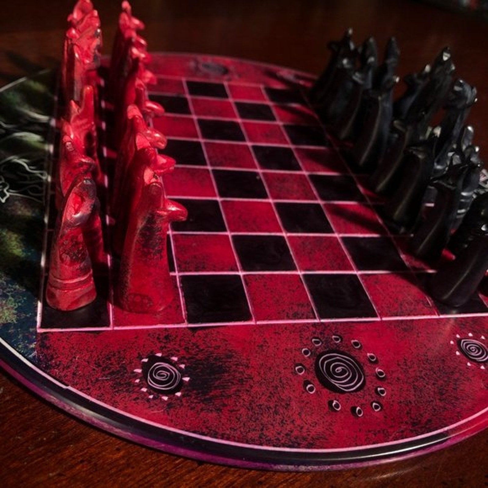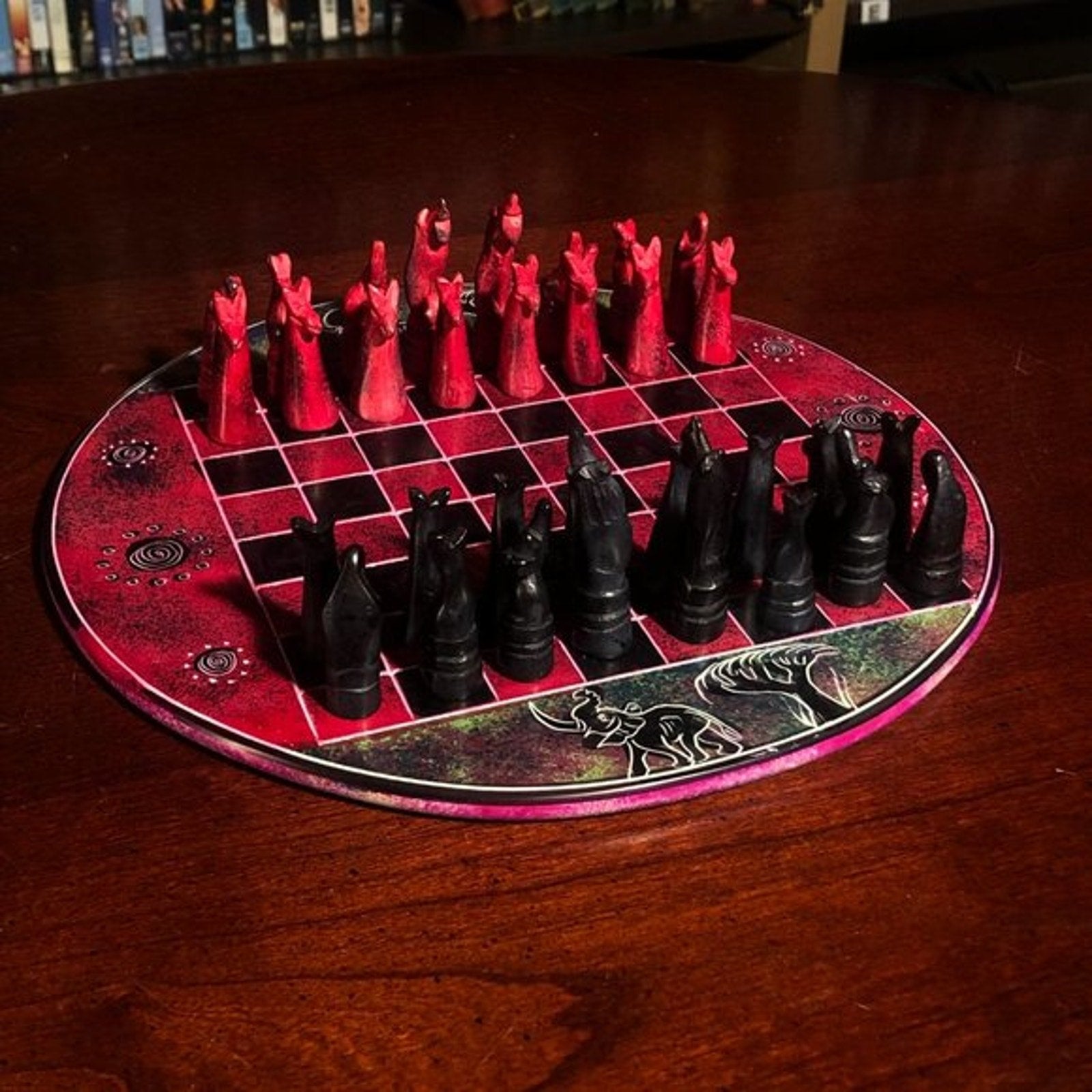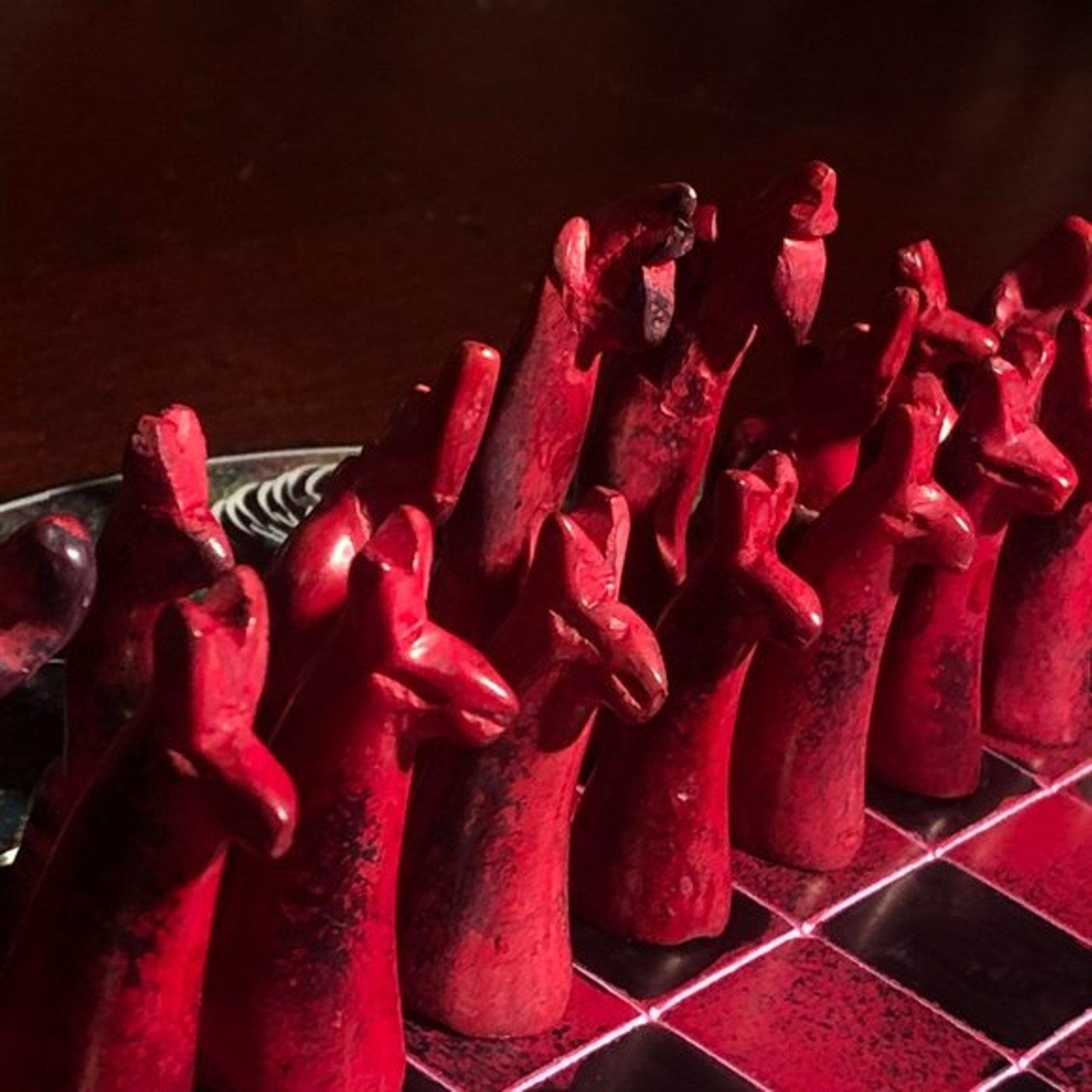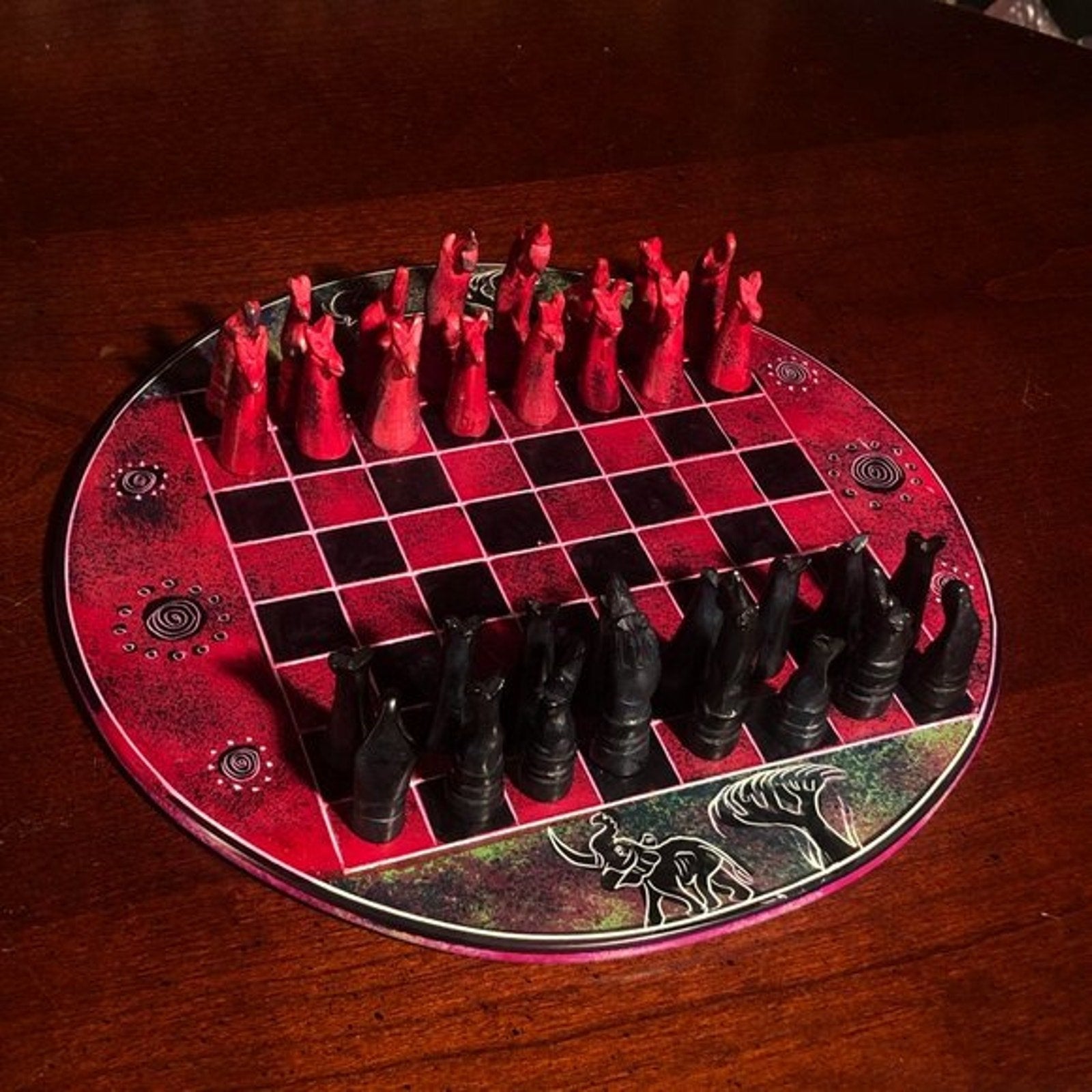 Crafted by African artisans in Western Kenya using traditional techniques, this soapstone chess set will become a conversation piece during play or on display! The board features square inlay pieces of natural painted soapstone. Each safari animal piece is hand carved in soapstone.