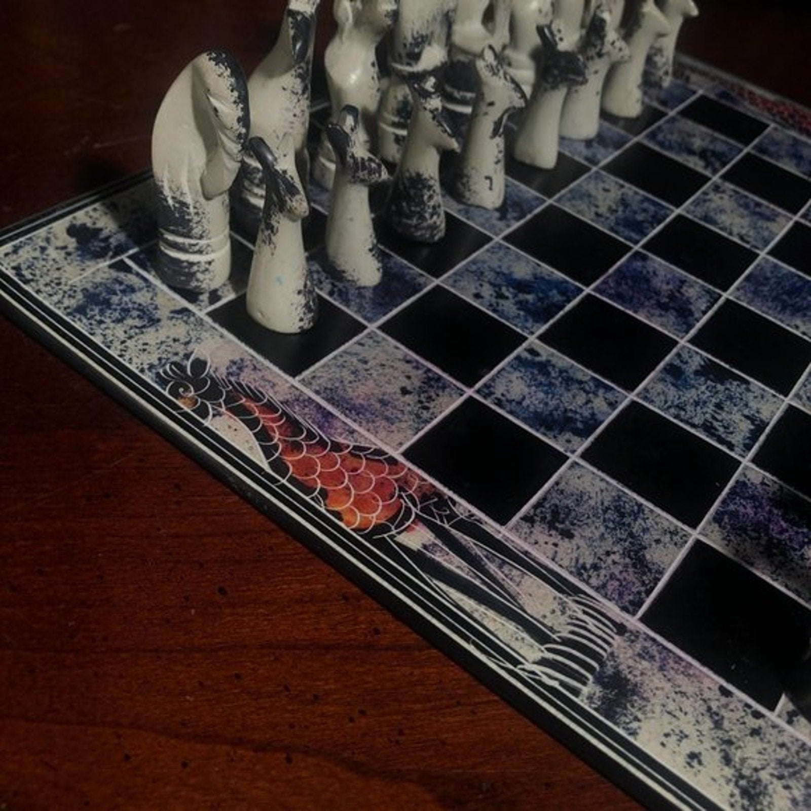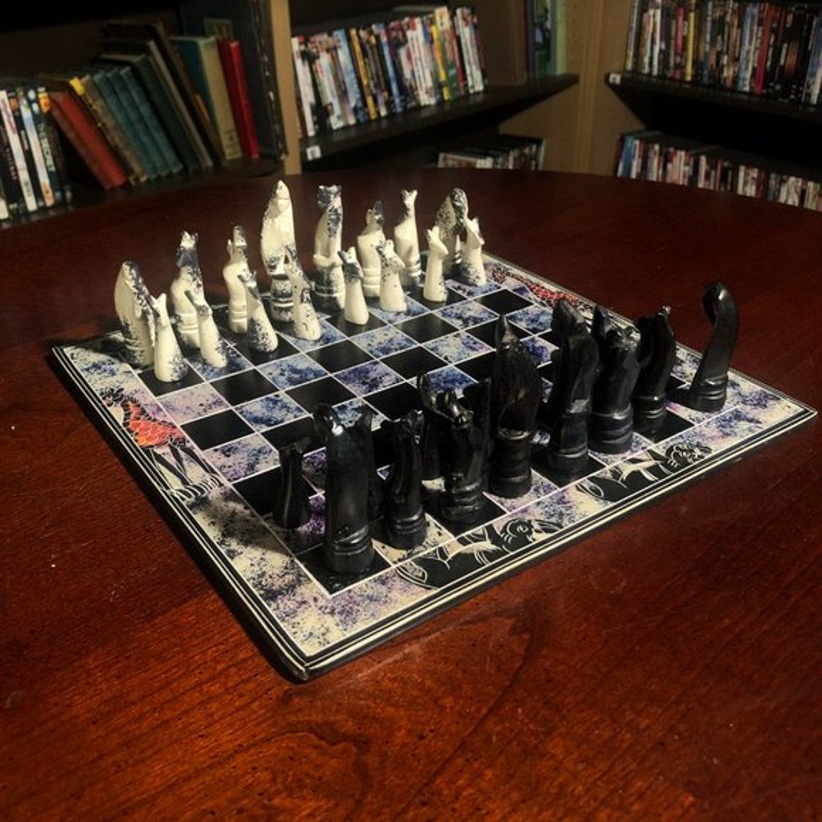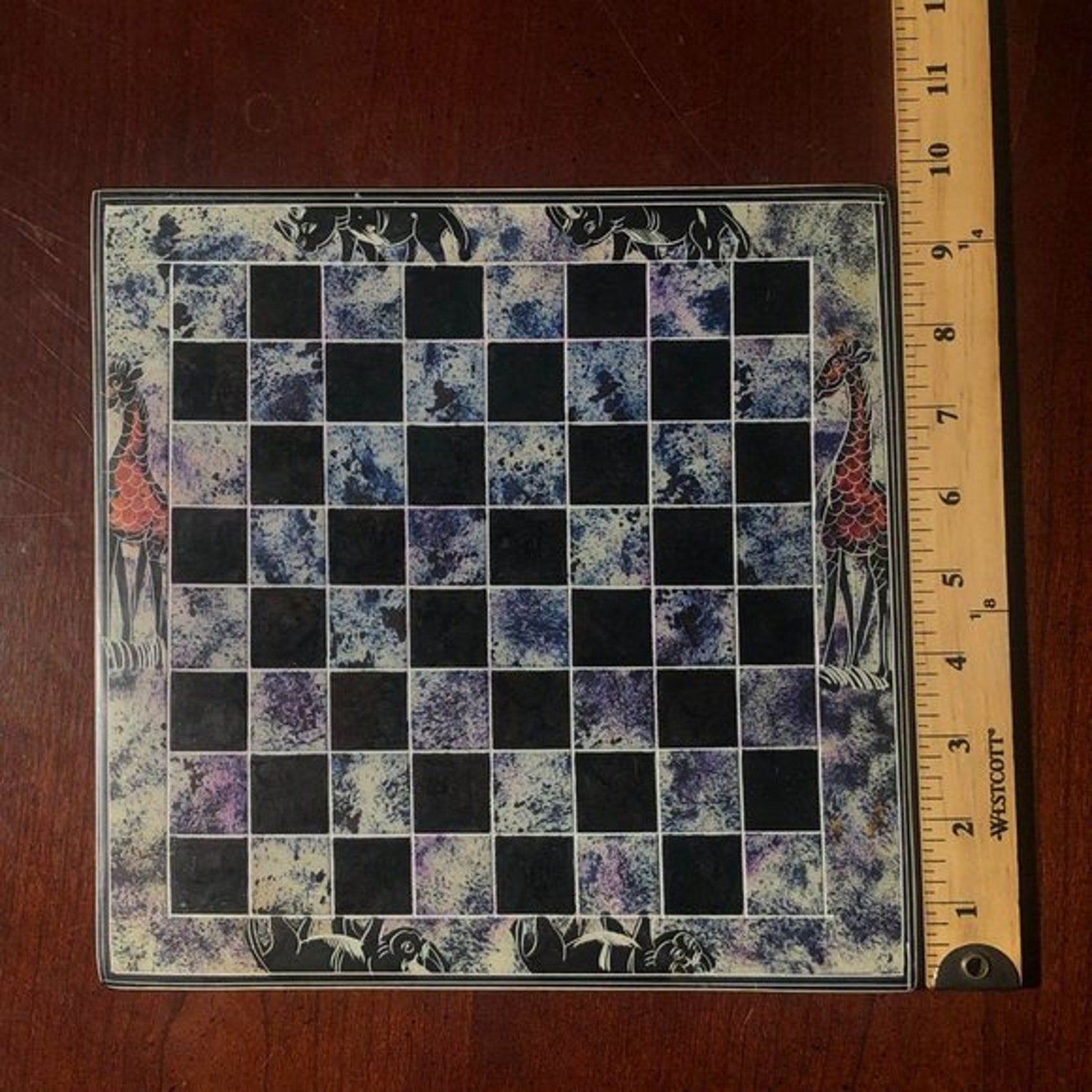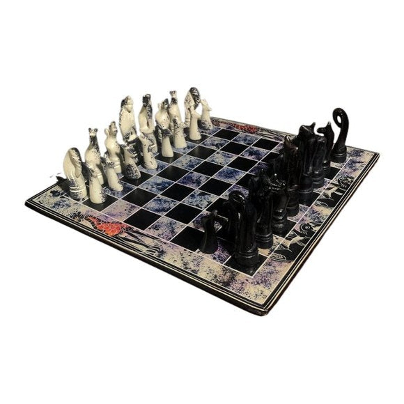 Crafted by African artisans in Western Kenya using traditional techniques, this soapstone chess set will become a conversation piece during play or on display! The board features square inlay pieces of natural painted soapstone. Each safari animal piece is hand carved in soapstone.