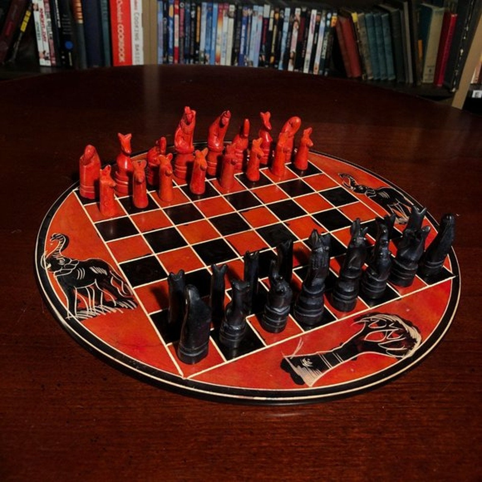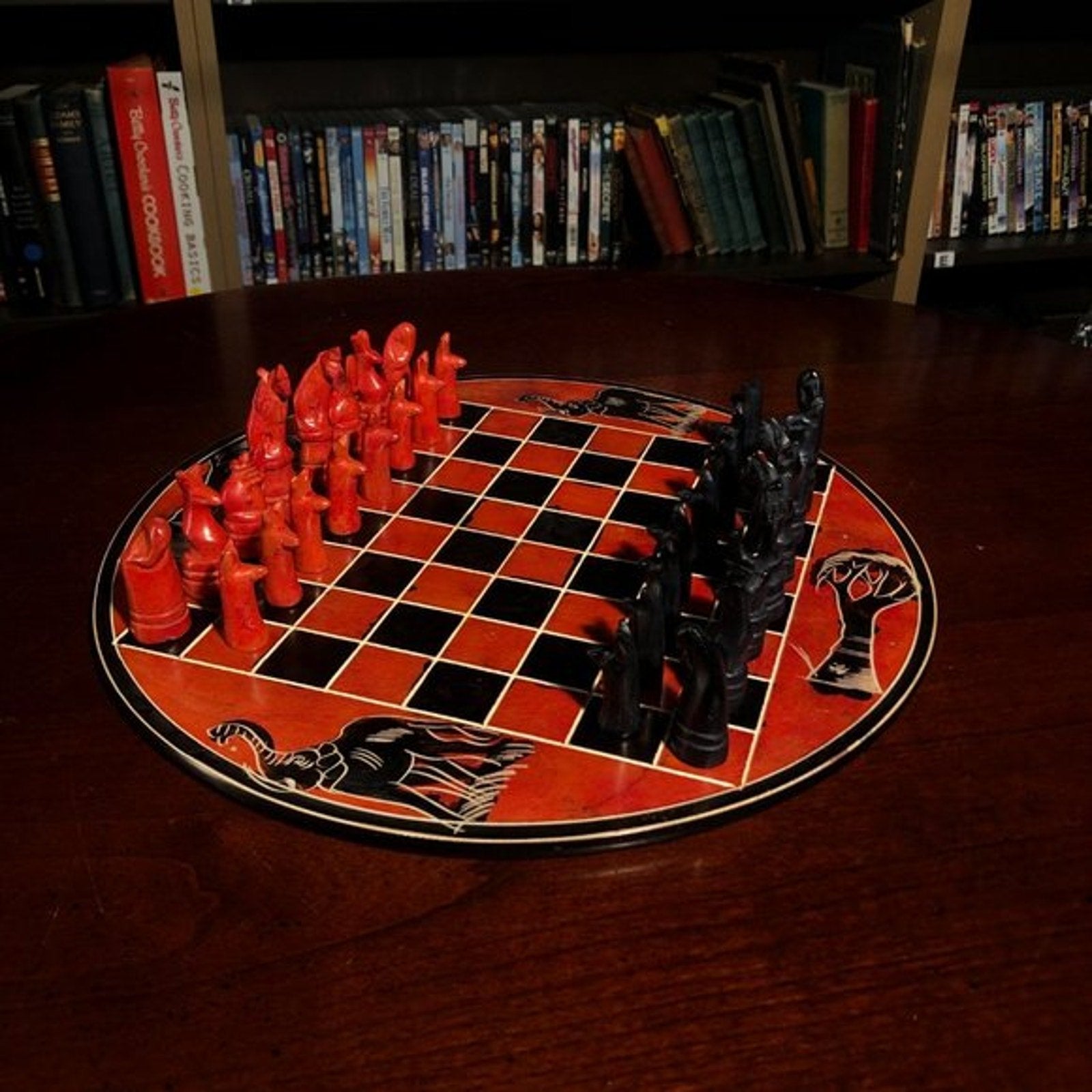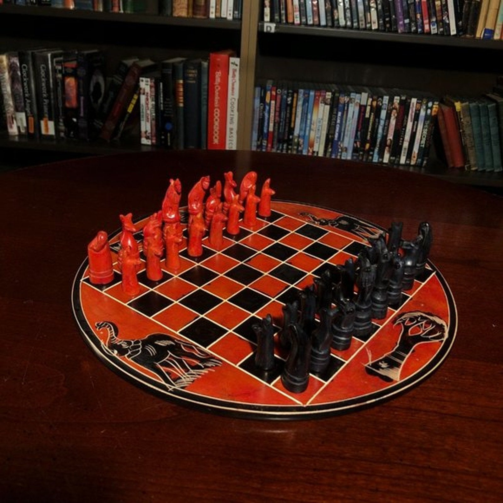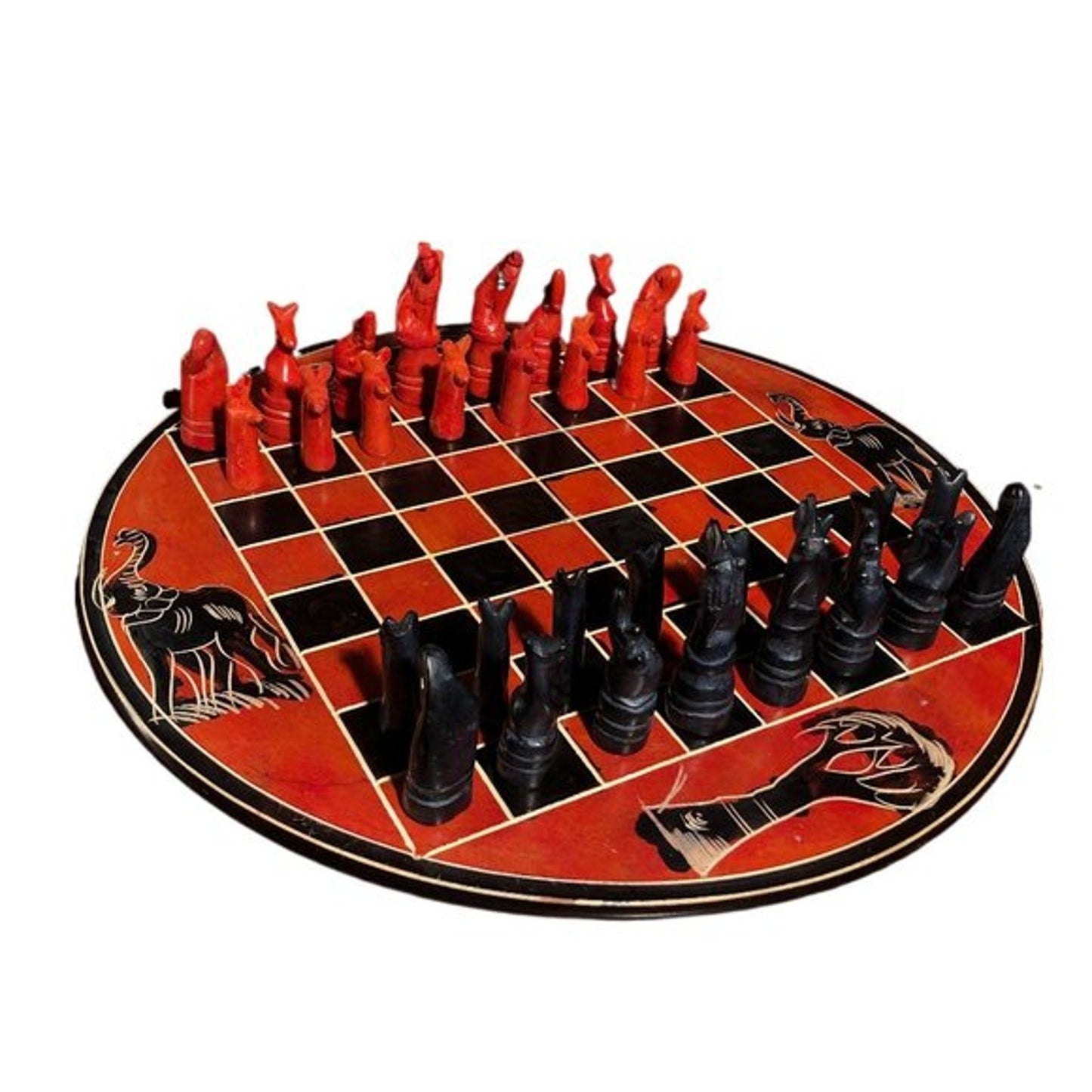 Crafted by African artisans in Western Kenya using traditional techniques, this soapstone chess set will become a conversation piece during play or on display! The board features square inlay pieces of natural painted soapstone. Each safari animal piece is hand carved in soapstone.