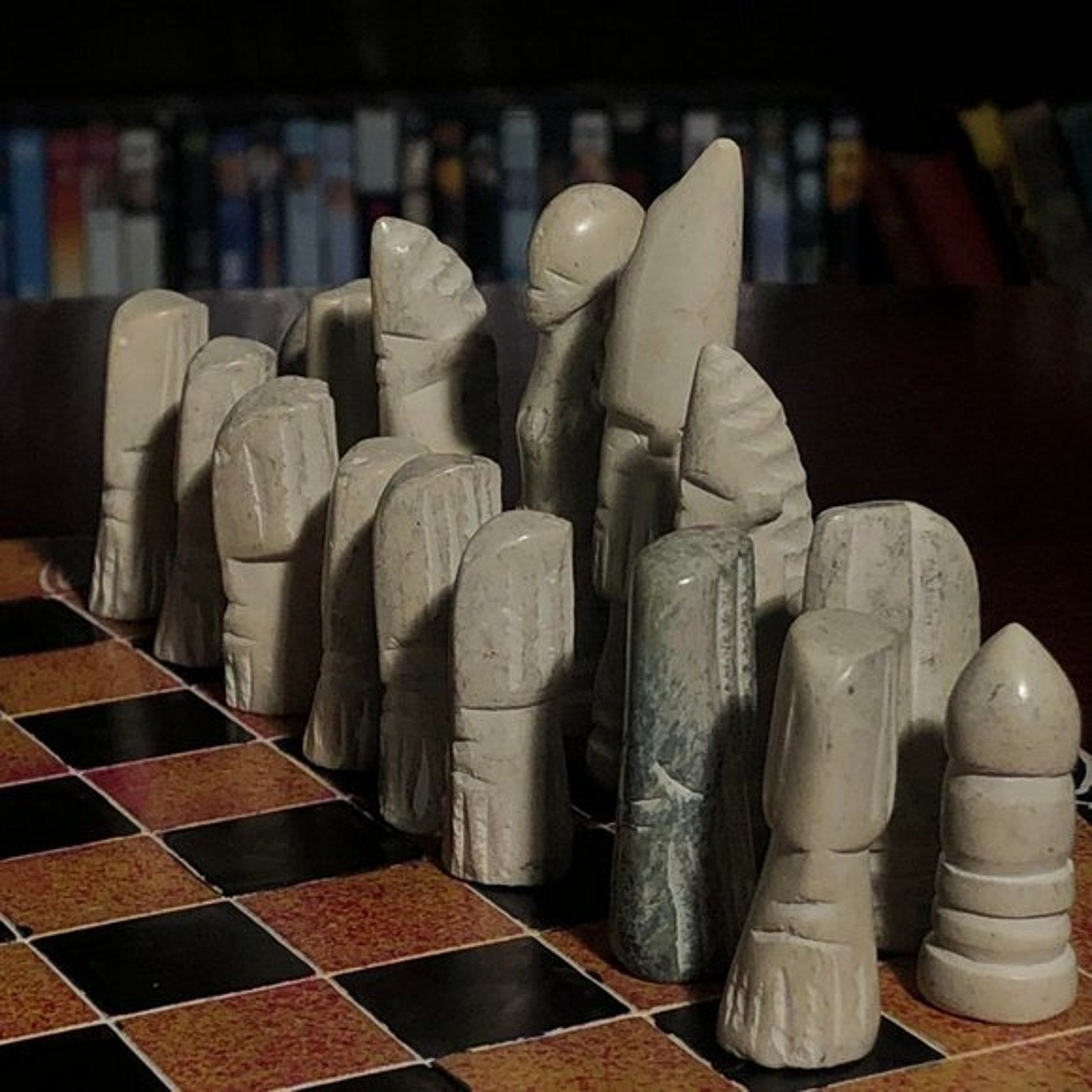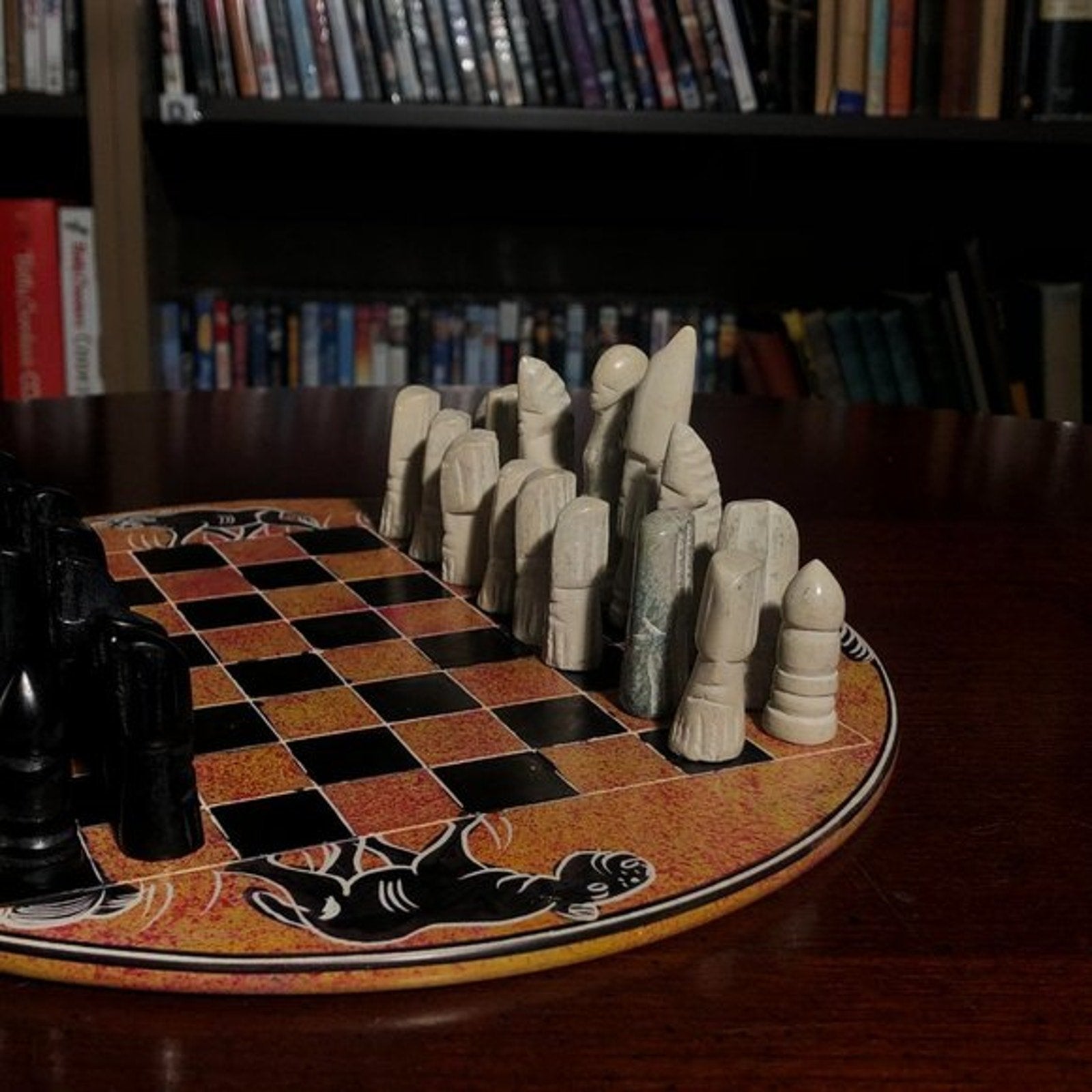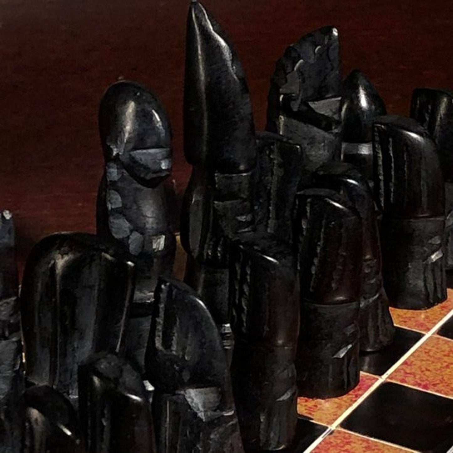 Crafted by African artisans in Western Kenya using traditional techniques, this soapstone chess set will become a conversation piece during play or on display! The board features square inlay pieces of natural painted soapstone. Each safari animal piece is hand carved in soapstone.