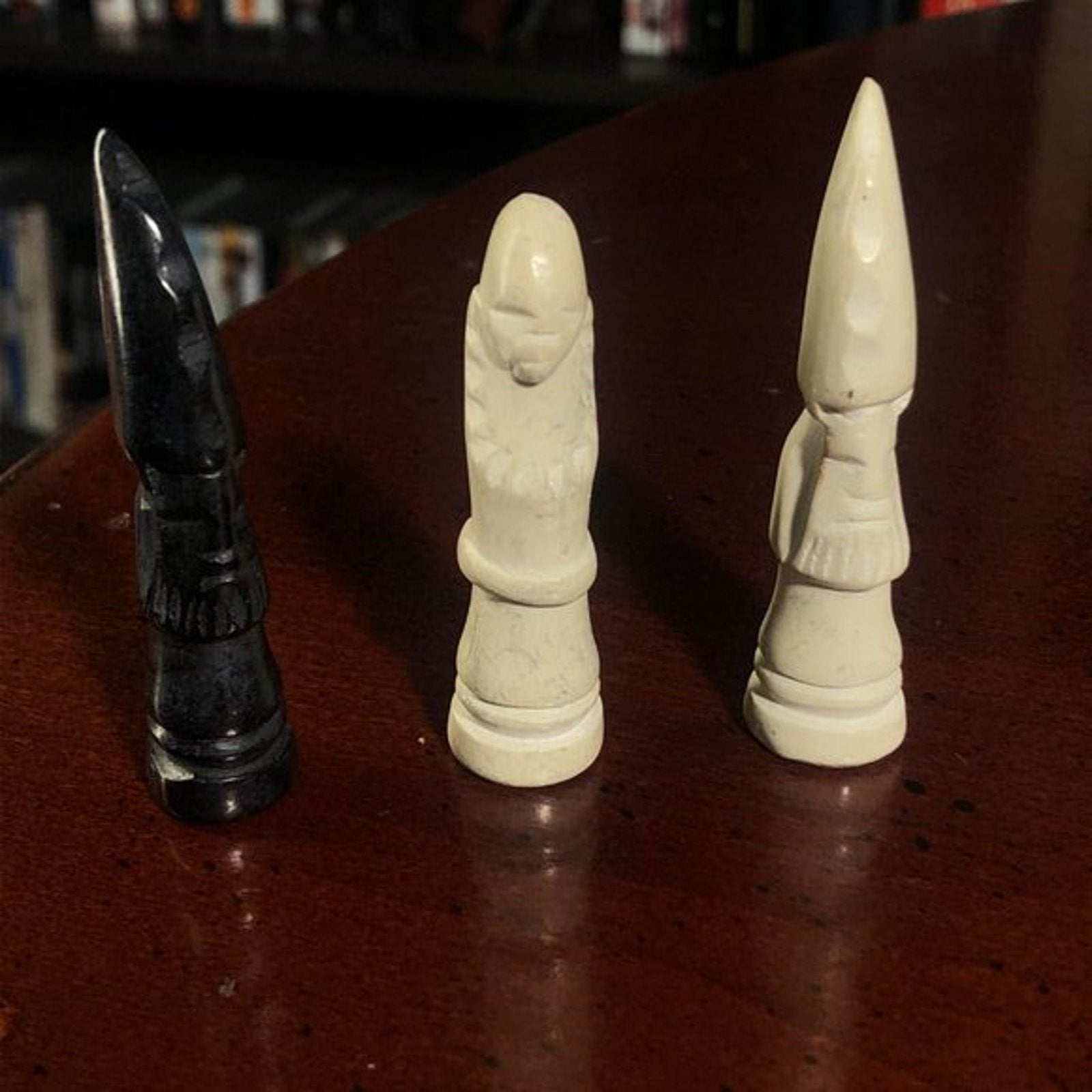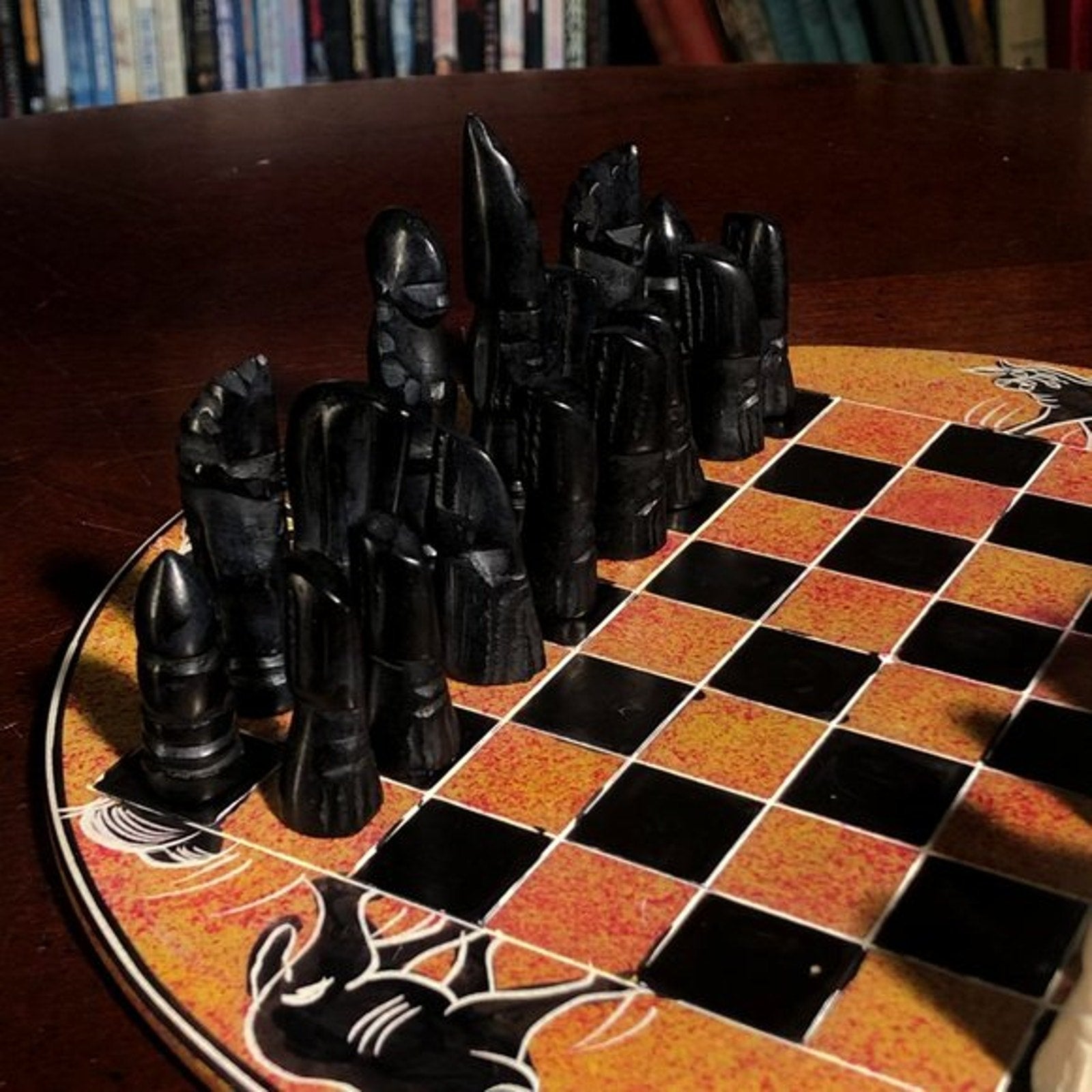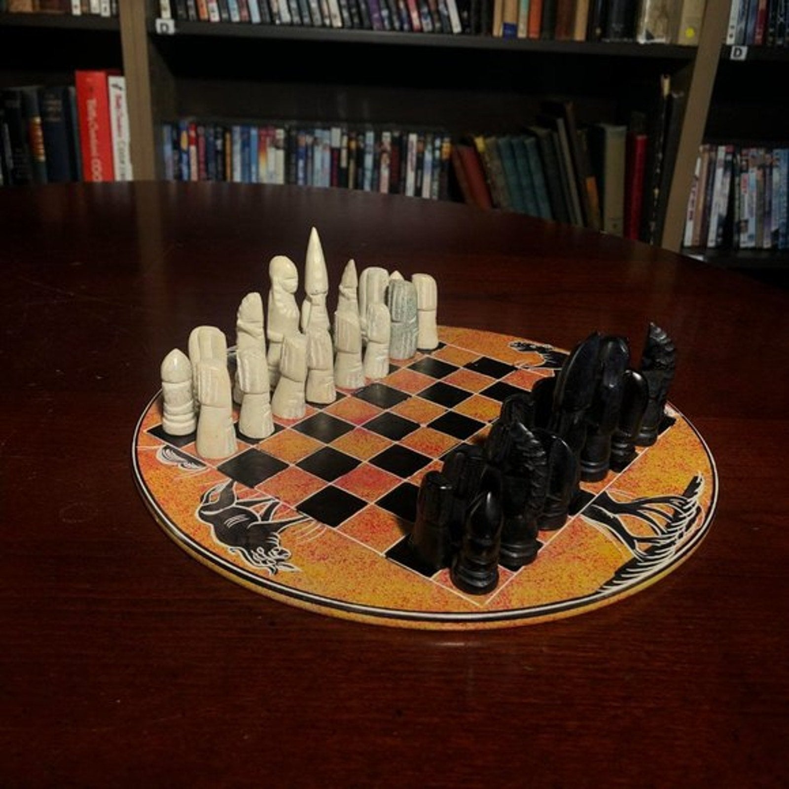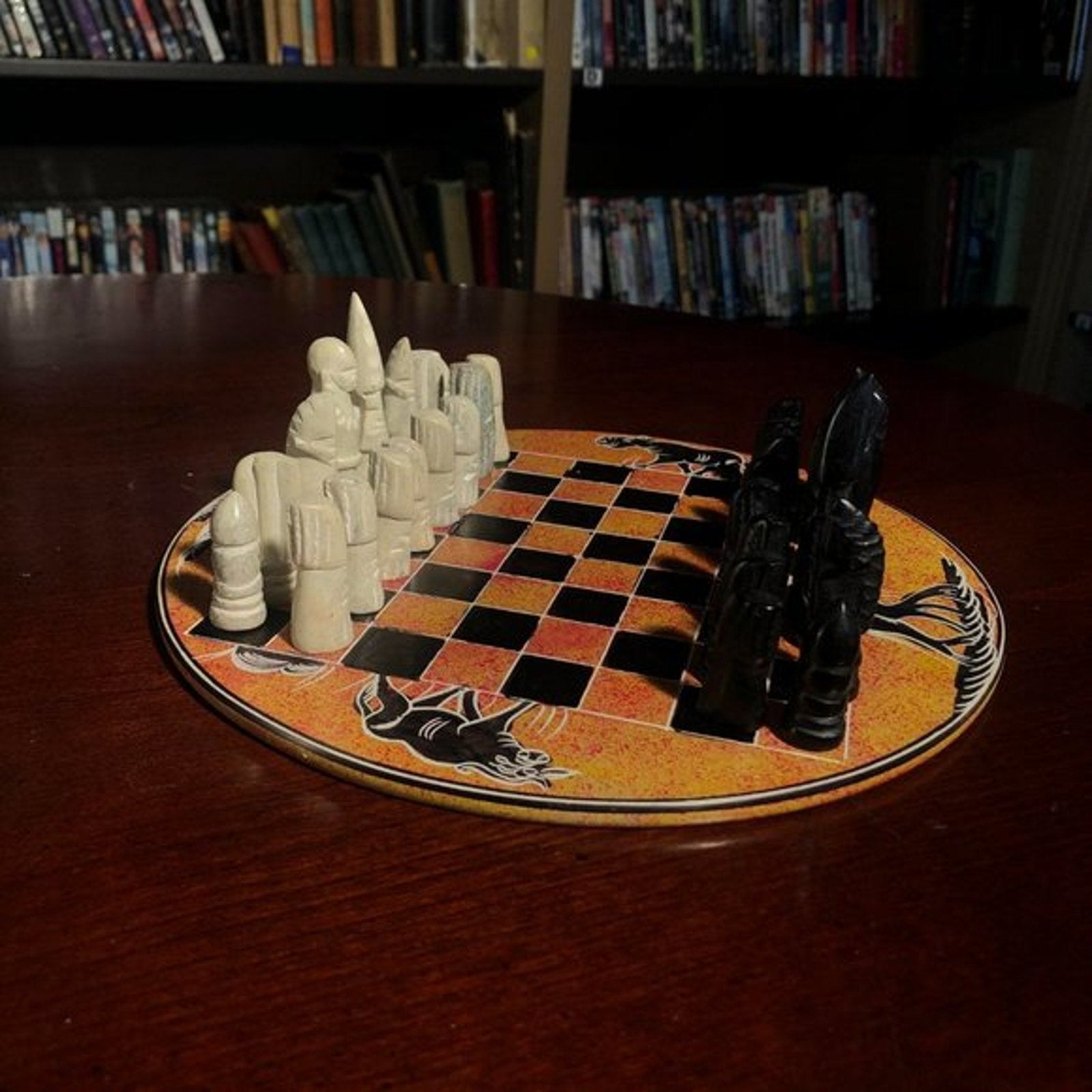 Crafted by African artisans in Western Kenya using traditional techniques, this soapstone chess set will become a conversation piece during play or on display! The board features square inlay pieces of natural painted soapstone. Each safari animal piece is hand carved in soapstone.