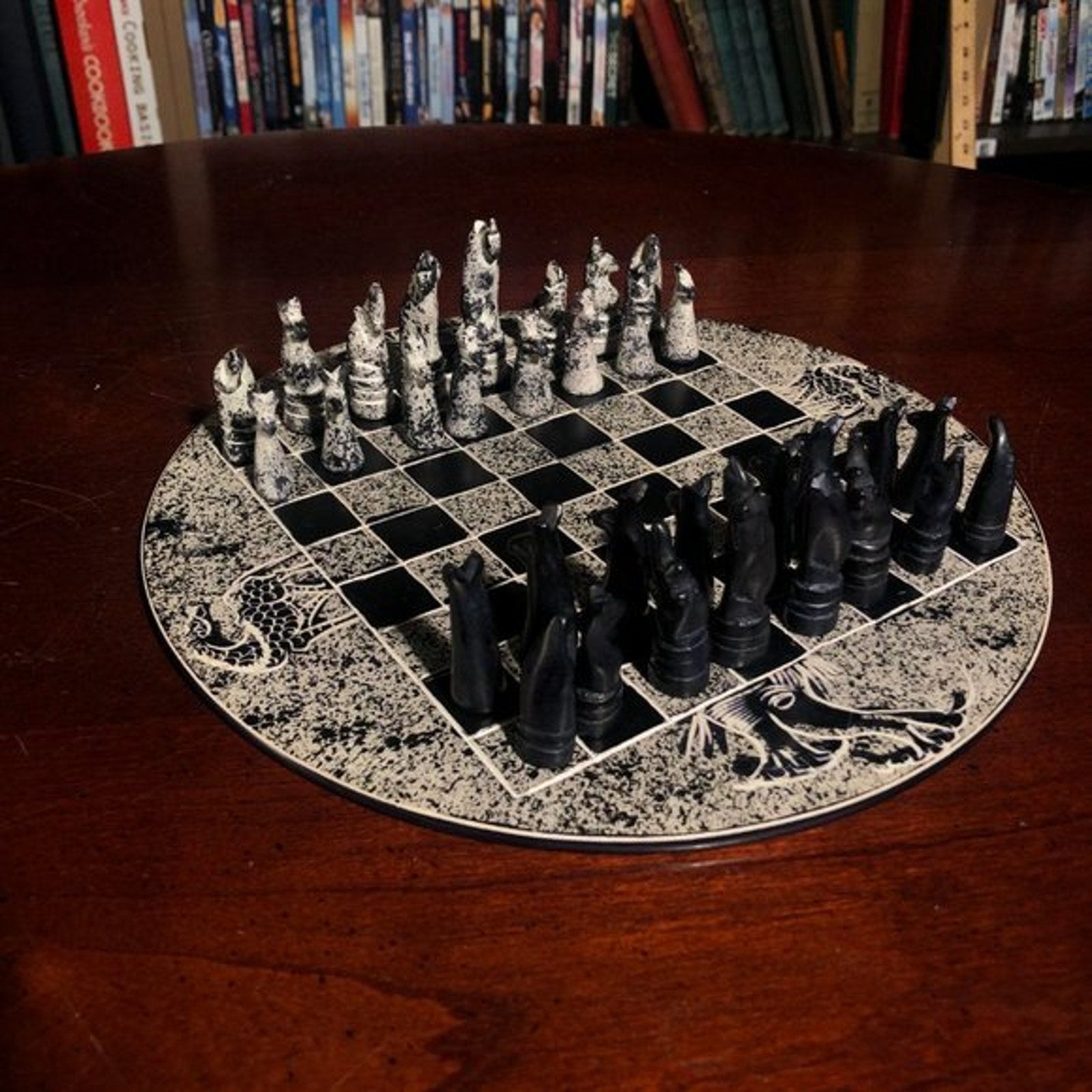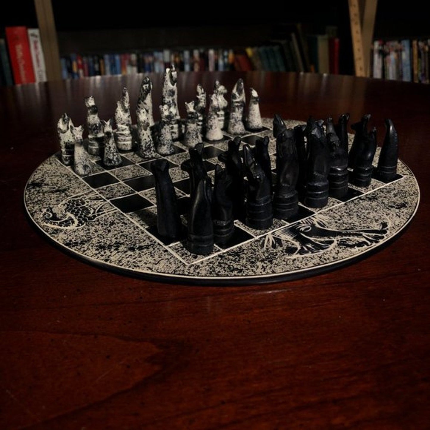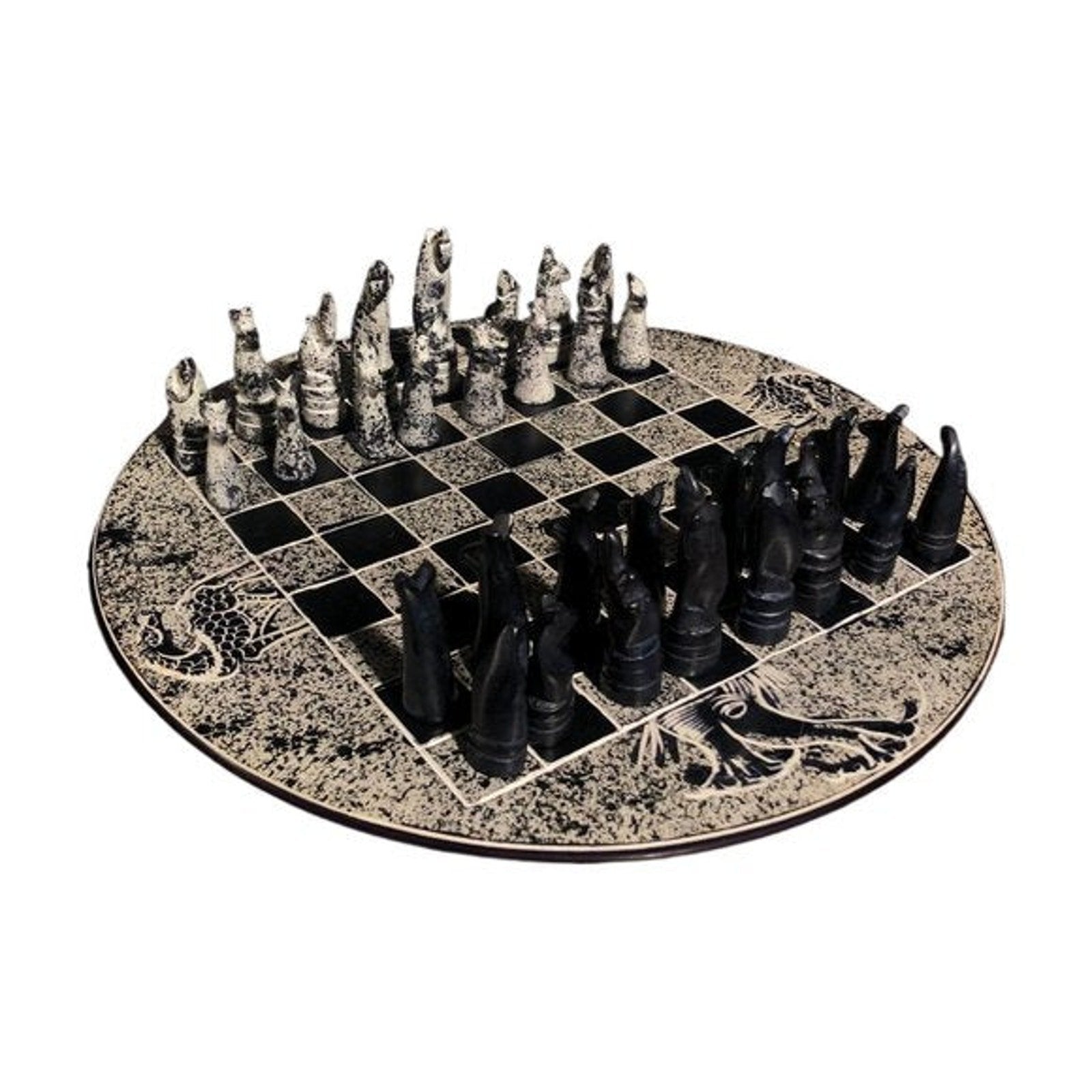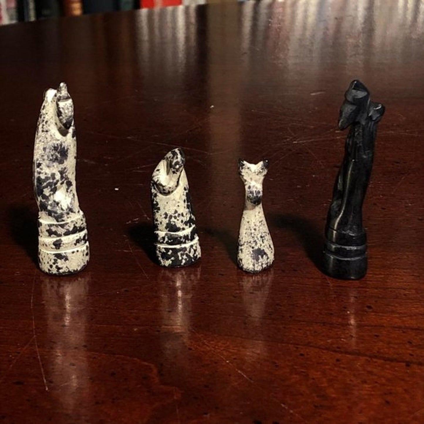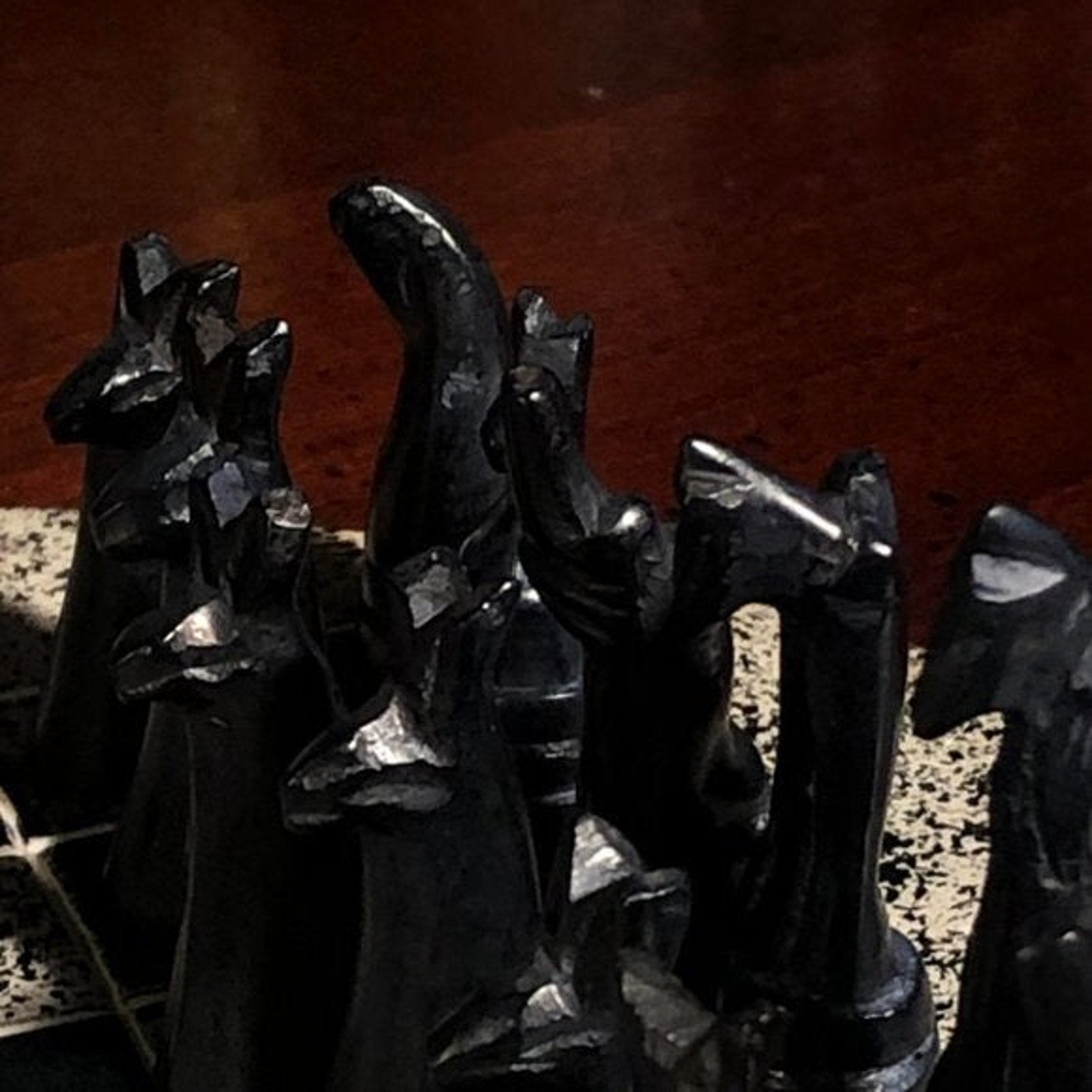 Crafted by African artisans in Western Kenya using traditional techniques, this soapstone chess set will become a conversation piece during play or on display! The board features square inlay pieces of natural painted soapstone. Each safari animal piece is hand carved in soapstone.