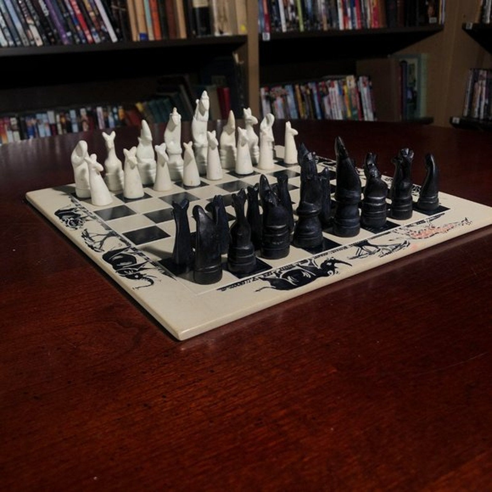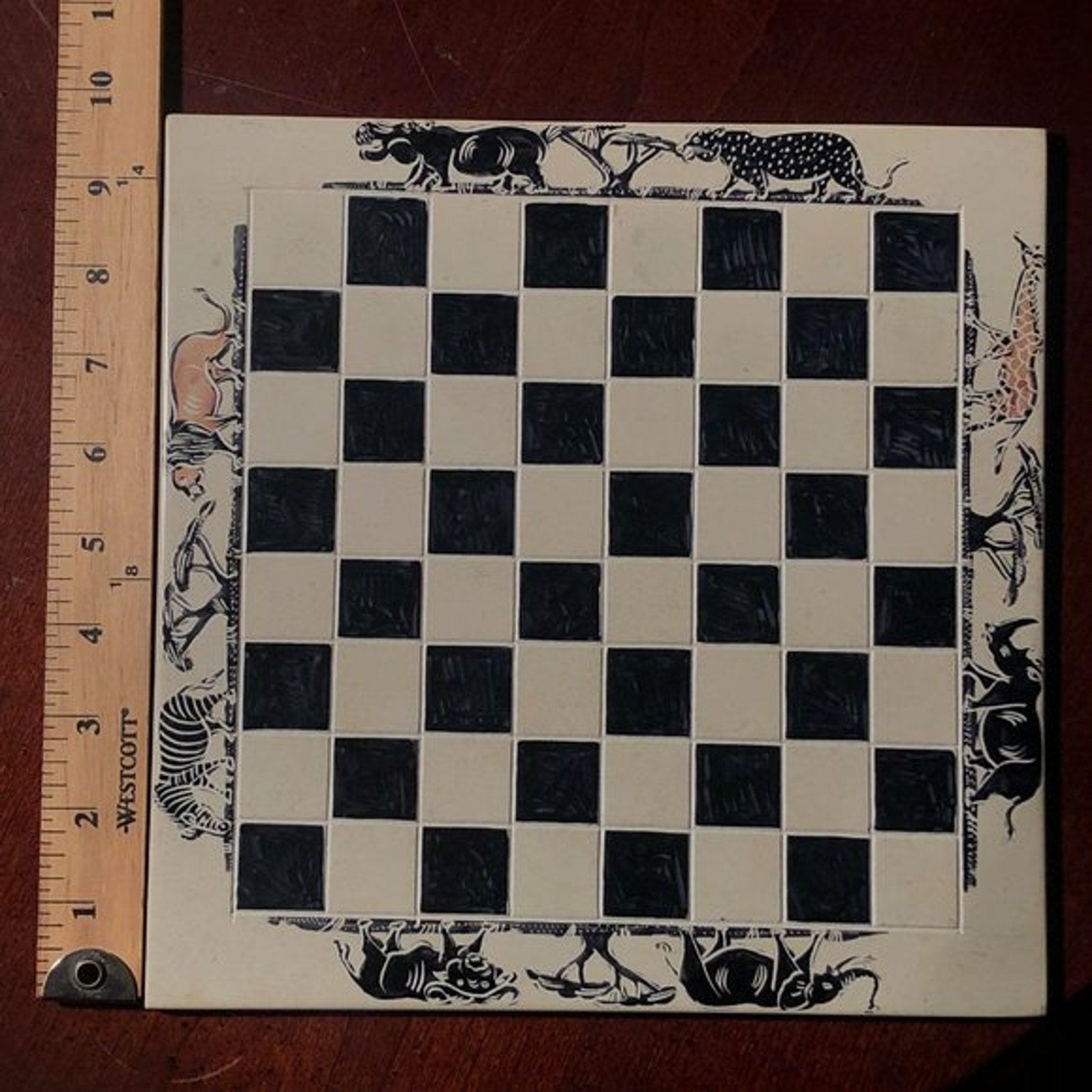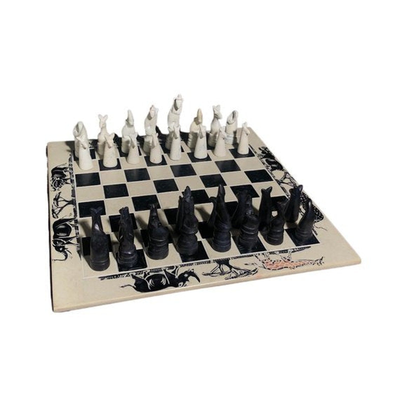 Crafted by African artisans in Western Kenya using traditional techniques, this soapstone chess set will become a conversation piece during play or on display! The board features square inlay pieces of natural painted soapstone. Each safari animal piece is hand carved in soapstone.