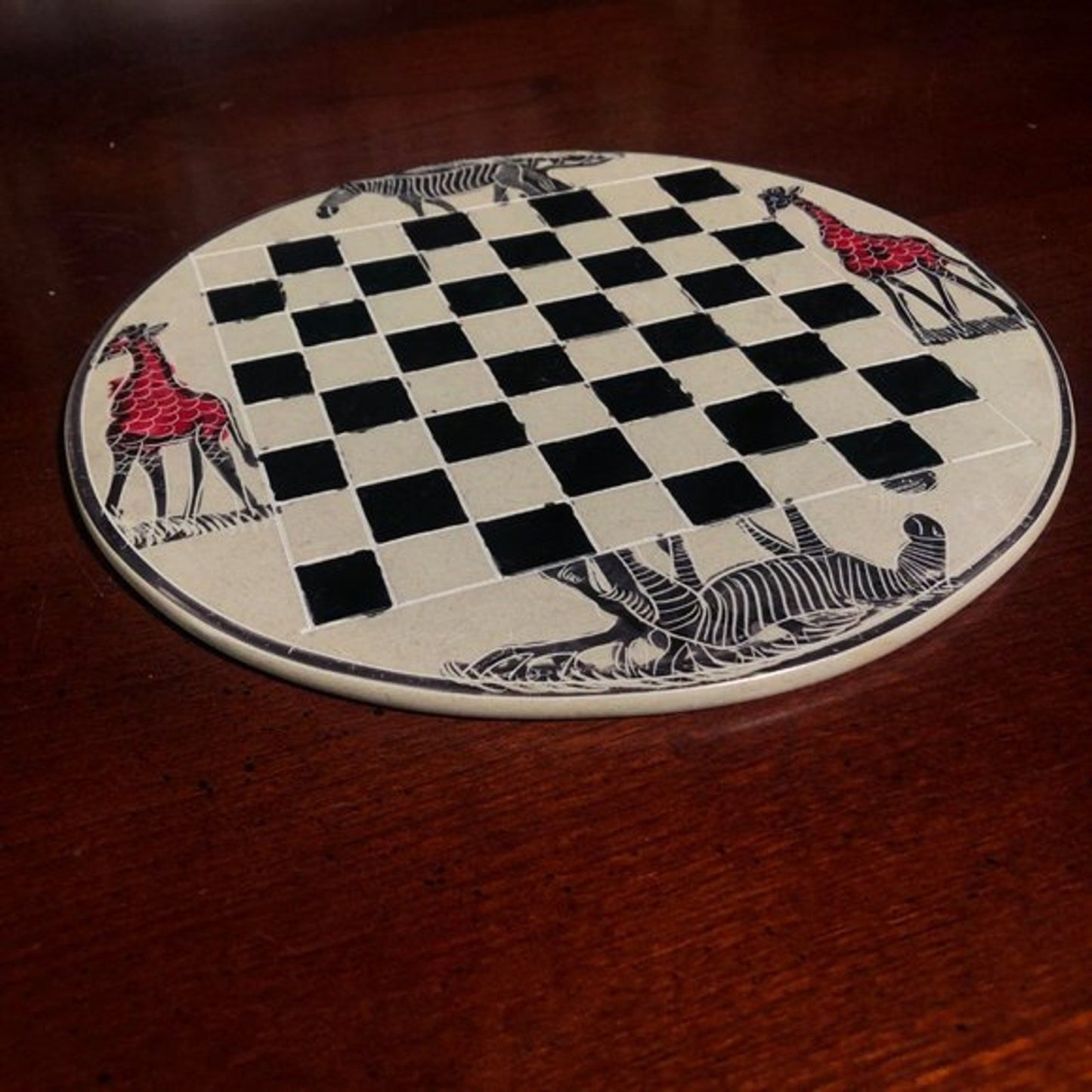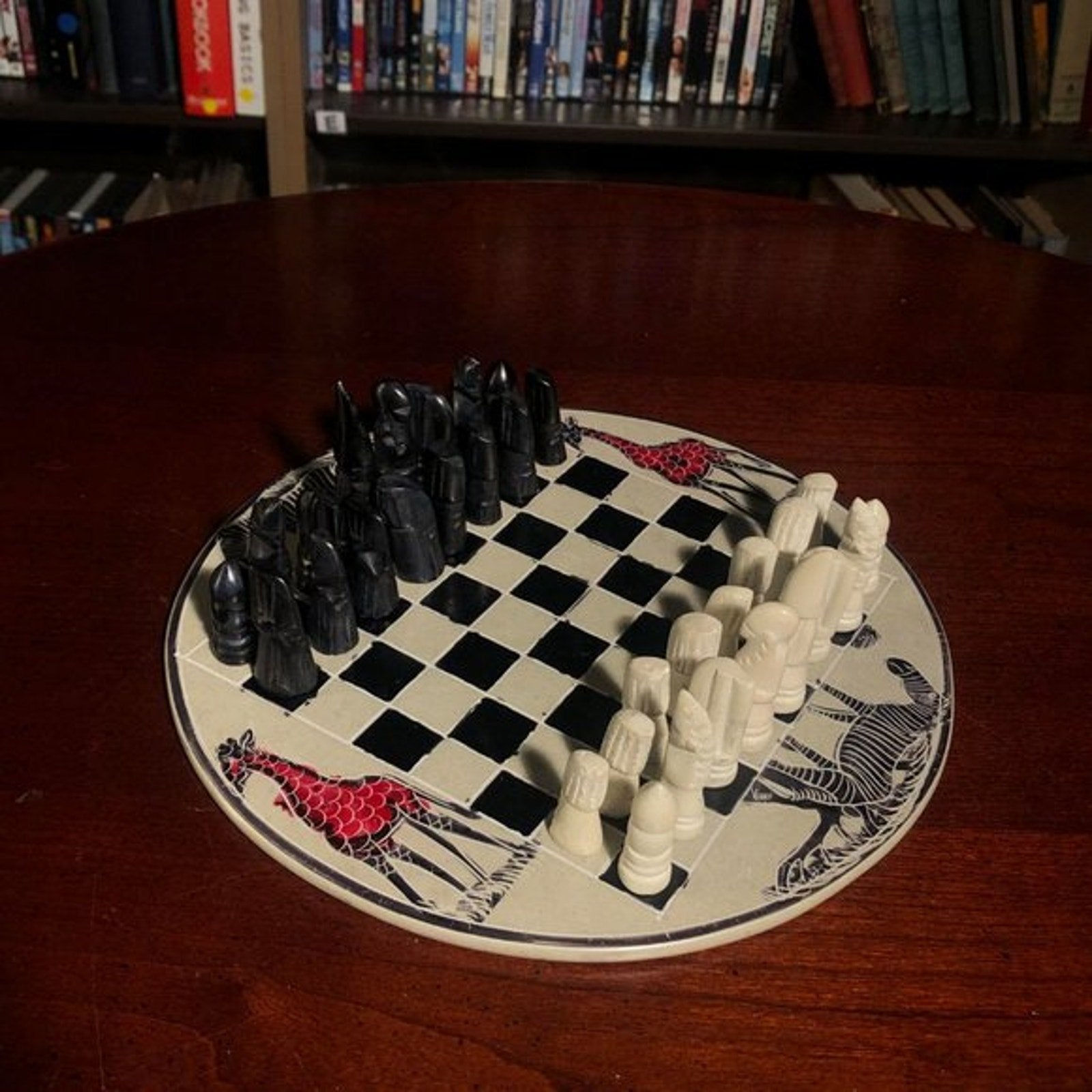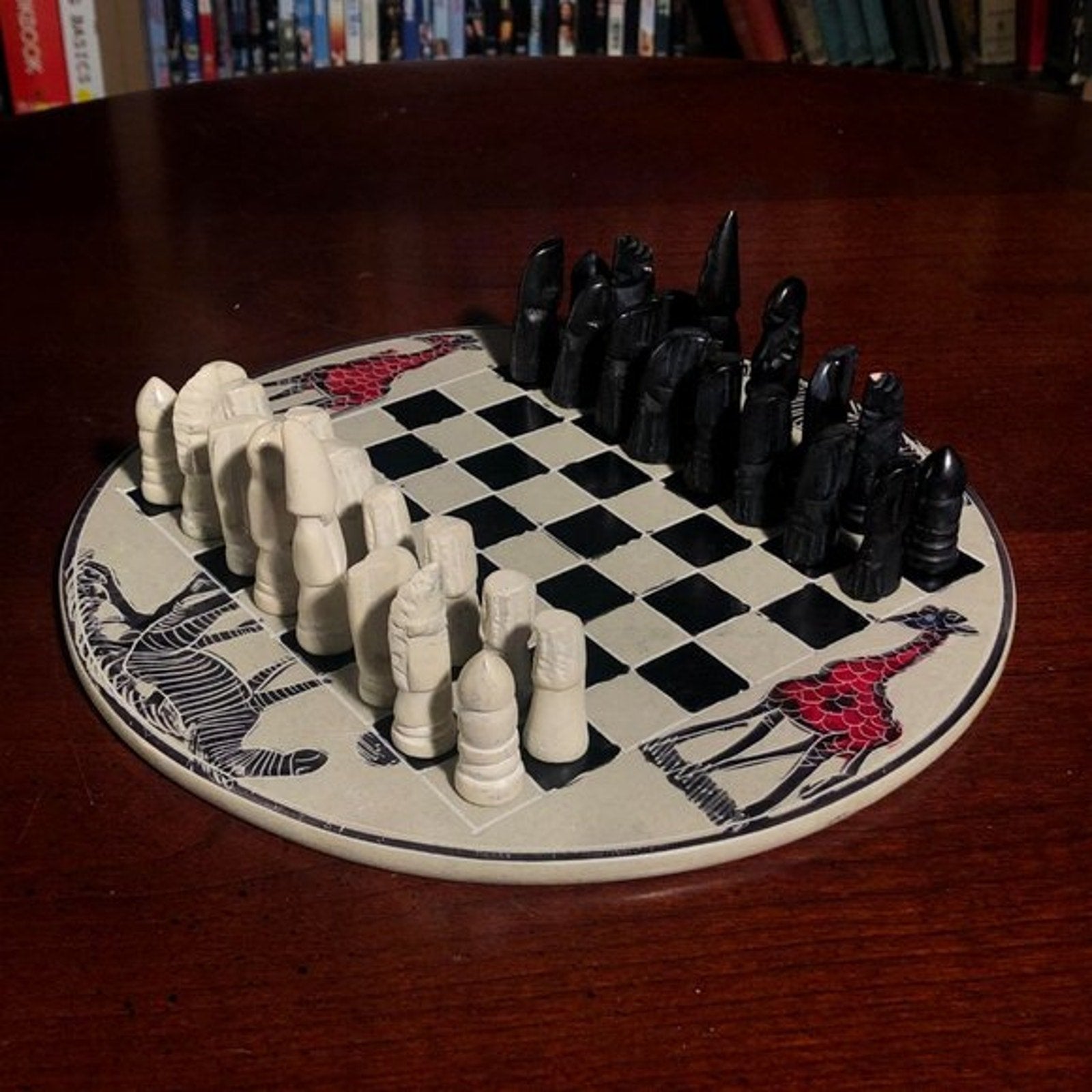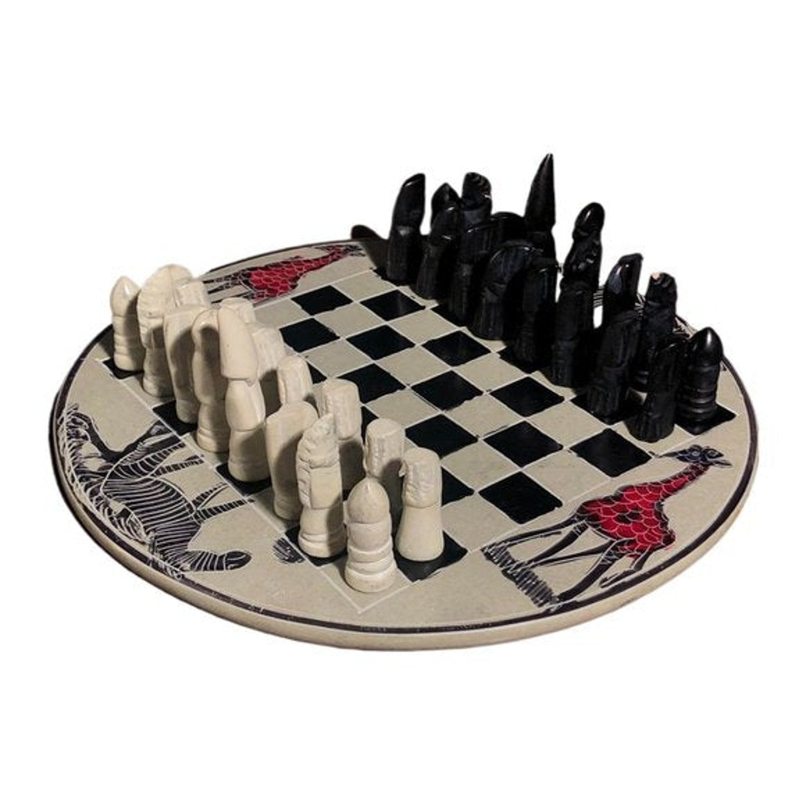 Crafted by African artisans in Western Kenya using traditional techniques, this soapstone chess set will become a conversation piece during play or on display! The board features square inlay pieces of natural painted soapstone. Each safari animal piece is hand carved in soapstone.