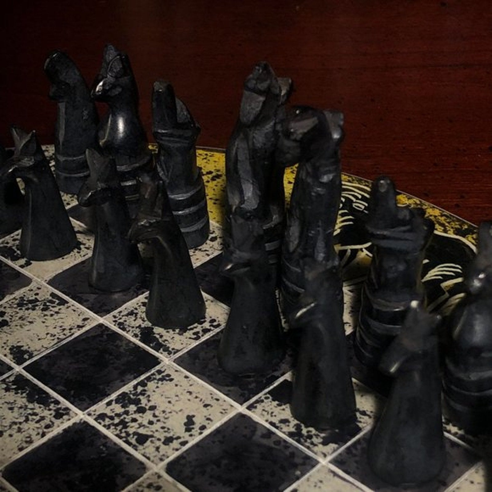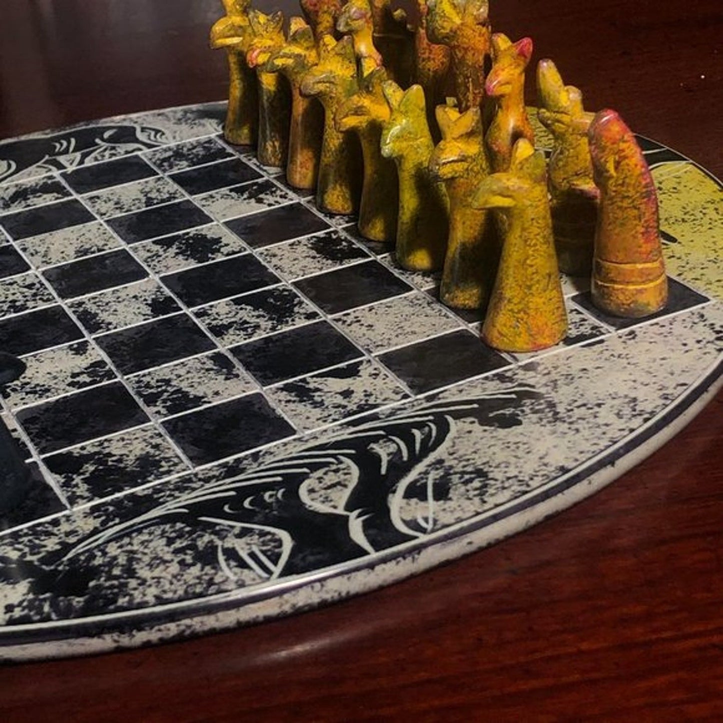 Crafted by African artisans in Western Kenya using traditional techniques, this soapstone chess set will become a conversation piece during play or on display! The board features square inlay pieces of natural painted soapstone. Each safari animal piece is hand carved in soapstone.