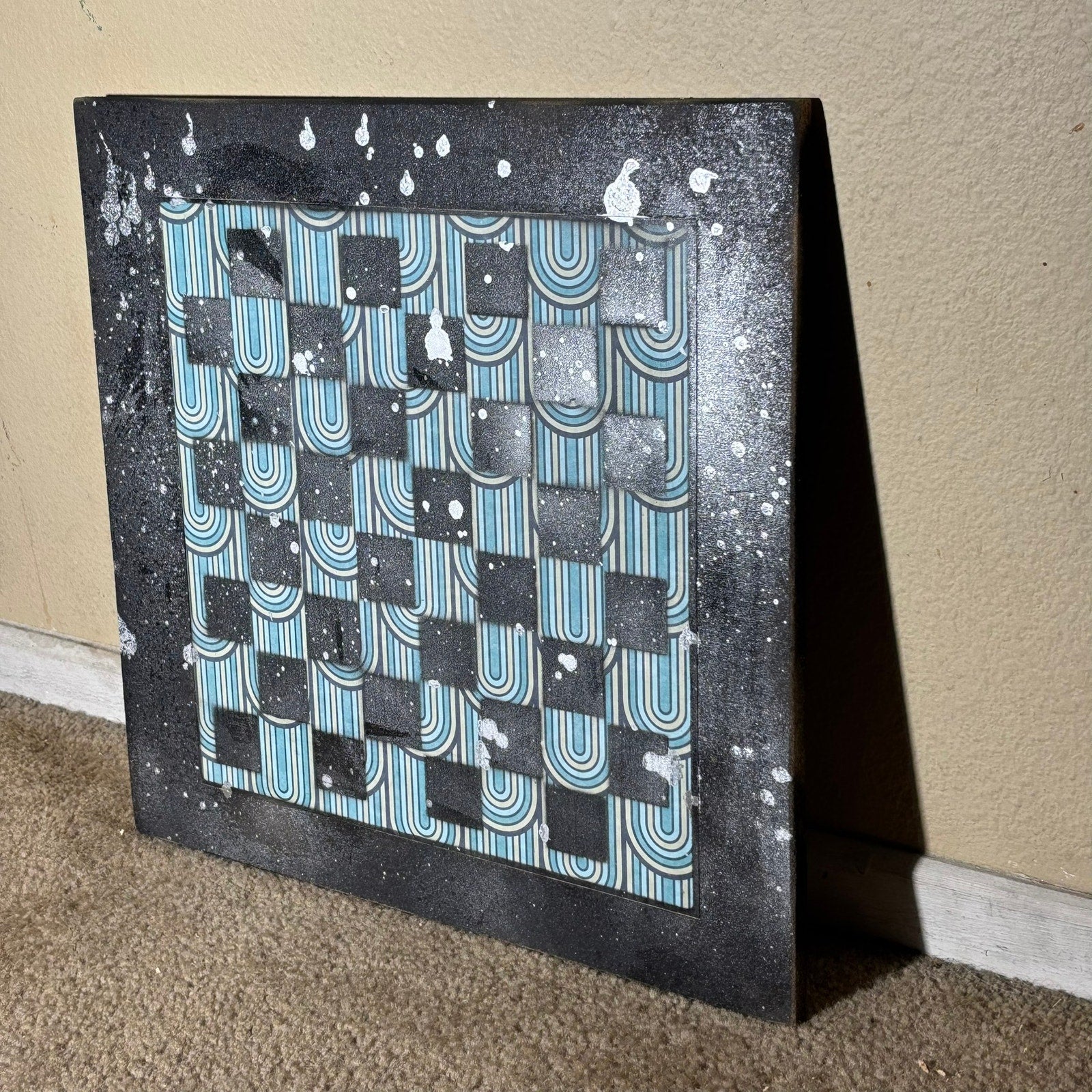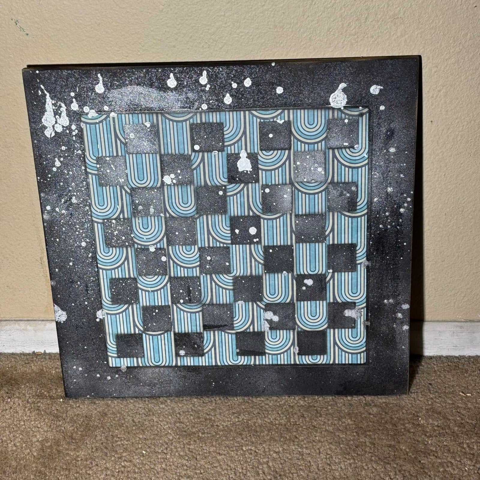 The board is crafted from durable particle board, painted with care to create the classic chess square pattern. What makes this board special is the unique 12x12 piece of scrapbook paper inlaid in the center, adding a personal touch to your game.