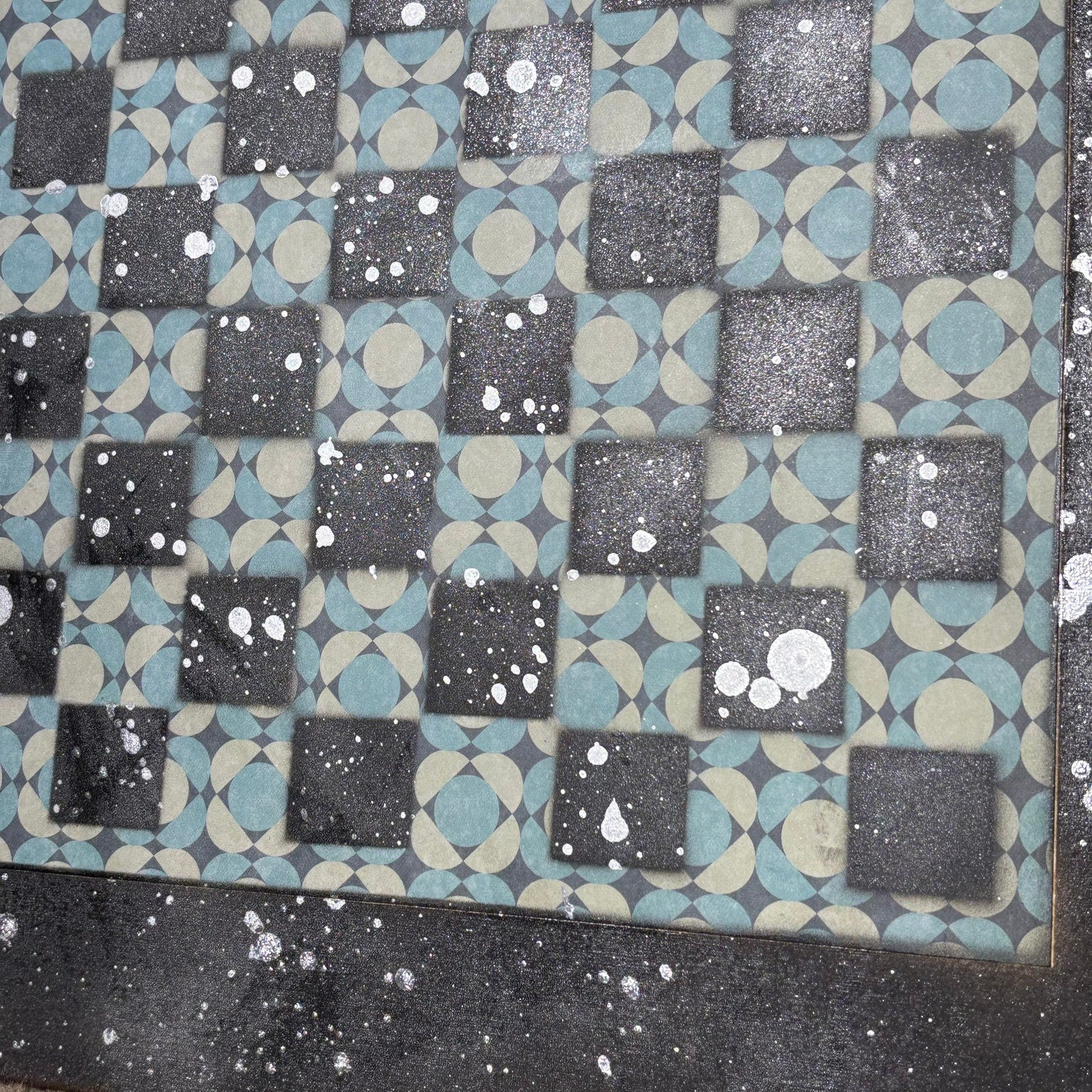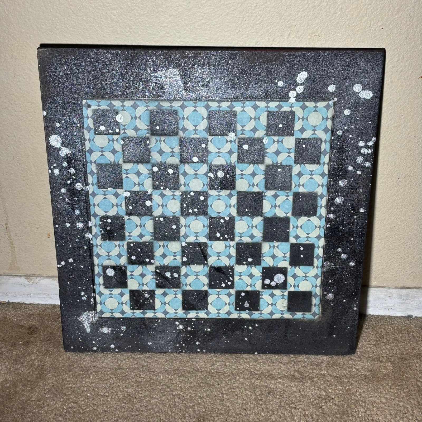 The board is crafted from durable particle board, painted with care to create the classic chess square pattern. What makes this board special is the unique 12x12 piece of scrapbook paper inlaid in the center, adding a personal touch to your game.