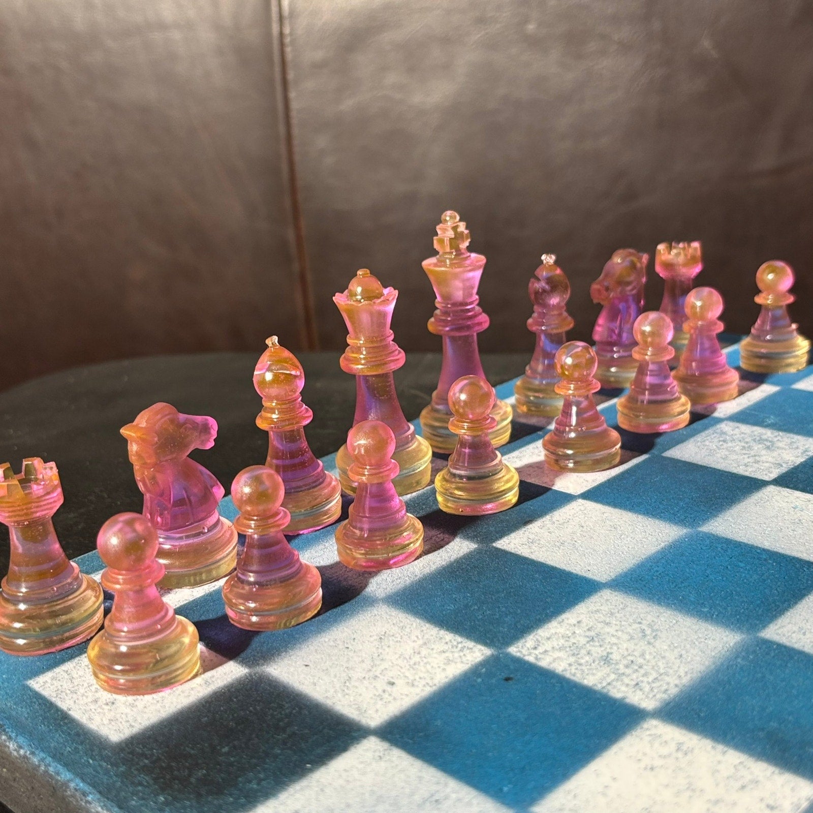 *** PLEASE READ: The resin pieces that have clear transparent parts will slowly turn royal amber as time goes on (Clear see through resin turn amber with time). Most of the sets are solid or colored so there is no need to expect a change at all, but some have clear transparent bottoms that will turn amber. I write this because some of our chess sets may not sell for a year or two and the photos are taken when the item is listed online. Meaning the photos will have slight difference. Rest assured, the amber is beautiful and vintage!