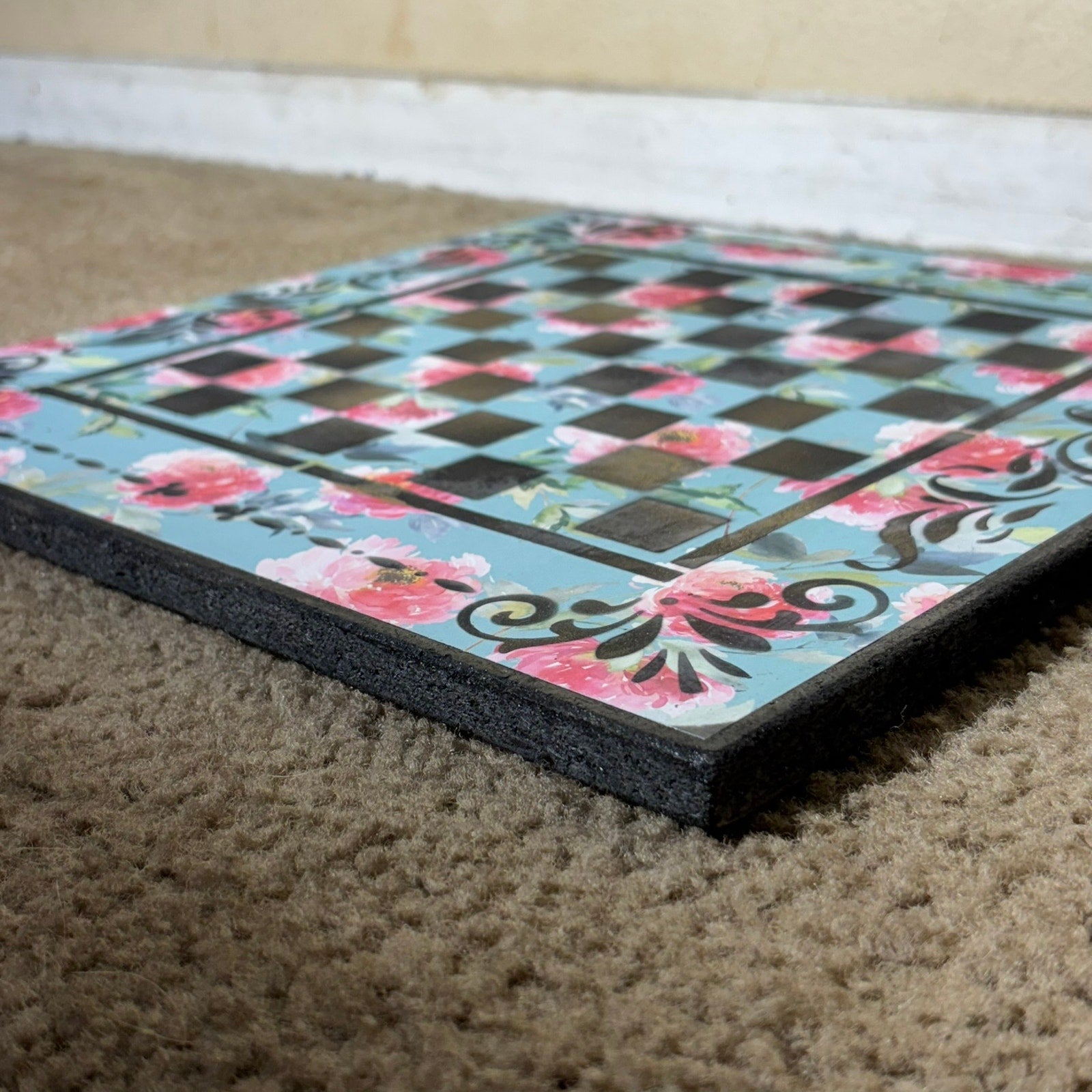 Each board features a layer of beautifully Scrapbook Paper Fused/Glued with particle board to give it a unique pretty pattern. We then paint squares onto the board to make them into fabulous chess boards. Made with a sturdy particle board base and smooth, beveled edges, this board is stunning.
