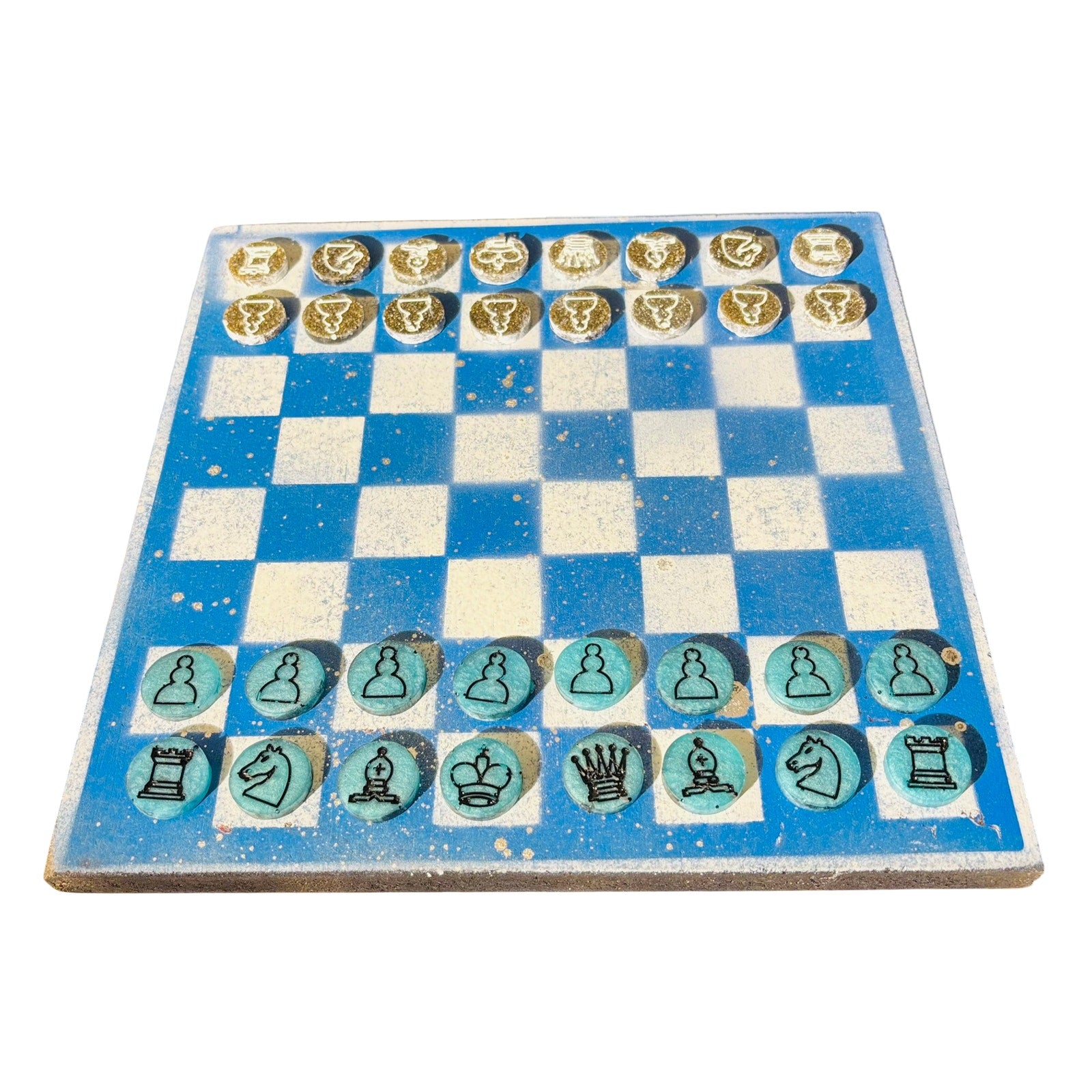 Introducing our exclusive Handcrafted Wooden Chess Set, meticulously designed with precision and care. Measuring 12 inches by 12 inches, this chess set features a beautifully painted Particle Board board that doubles as a work of art. Each set is a unique, one-of-a-kind creation, crafted by hand to ensure that no two sets are alike. Elevate your gaming experience with this exceptional chess set that combines vibrant design with the touch of artisan craftsmanship. This chess board comes with Resin chess pieces.