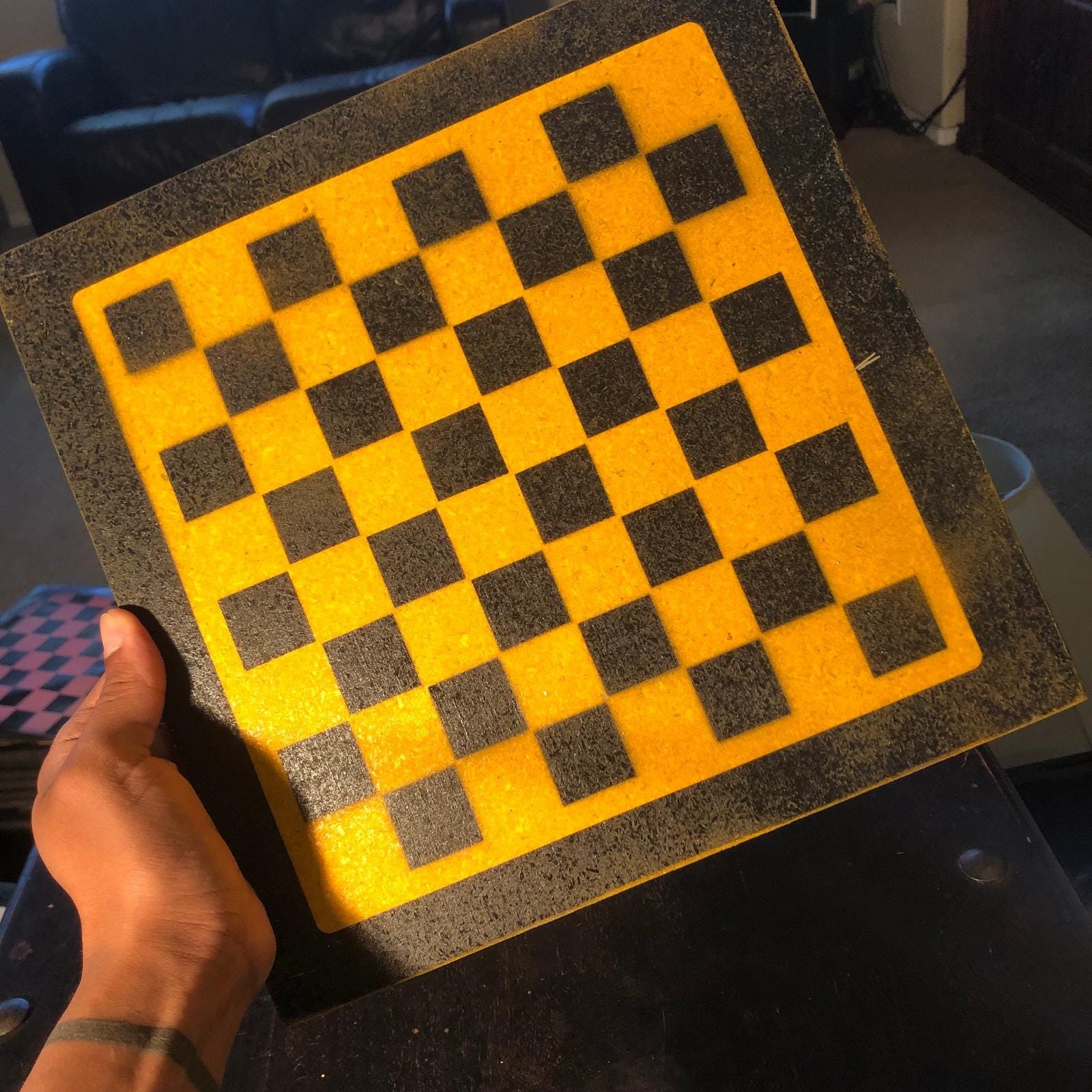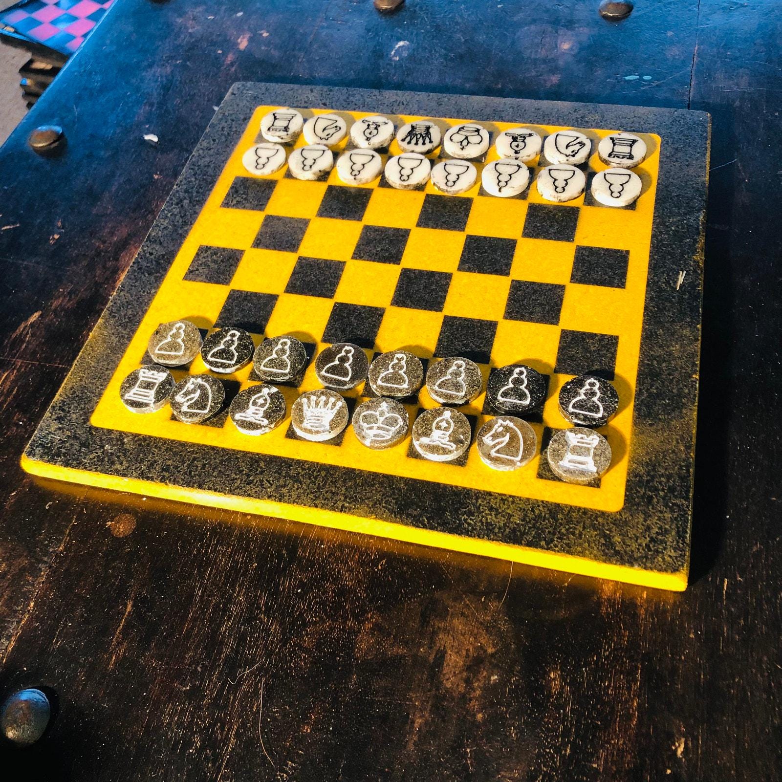 Introducing our exclusive Handcrafted Wooden Chess Set, meticulously designed with precision and care. Measuring 12 inches by 12 inches, this chess set features a beautifully painted Particle Board board that doubles as a work of art. Each set is a unique, one-of-a-kind creation, crafted by hand to ensure that no two sets are alike. Elevate your gaming experience with this exceptional chess set that combines vibrant design with the touch of artisan craftsmanship. This chess board comes with chess pieces.