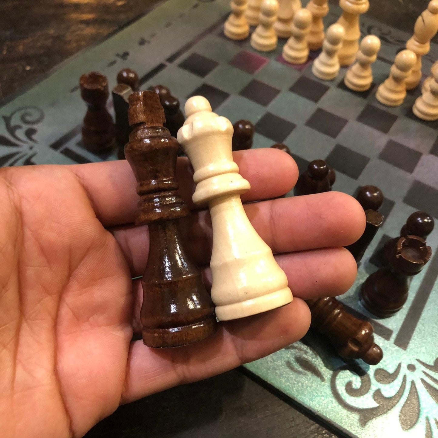 Introducing our exclusive Handcrafted Hardboard Chess Set, meticulously designed with precision and care. Measuring 12 inches by 12 inches, this chess set features a beautifully painted hardwood board that doubles as a work of art. Each set is a unique, one-of-a-kind creation, crafted by hand to ensure that no two sets are alike. Elevate your gaming experience with this exceptional chess set that combines vibrant design with the touch of artisan craftsmanship.
