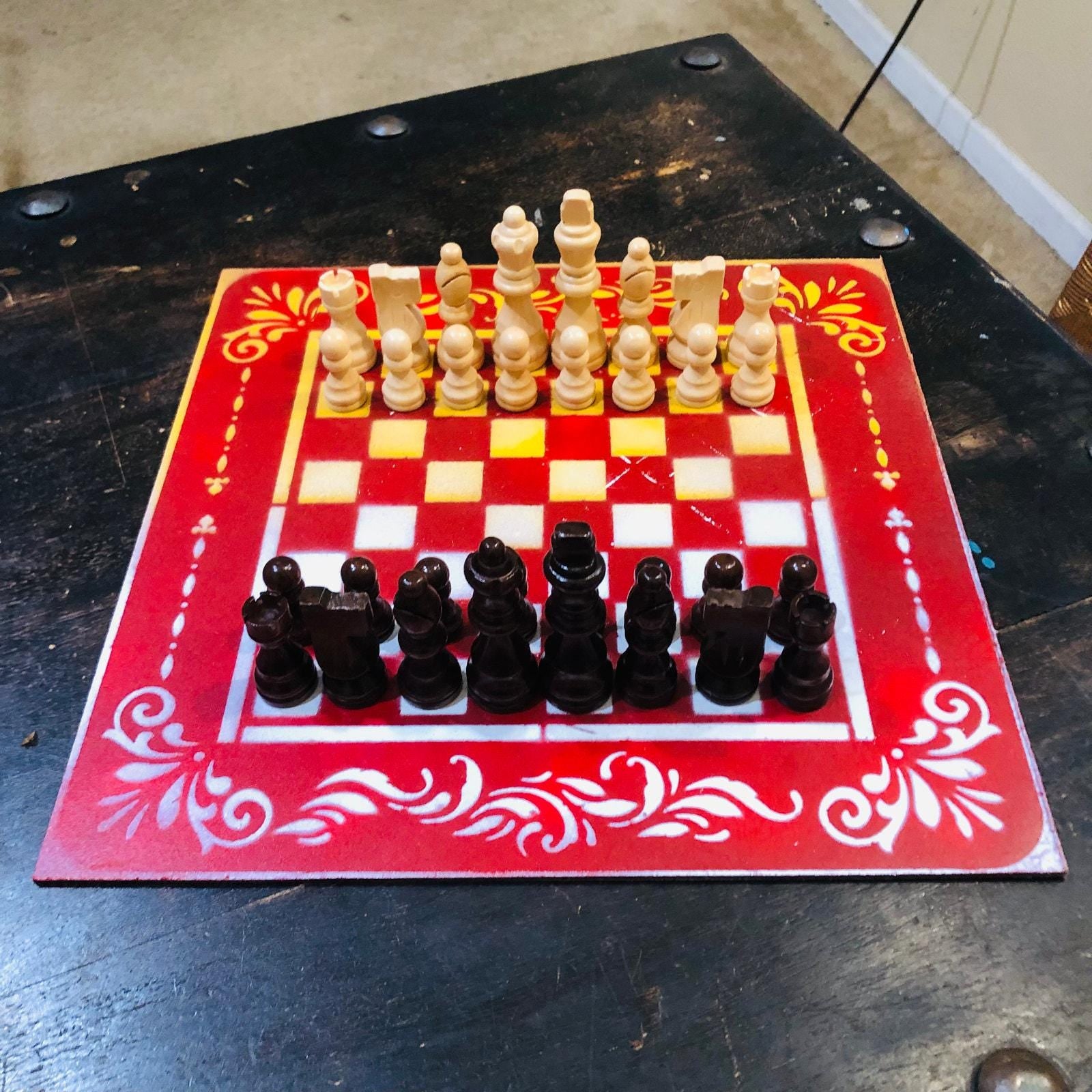 Introducing our exclusive Handcrafted Hardboard Chess Set, meticulously designed with precision and care. Measuring 12 inches by 12 inches, this chess set features a beautifully painted hardwood board that doubles as a work of art. Each set is a unique, one-of-a-kind creation, crafted by hand to ensure that no two sets are alike. Elevate your gaming experience with this exceptional chess set that combines vibrant design with the touch of artisan craftsmanship.