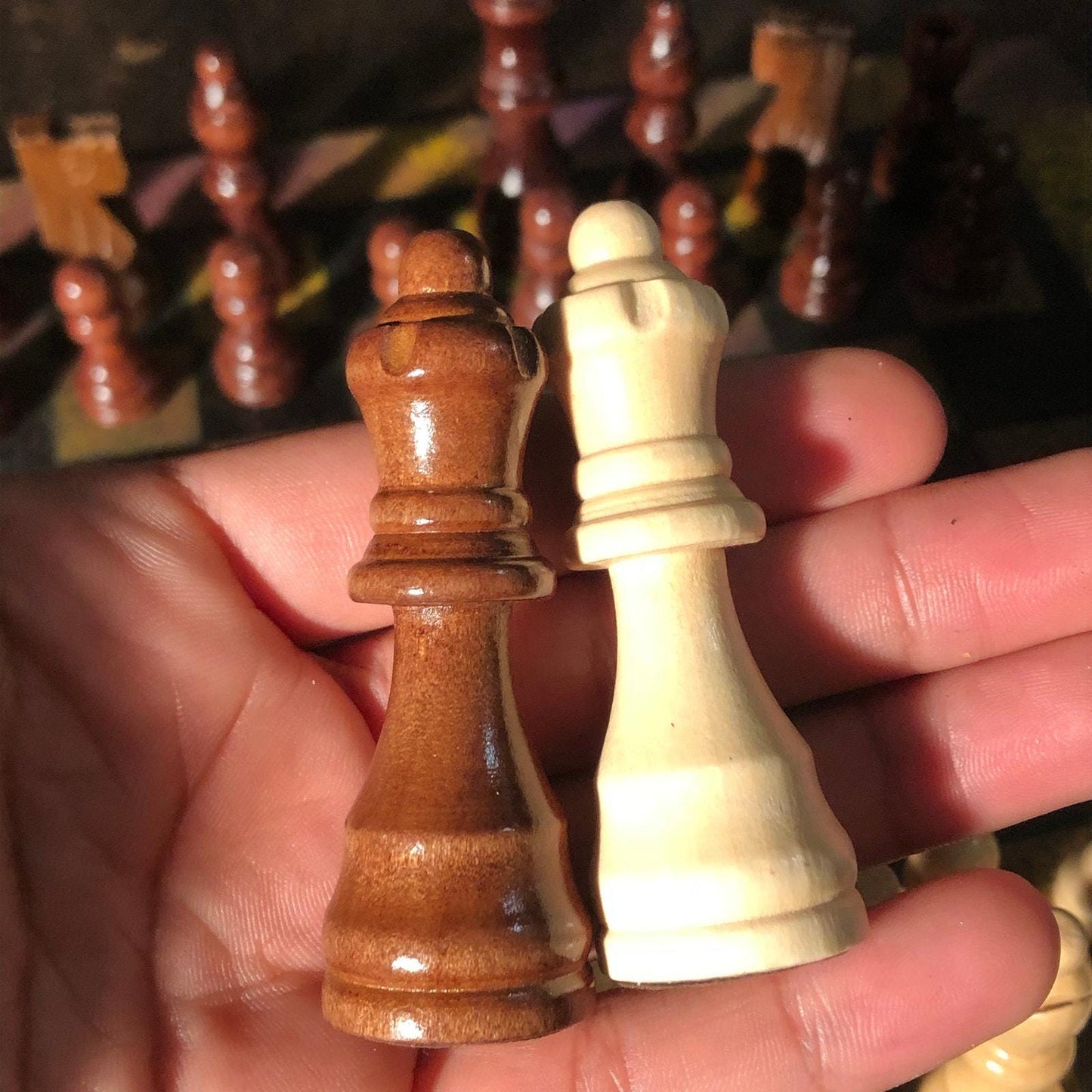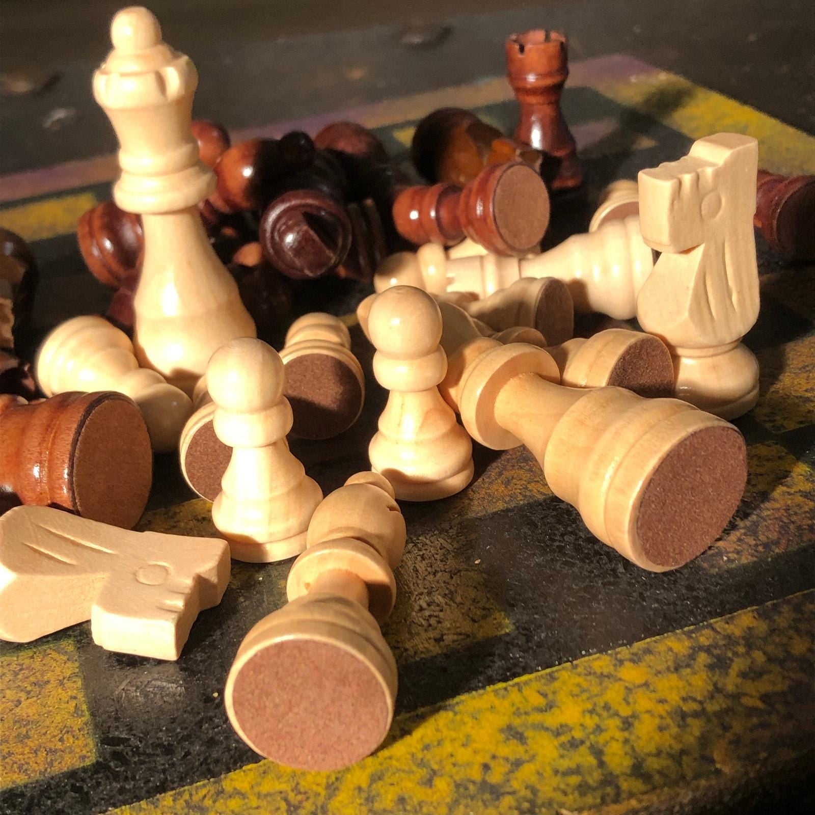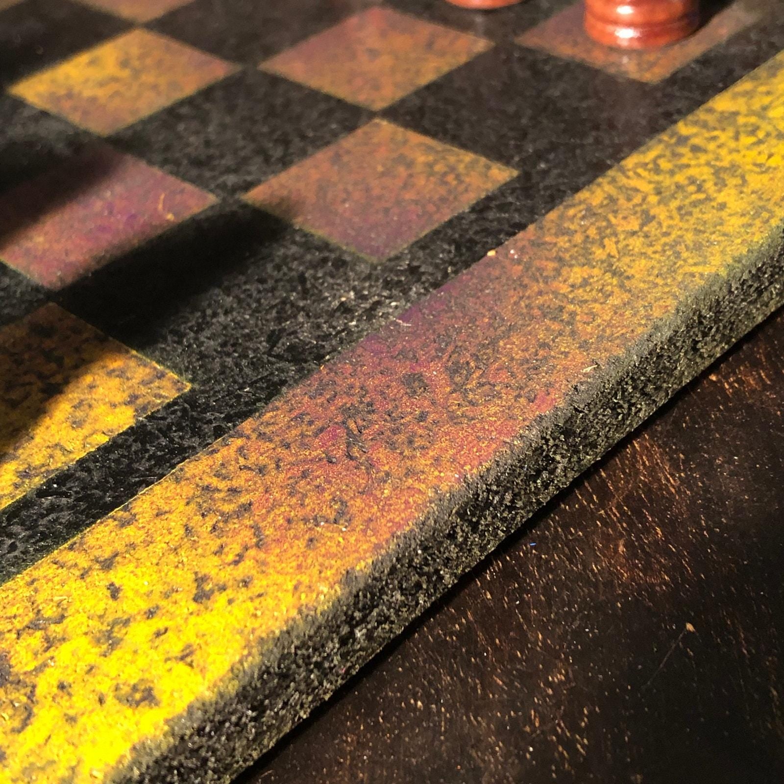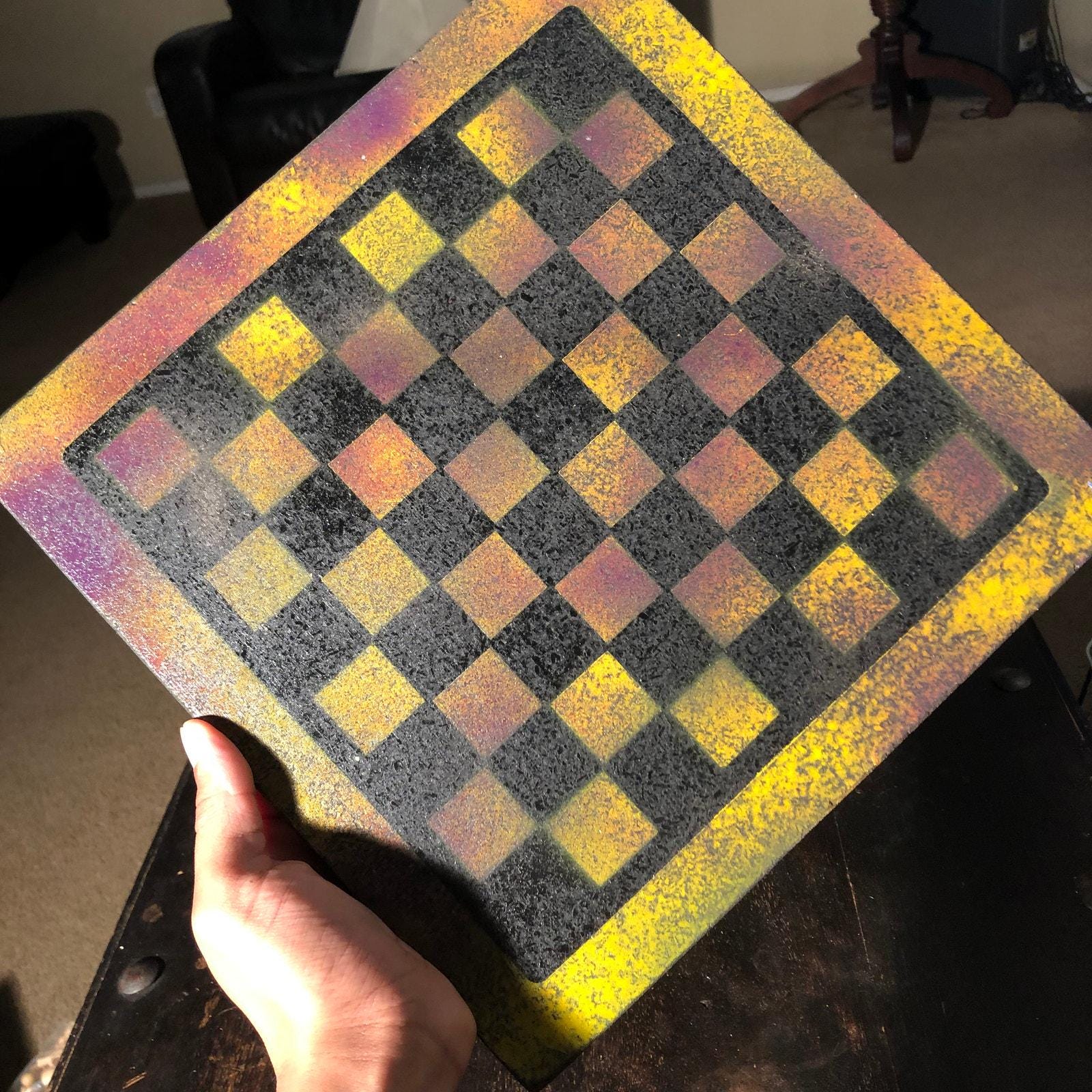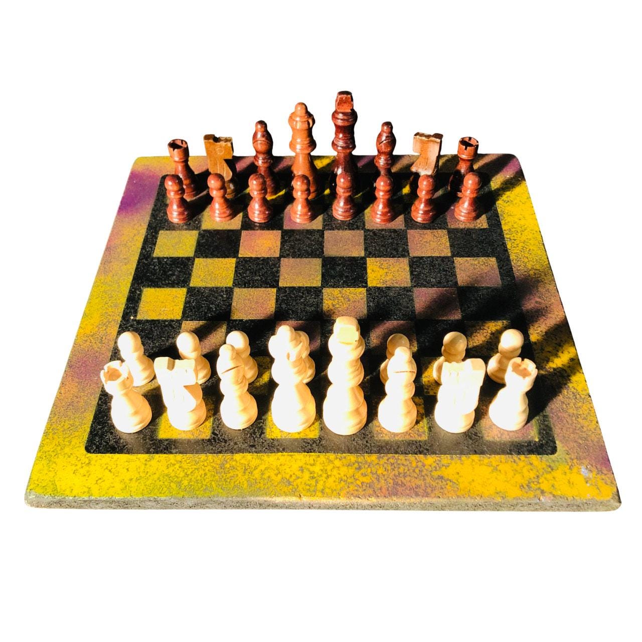 Introducing our exclusive Handcrafted Wooden Chess Set, meticulously designed with precision and care. Measuring 12 inches by 12 inches, this chess set features a beautifully painted Particle Board board that doubles as a work of art. Each set is a unique, one-of-a-kind creation, crafted by hand to ensure that no two sets are alike. Elevate your gaming experience with this exceptional chess set that combines vibrant design with the touch of artisan craftsmanship. This chess board comes with chess pieces.