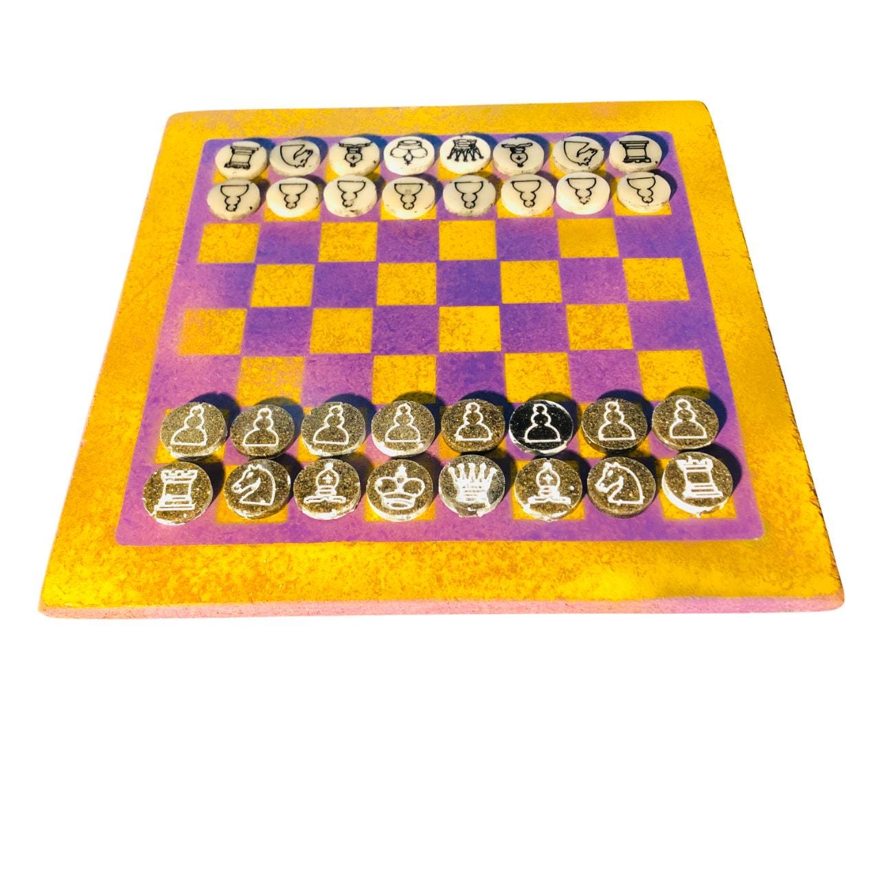 Introducing our exclusive Handcrafted Wooden Chess Set, meticulously designed with precision and care. Measuring 12 inches by 12 inches, this chess set features a beautifully painted Particle Board board that doubles as a work of art. Each set is a unique, one-of-a-kind creation, crafted by hand to ensure that no two sets are alike. Elevate your gaming experience with this exceptional chess set that combines vibrant design with the touch of artisan craftsmanship. This chess board comes with chess pieces.