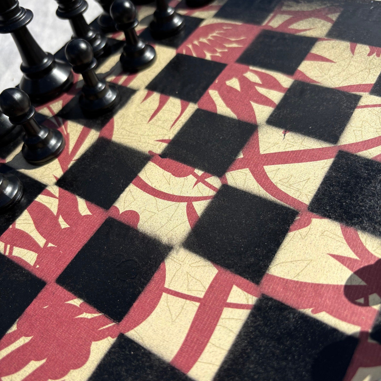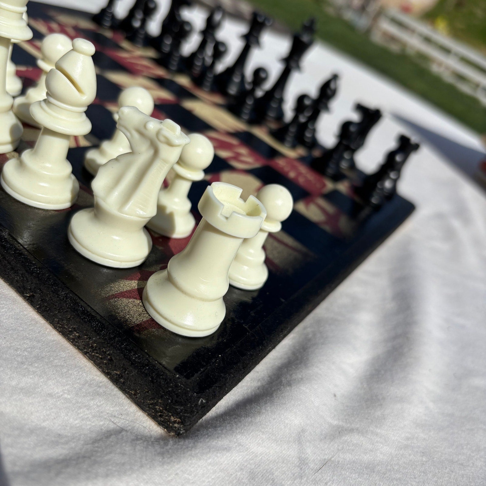 Introducing our exclusive Handcrafted Wooden Chess Set, meticulously designed with precision and care. Measuring 12 inches by 12 inches, this chess set features a beautifully painted particle board layered with a sheet of scrapbook paper board that doubles as a work of art. Each set is a unique, one-of-a-kind creation, crafted by hand to ensure that no two sets are alike. Elevate your gaming experience with this exceptional chess set that combines vibrant design with the touch of artisan craftsmanship. This chess board comes with chess pieces and is handcrafted as a one of one