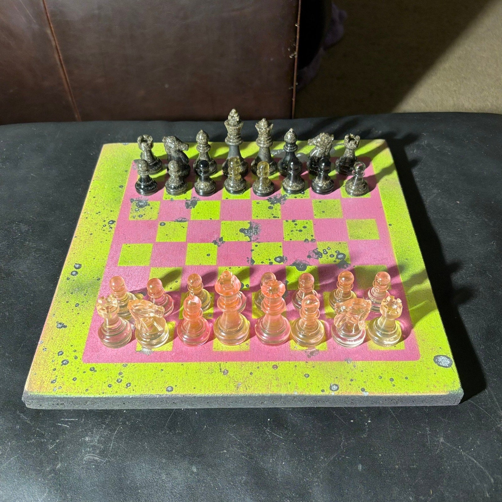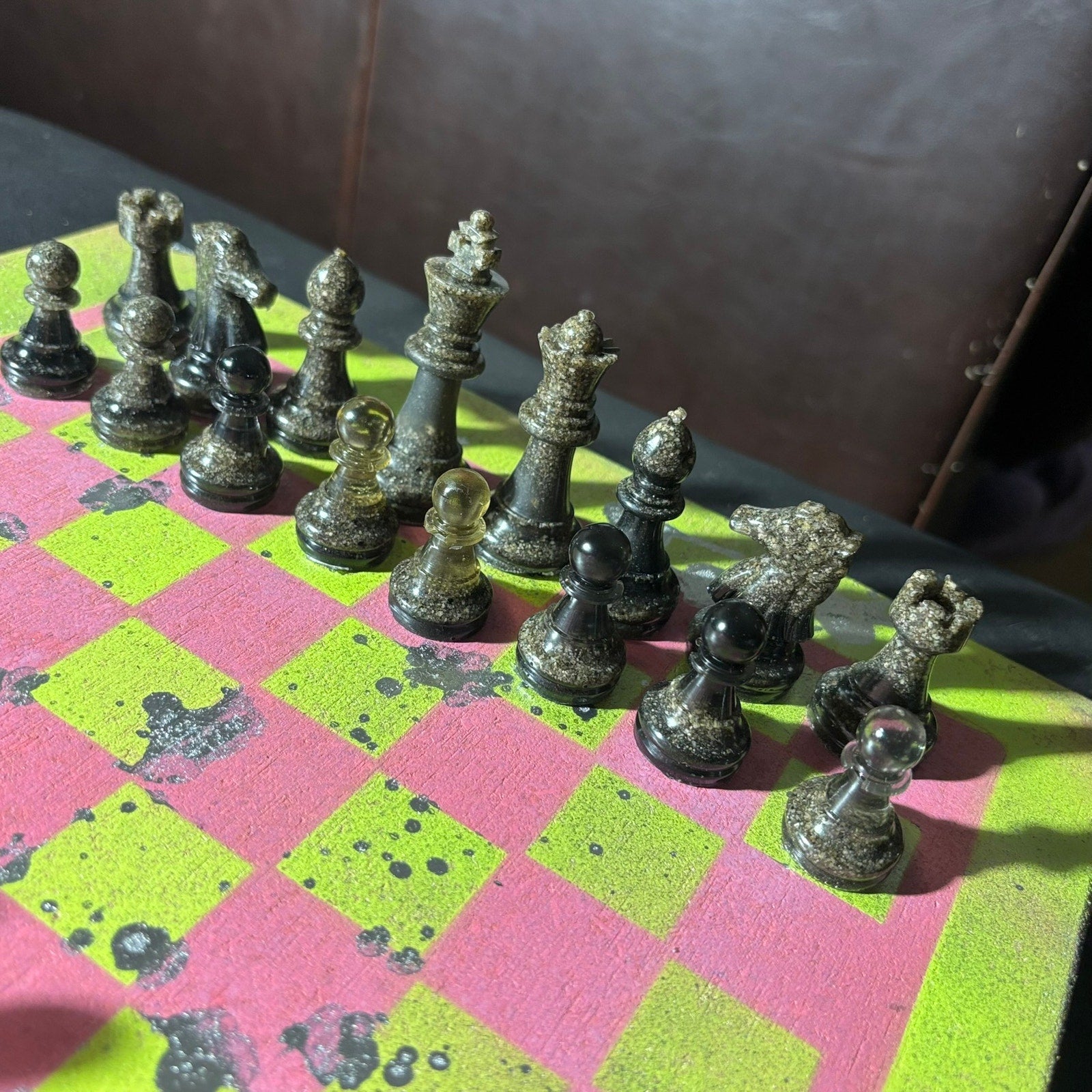 Introducing our exclusive Handcrafted Wooden Chess Set, meticulously designed with precision and care. Measuring 12 inches by 12 inches, this chess set features a beautifully painted Particle Board board that doubles as a work of art. Each set is a unique, one-of-a-kind creation, crafted by hand to ensure that no two sets are alike. Elevate your gaming experience with this exceptional chess set that combines vibrant design with the touch of artisan craftsmanship. This chess board comes with Resin chess pieces.