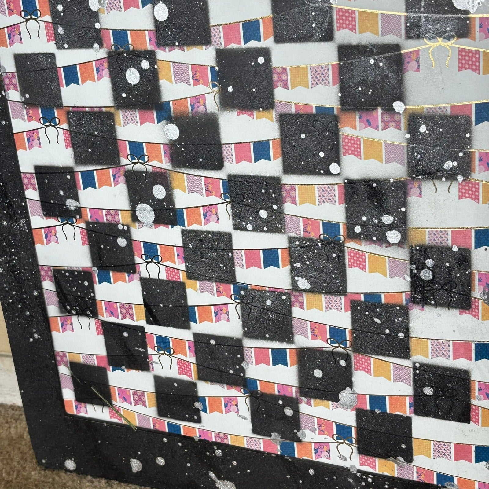 The board is crafted from durable particle board, painted with care to create the classic chess square pattern. What makes this board special is the unique 12x12 piece of scrapbook paper inlaid in the center, adding a personal touch to your game.