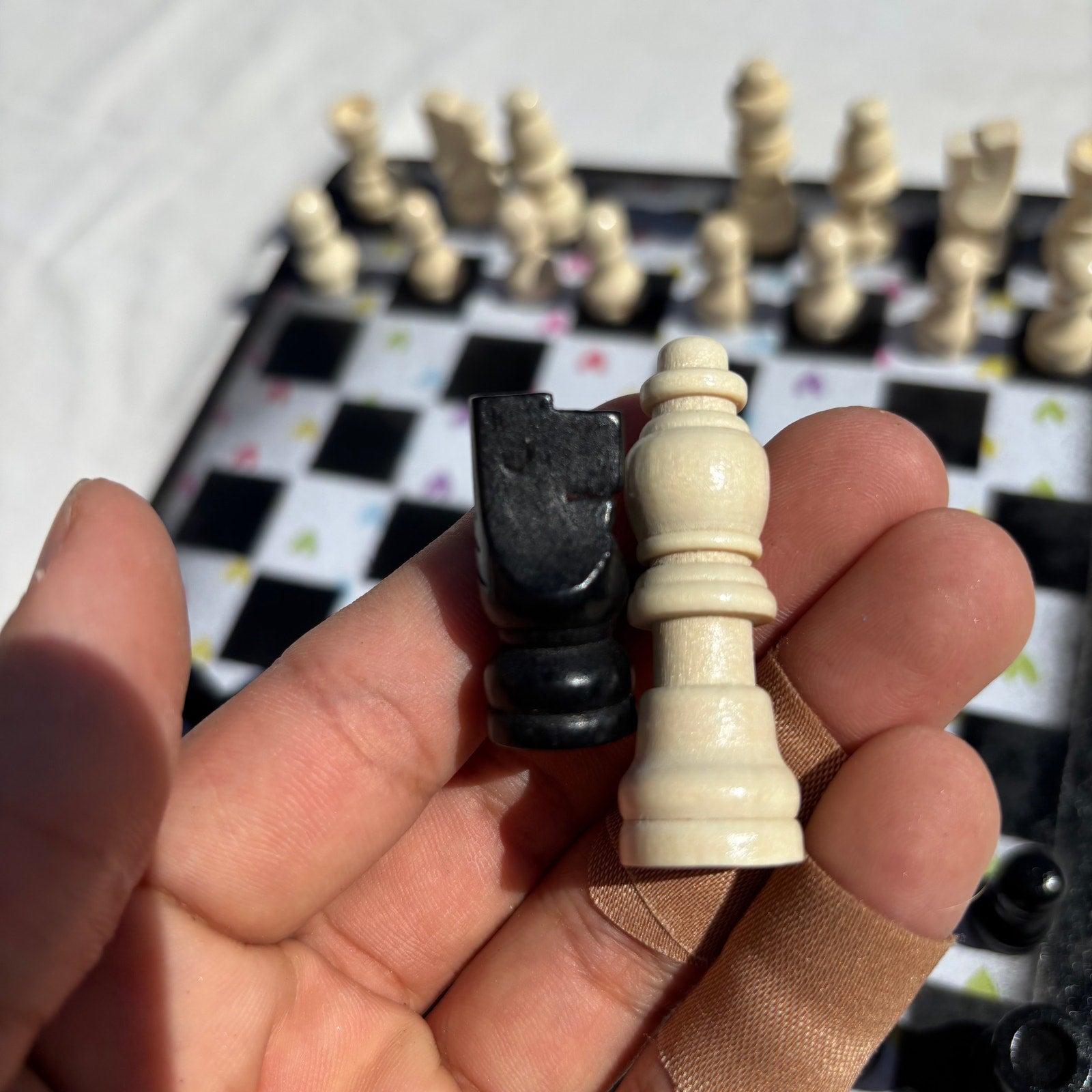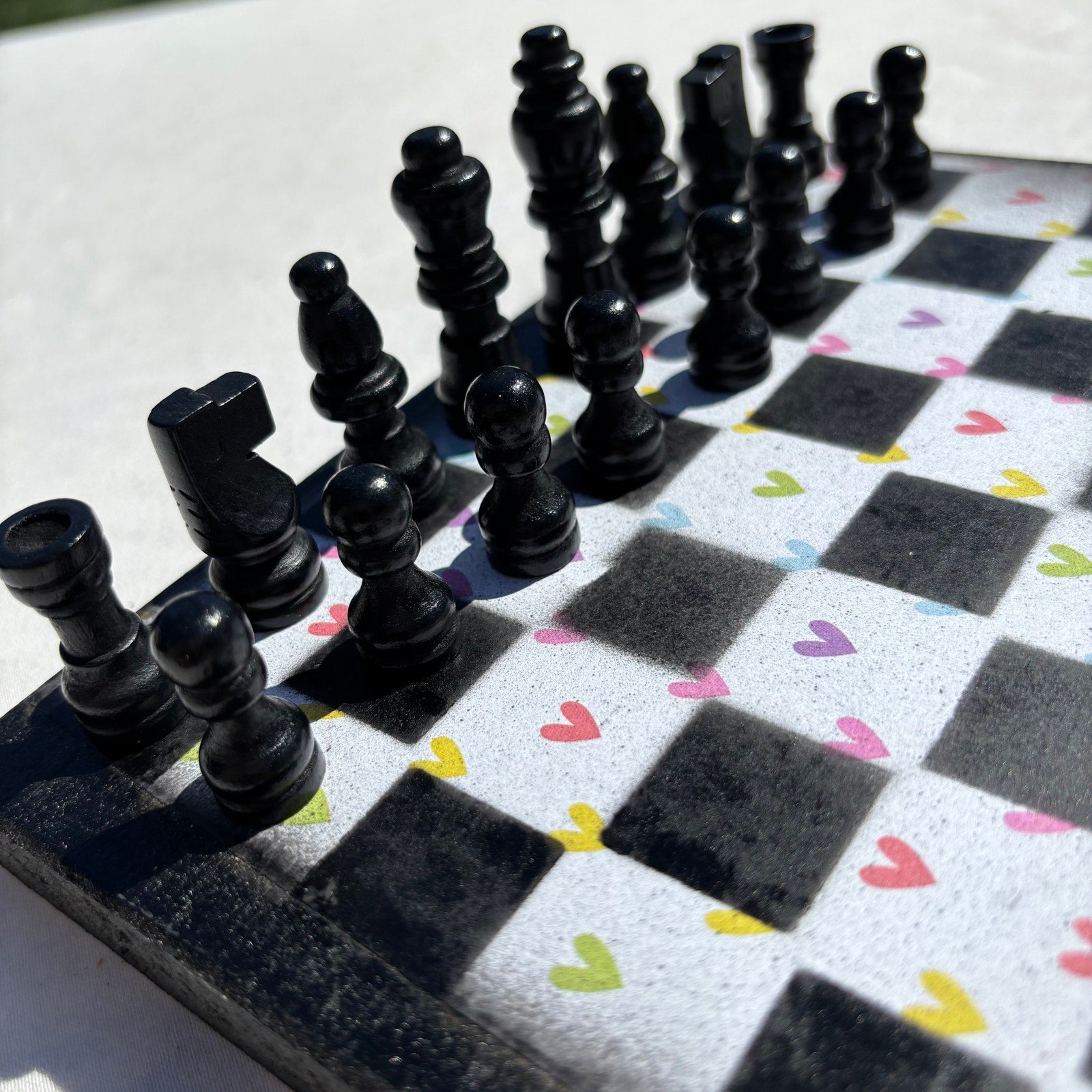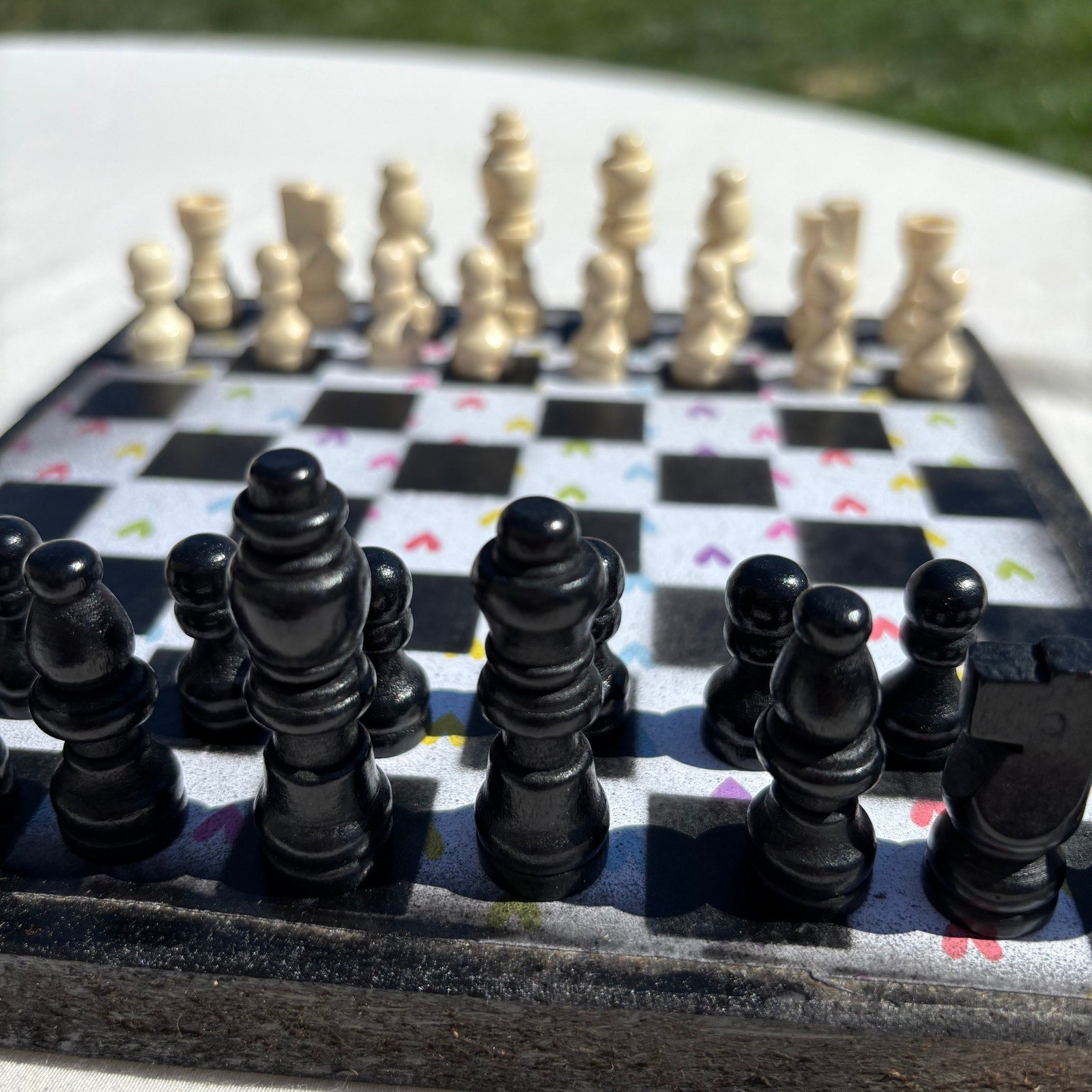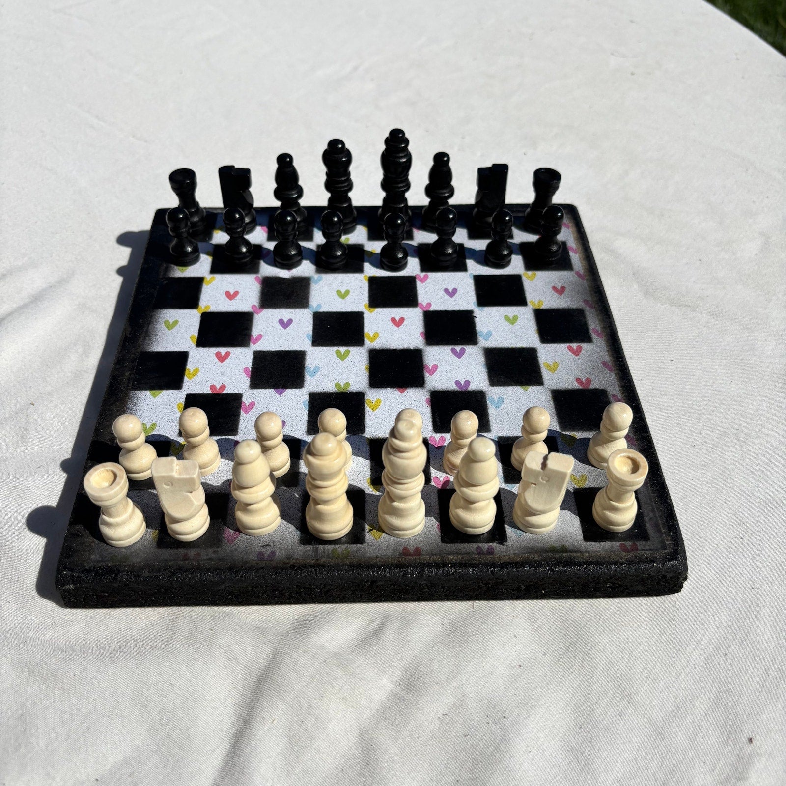 Introducing our exclusive Handcrafted Wooden Chess Set, meticulously designed with precision and care. Measuring 8 inches by 8 inches, this chess set features a beautifully painted particle board layered with a sheet of scrapbook paper board that doubles as a work of art. Each set is a unique, one-of-a-kind creation, crafted by hand to ensure that no two sets are alike. Elevate your gaming experience with this exceptional chess set that combines vibrant design with the touch of artisan craftsmanship. This chess board comes with chess pieces and is handcrafted as a one of one