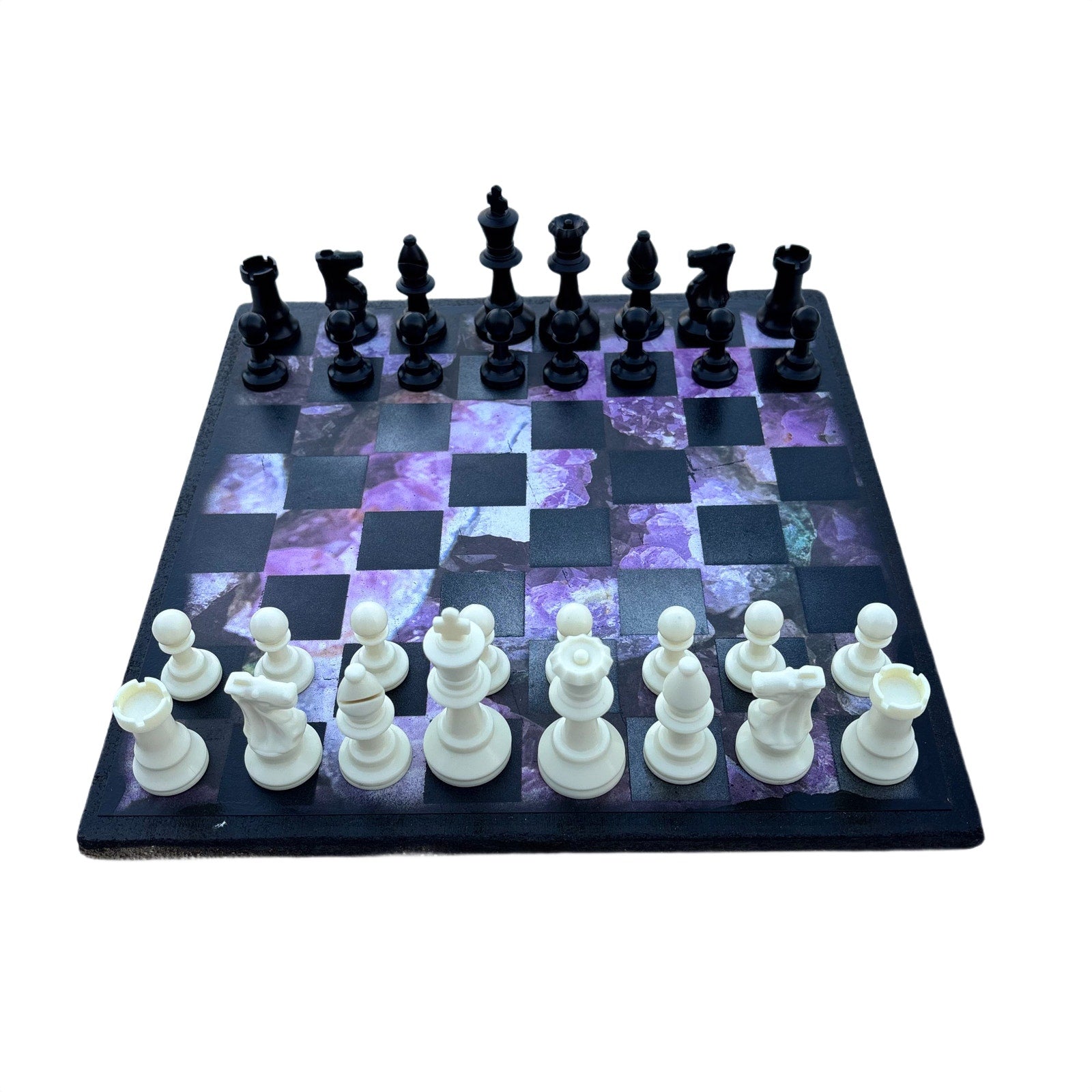 Introducing our exclusive Handcrafted Wooden Chess Set, meticulously designed with precision and care. Measuring 12 inches by 12 inches, this chess set features a beautifully painted particle board layered with a sheet of scrapbook paper board that doubles as a work of art. Each set is a unique, one-of-a-kind creation, crafted by hand to ensure that no two sets are alike. Elevate your gaming experience with this exceptional chess set that combines vibrant design with the touch of artisan craftsmanship. This chess board comes with chess pieces and is handcrafted as a one of one