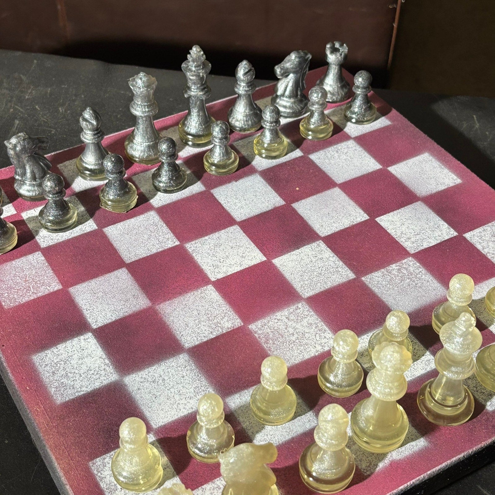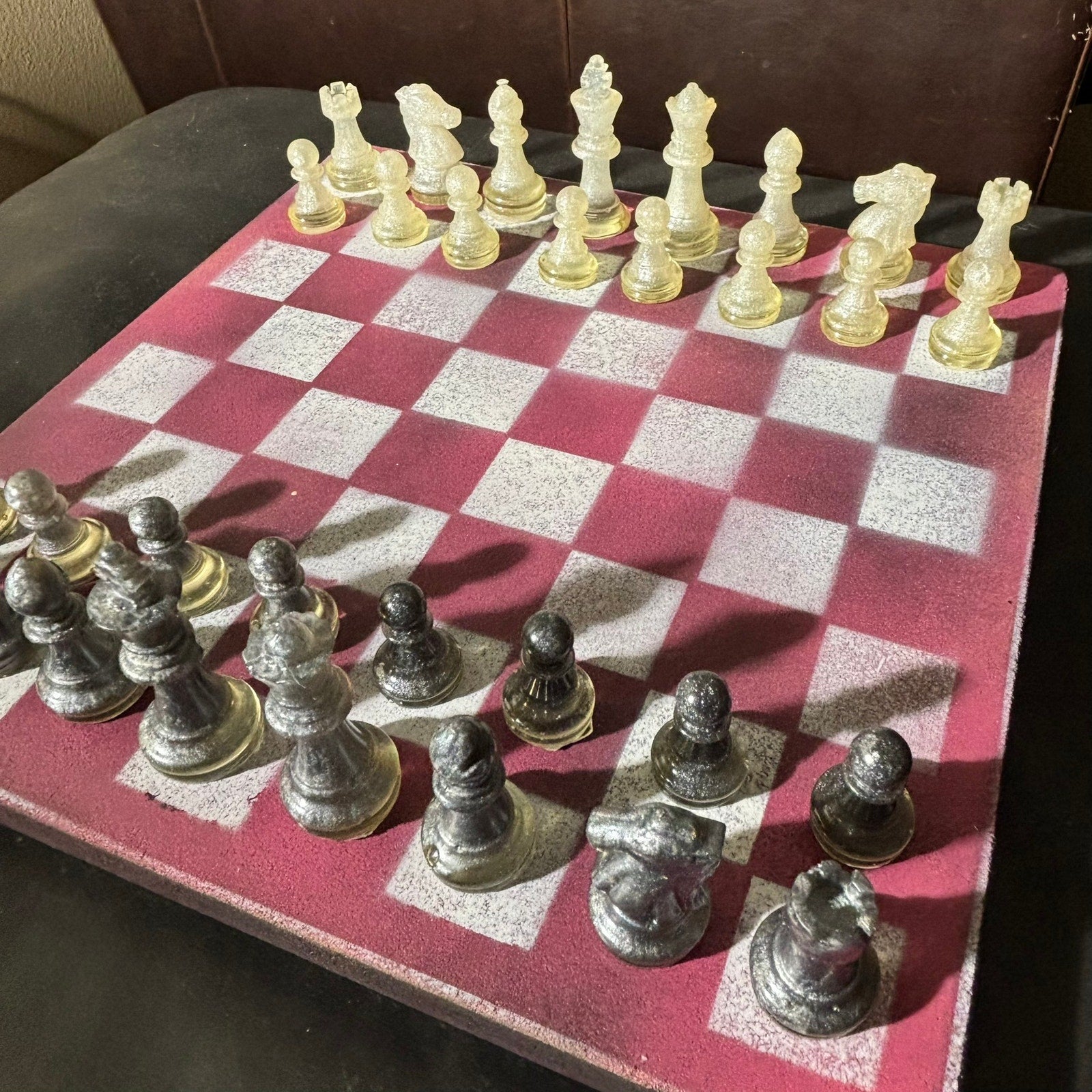 Introducing our exclusive Handcrafted Wooden Chess Set, meticulously designed with precision and care. Measuring 12 inches by 12 inches, this chess set features a beautifully painted Particle Board board that doubles as a work of art. Each set is a unique, one-of-a-kind creation, crafted by hand to ensure that no two sets are alike. Elevate your gaming experience with this exceptional chess set that combines vibrant design with the touch of artisan craftsmanship. This chess board comes with Resin chess pieces.