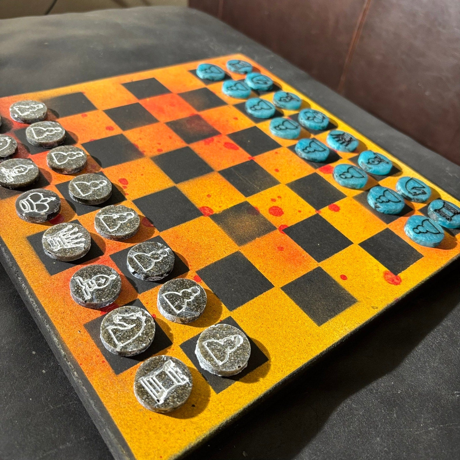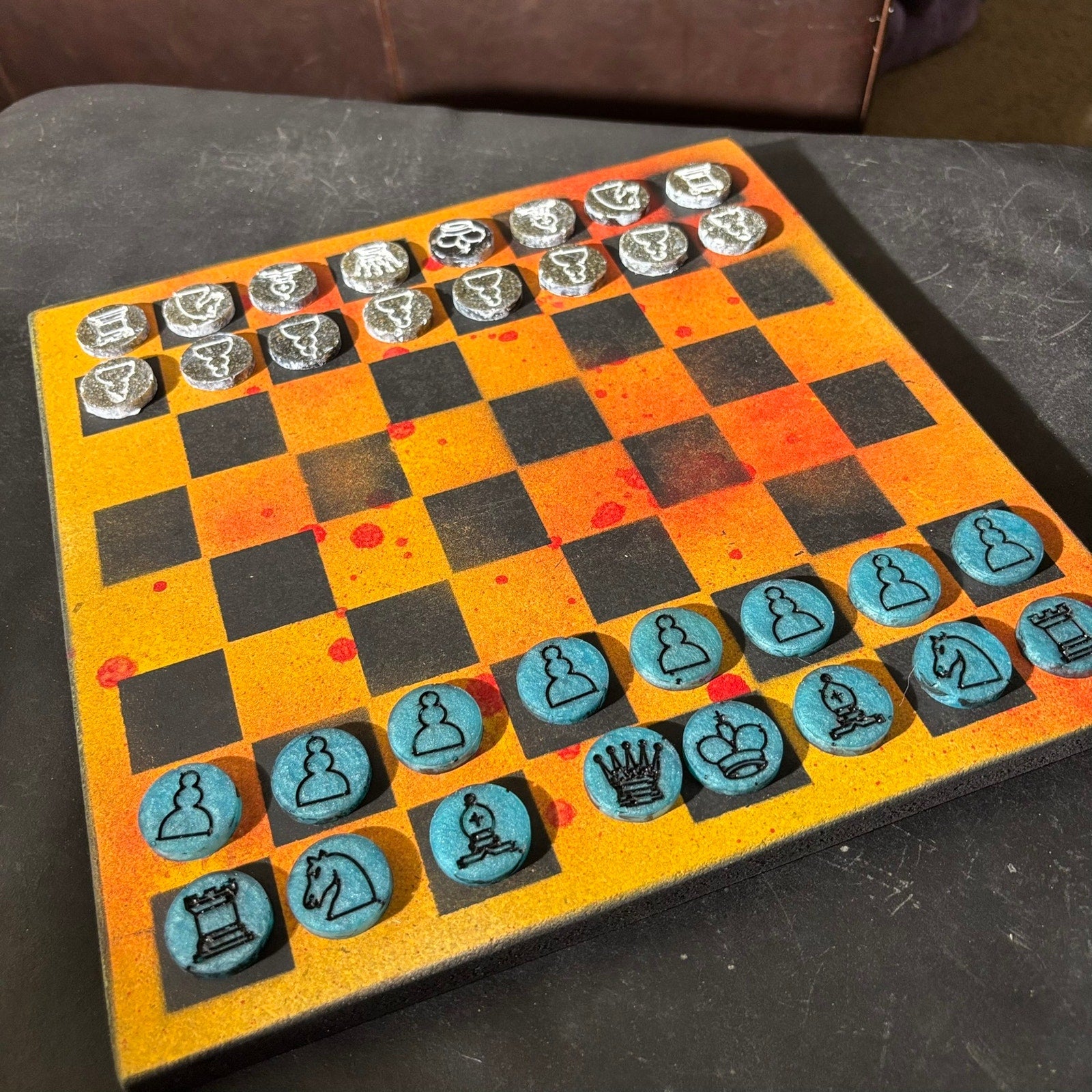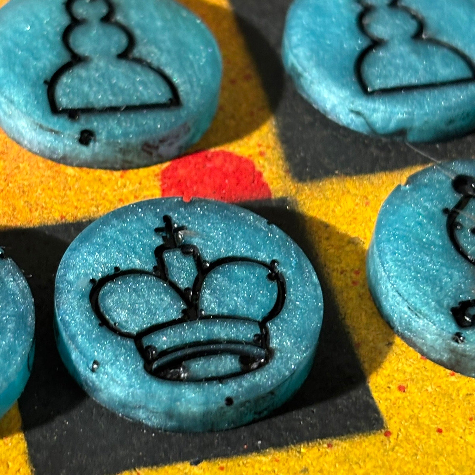 Introducing our exclusive Handcrafted Wooden Chess Set, meticulously designed with precision and care. Measuring 12 inches by 12 inches, this chess set features a beautifully painted Particle Board board that doubles as a work of art. Each set is a unique, one-of-a-kind creation, crafted by hand to ensure that no two sets are alike. Elevate your gaming experience with this exceptional chess set that combines vibrant design with the touch of artisan craftsmanship. This chess board comes with Resin chess pieces.
