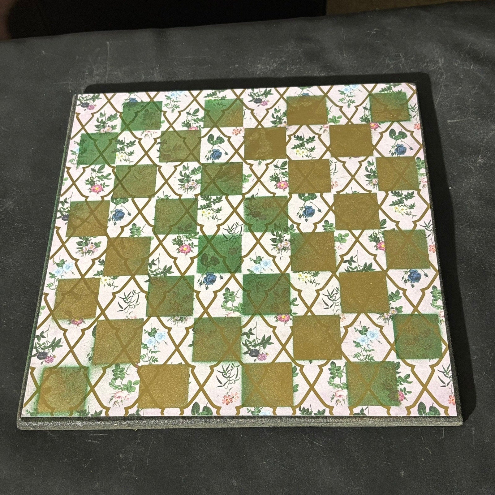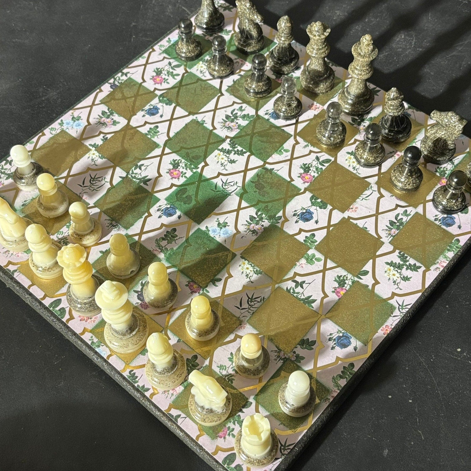 Introducing our exclusive Handcrafted Wooden Chess Set, meticulously designed with precision and care. Measuring 12 inches by 12 inches, this chess set features a beautifully painted particle board layered with a sheet of scrapbook paper board that doubles as a work of art. Each set is a unique, one-of-a-kind creation, crafted by hand to ensure that no two sets are alike. Elevate your gaming experience with this exceptional chess set that combines vibrant design with the touch of artisan craftsmanship. This chess board comes with chess pieces and is handcrafted as a one of one
