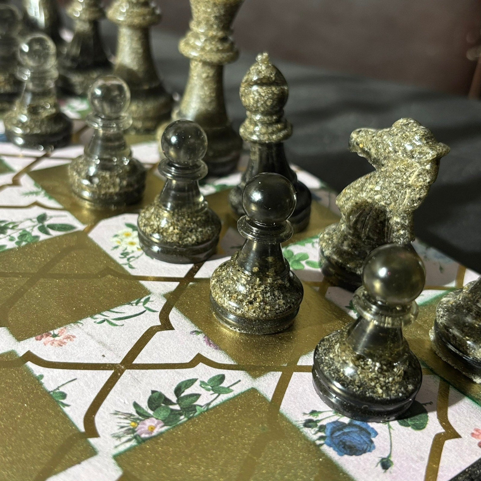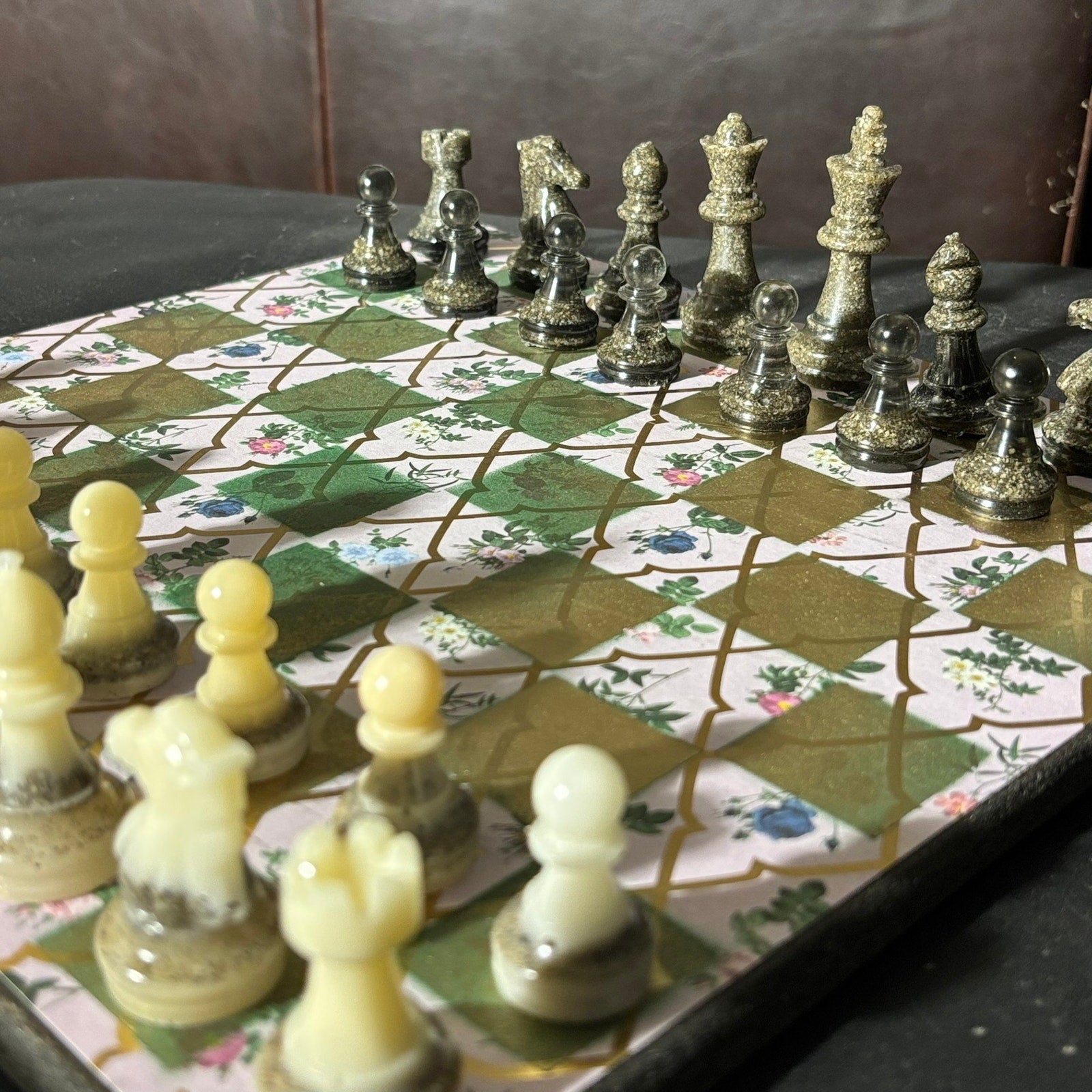 *** PLEASE READ: The resin pieces that have clear transparent parts will slowly turn royal amber as time goes on (Clear see through resin turn amber with time). Most of the sets are solid or colored so there is no need to expect a change at all, but some have clear transparent bottoms that will turn amber. I write this because some of our chess sets may not sell for a year or two and the photos are taken when the item is listed online. Meaning the photos will have slight difference. Rest assured, the amber is beautiful and vintage!