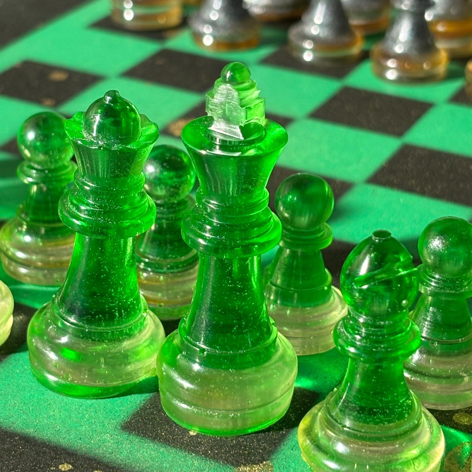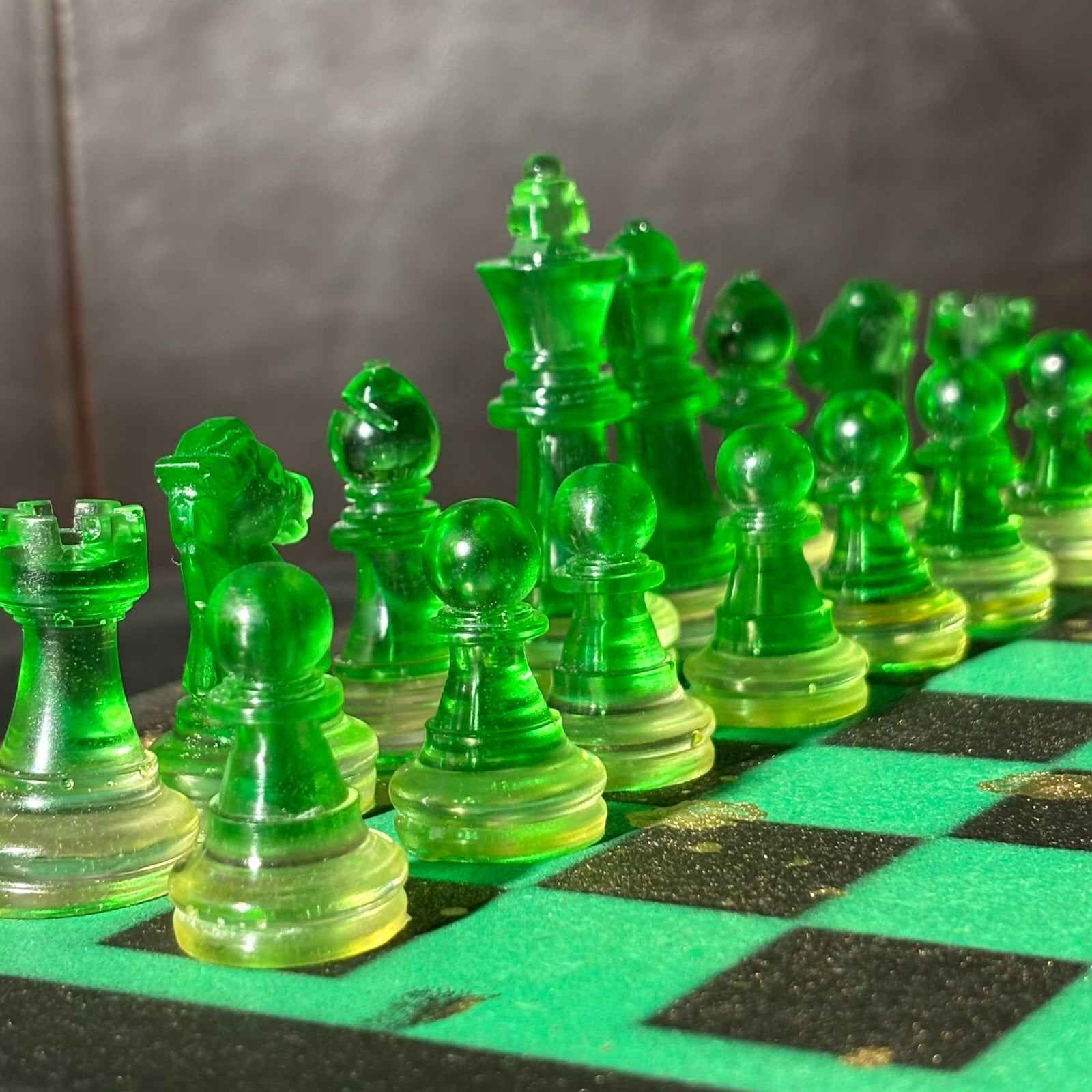 *** PLEASE READ: The resin pieces that have clear transparent parts will slowly turn royal amber as time goes on (Clear see through resin turn amber with time). Most of the sets are solid or colored so there is no need to expect a change at all, but some have clear transparent bottoms that will turn amber. I write this because some of our chess sets may not sell for a year or two and the photos are taken when the item is listed online. Meaning the photos will have slight difference. Rest assured, the amber is beautiful and vintage!