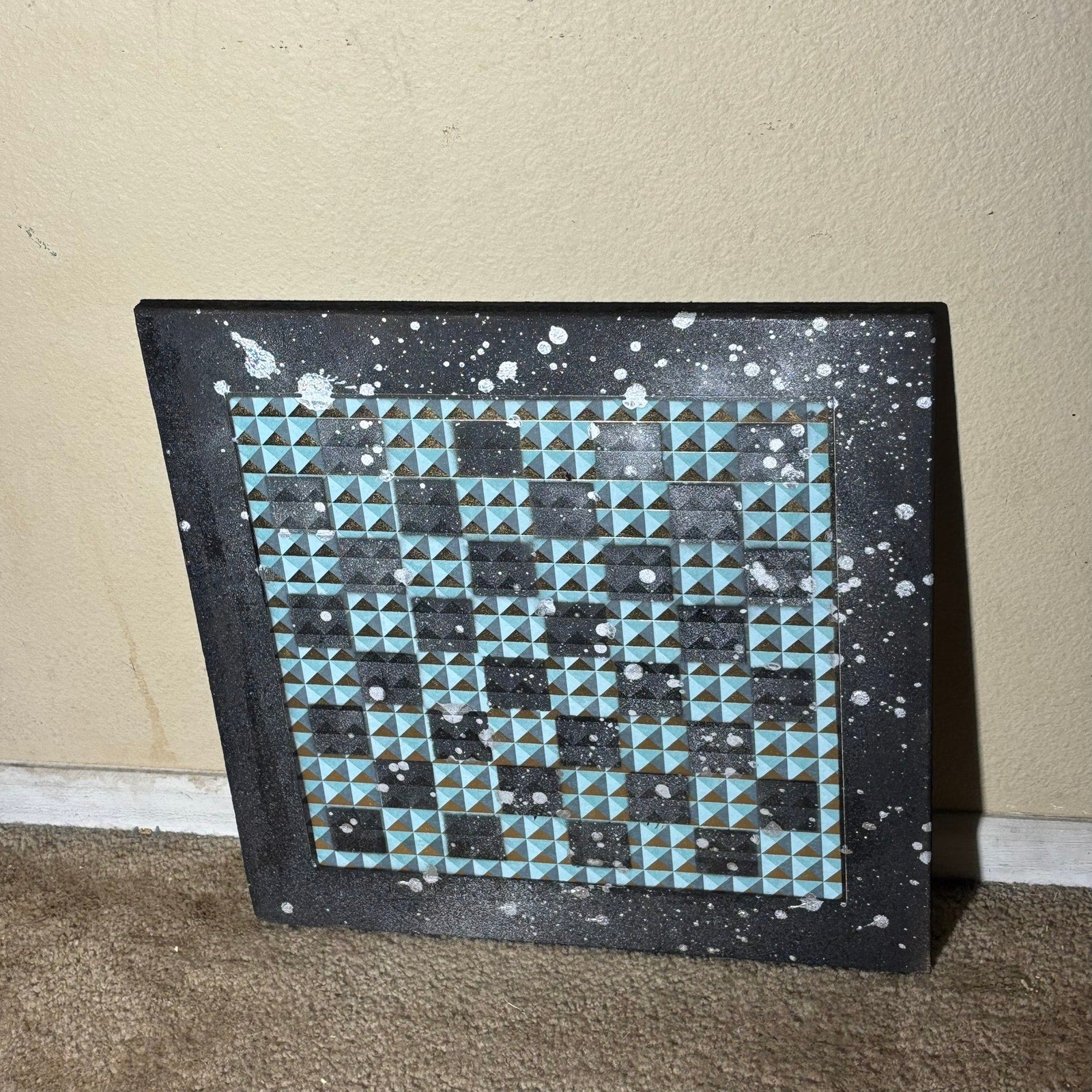 The board is crafted from durable particle board, painted with care to create the classic chess square pattern. What makes this board special is the unique 12x12 piece of scrapbook paper inlaid in the center, adding a personal touch to your game.