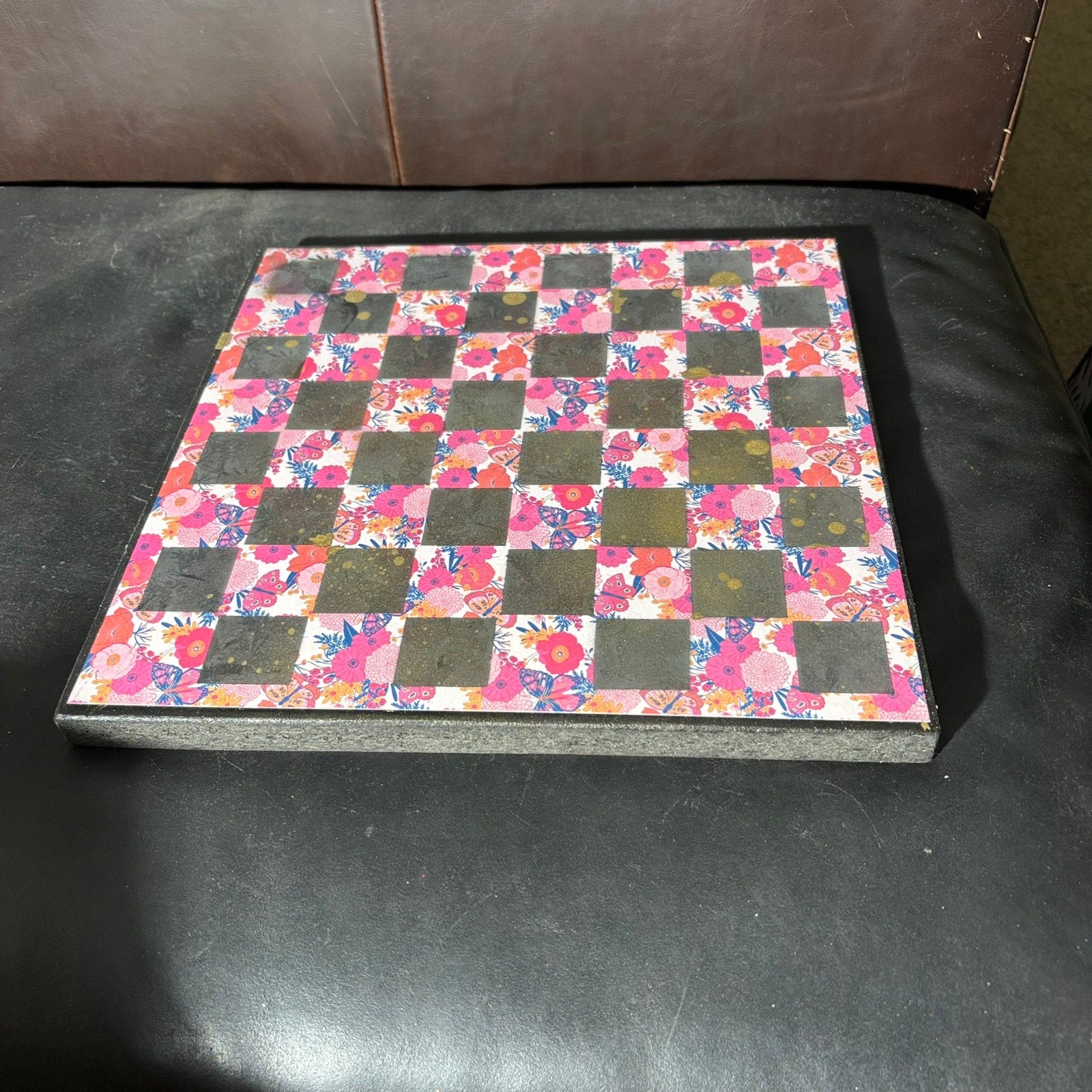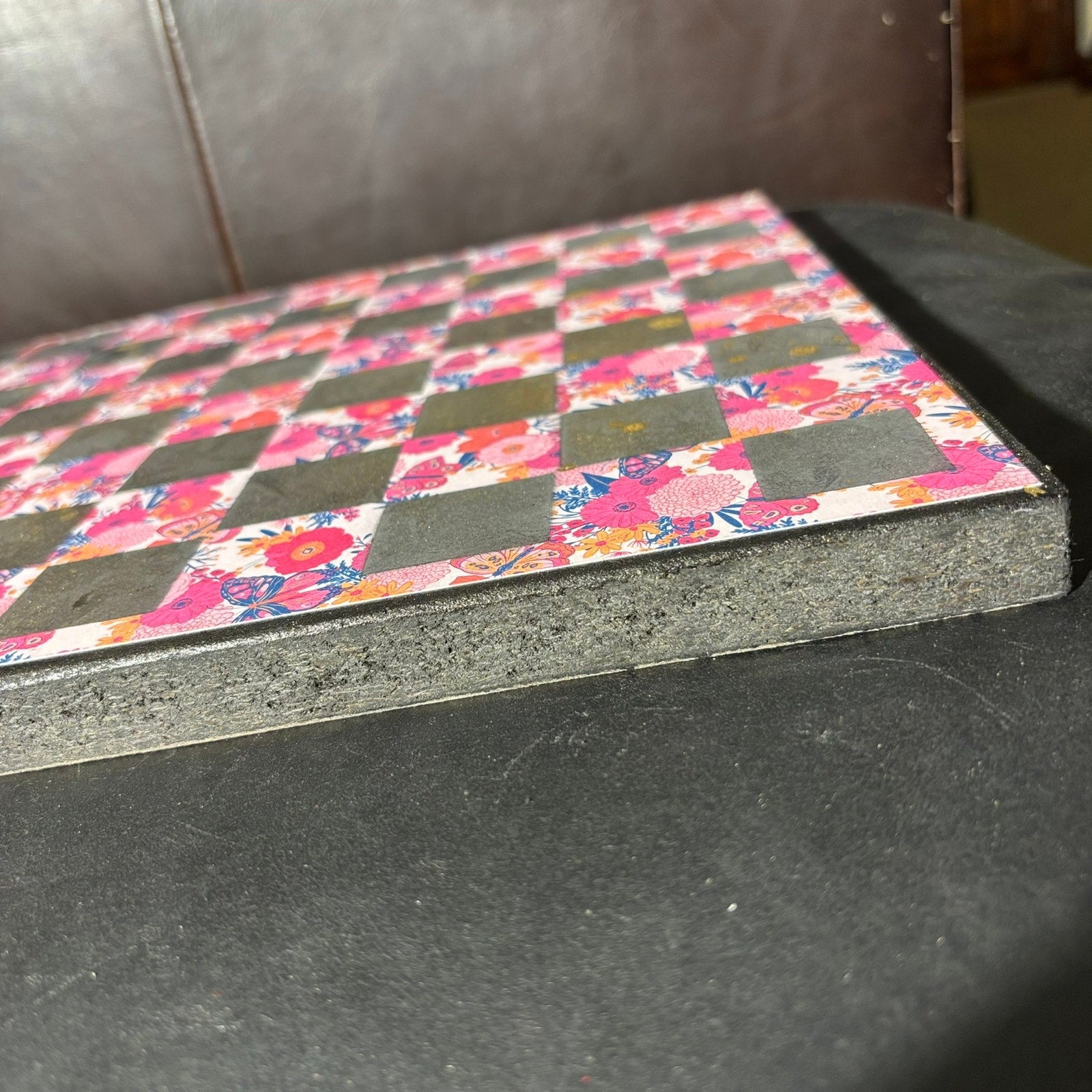 Each board features a layer of beautifully Scrapbook Paper Fused/Glued with particle board to give it a unique pretty pattern. We then paint squares onto the board to make them into fabulous chess boards. Made with a sturdy particle board base and smooth, beveled edges, this board is stunning.