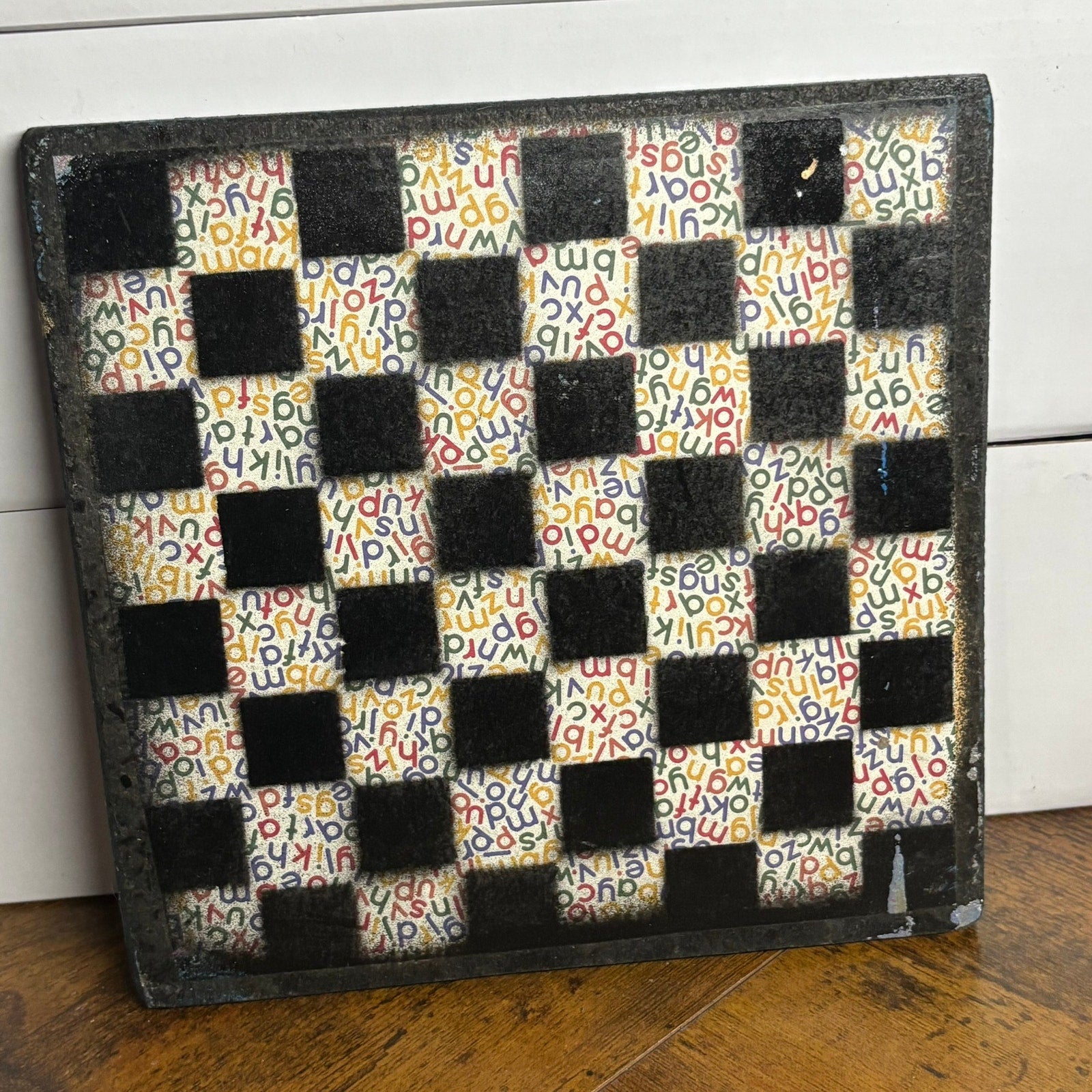 This is a one-of-a-kind, hand-painted chess board that will add a touch of artistry to your game. These are spray painted particle boards and have a double side. One side is painted and the backside is lined with scrapbook paper and has a different design. (The Scrapbook paper part is not meant to be played on but you can!)