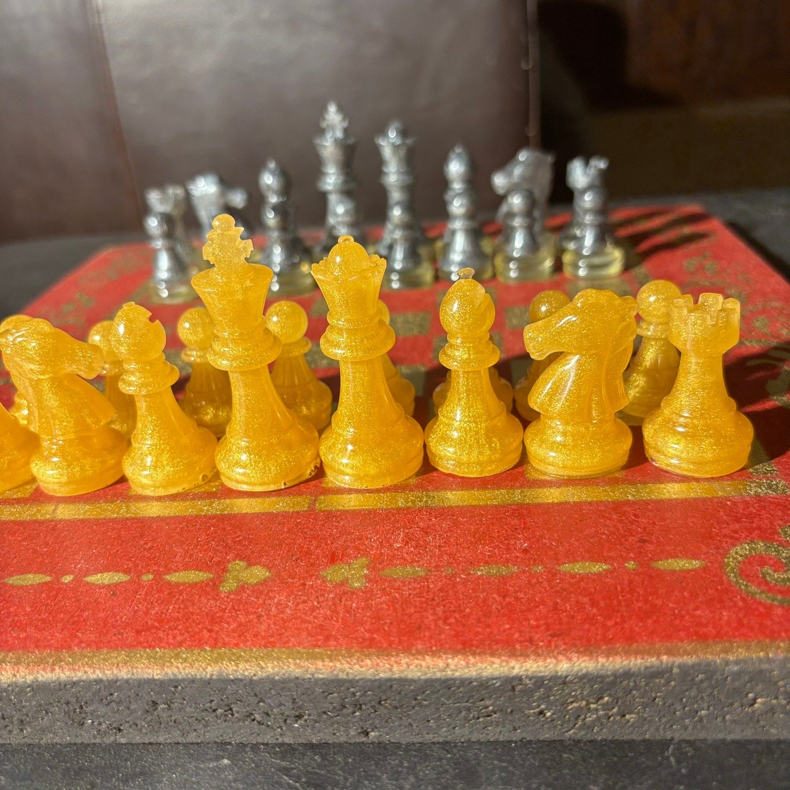 *** PLEASE READ: The resin pieces that have clear transparent parts will slowly turn royal amber as time goes on (Clear see through resin turn amber with time). Most of the sets are solid or colored so there is no need to expect a change at all, but some have clear transparent bottoms that will turn amber. I write this because some of our chess sets may not sell for a year or two and the photos are taken when the item is listed online. Meaning the photos will have slight difference. Rest assured, the amber is beautiful and vintage!