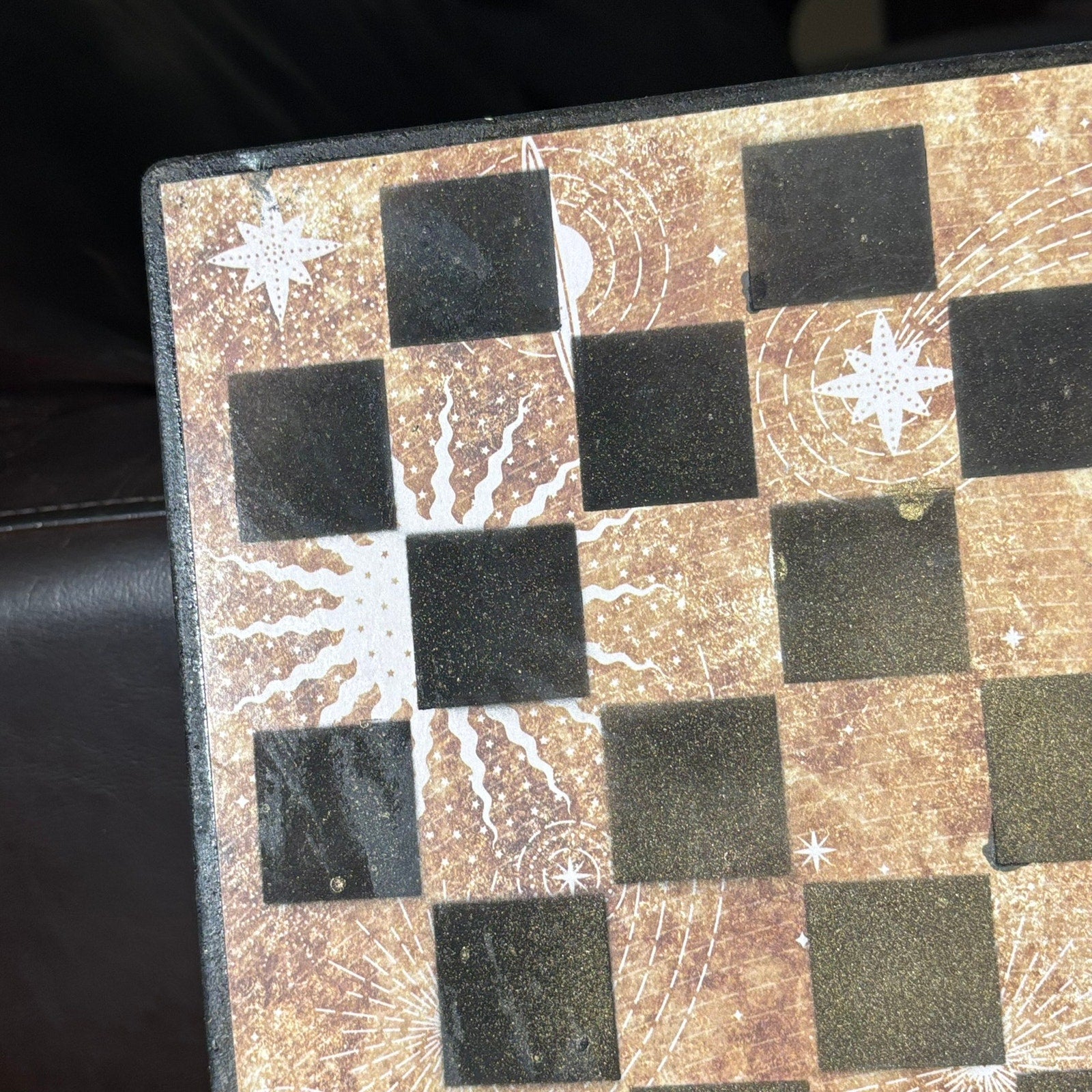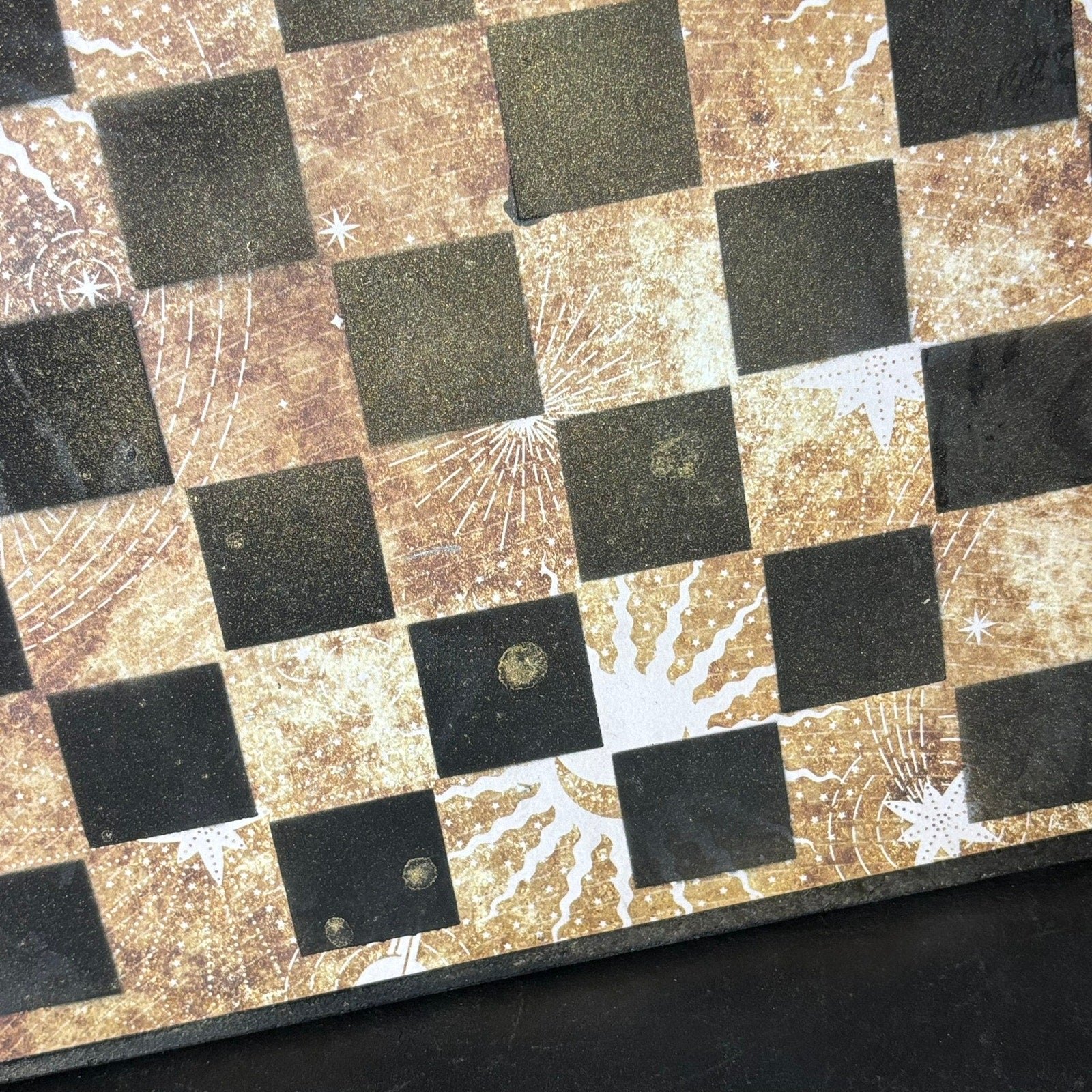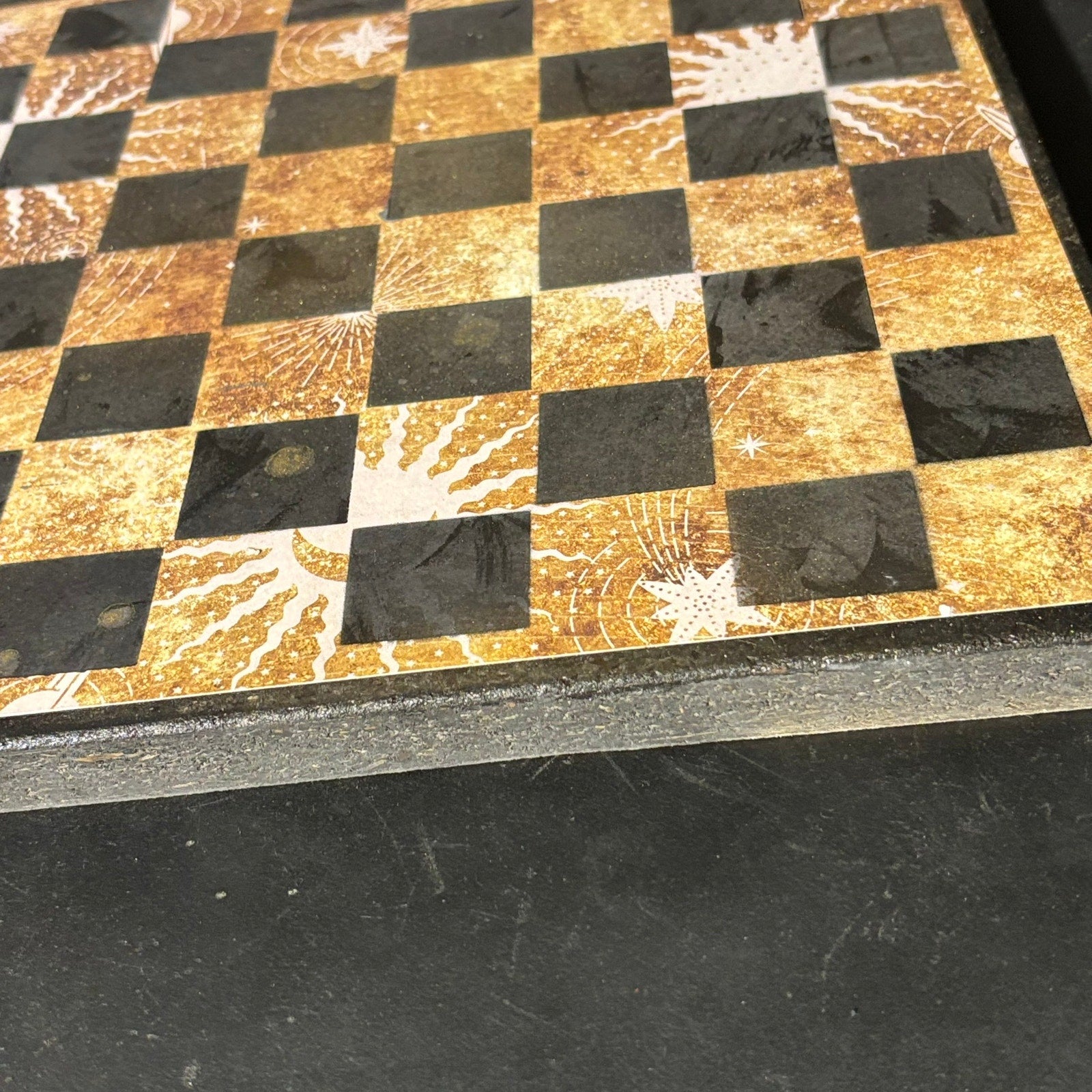 Each board features a layer of beautifully Scrapbook Paper Fused/Glued with particle board to give it a unique pretty pattern. We then paint squares onto the board to make them into fabulous chess boards. Made with a sturdy particle board base and smooth, beveled edges, this board is stunning.