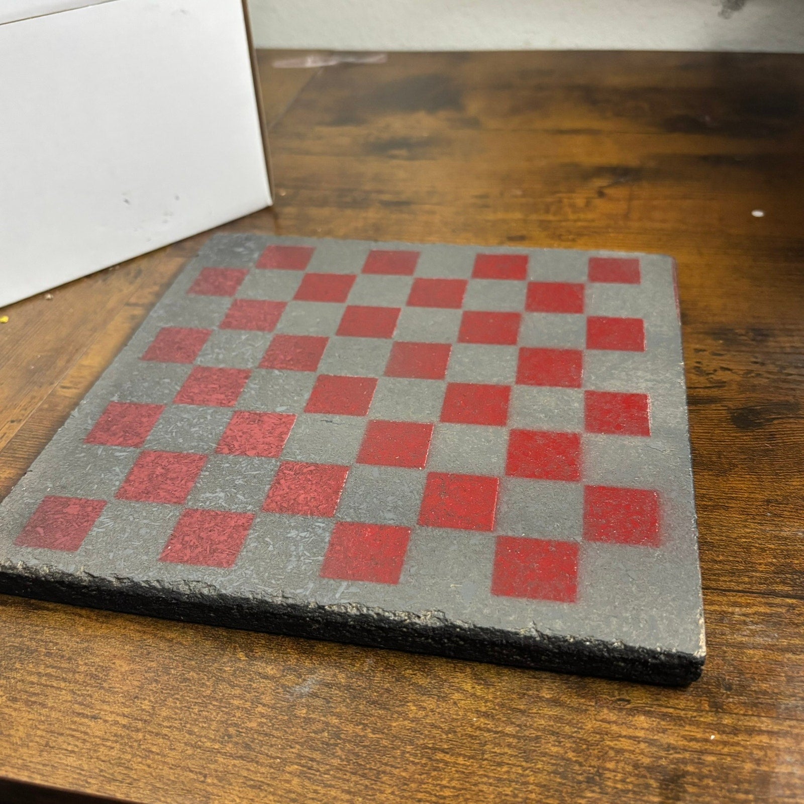 This is a one-of-a-kind, hand-painted chess board that will add a touch of artistry to your game. These are spray painted particle boards and have a double side. One side is painted and the backside is lined with scrapbook paper and has a different design. (The Scrapbook paper part is not meant to be played on but you can!)