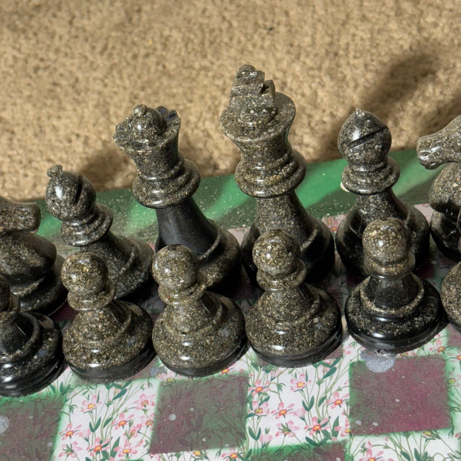 This unique chess set is a one-of-a-kind creation, perfect for chess enthusiasts and collectors! The chess pieces are handmade from resin and mixed with sand rock, giving them a substantial and satisfying weight.